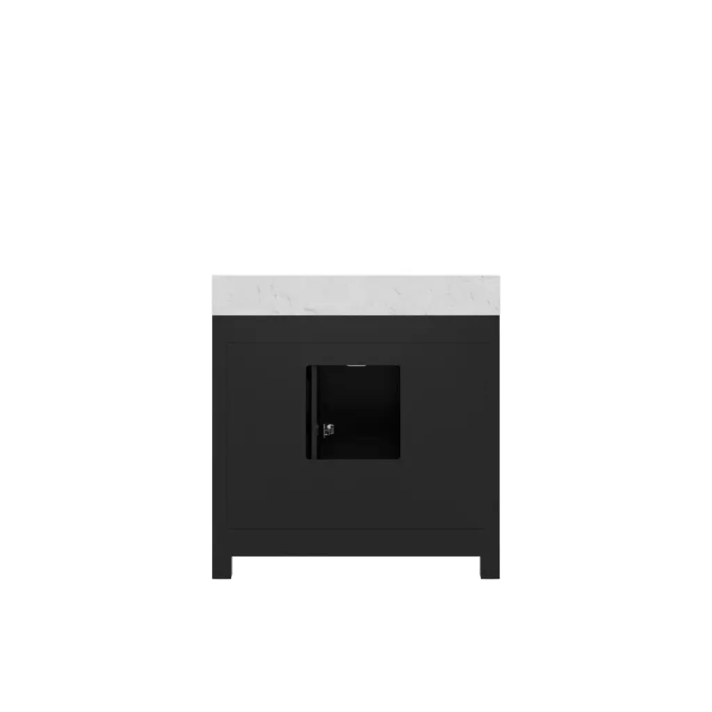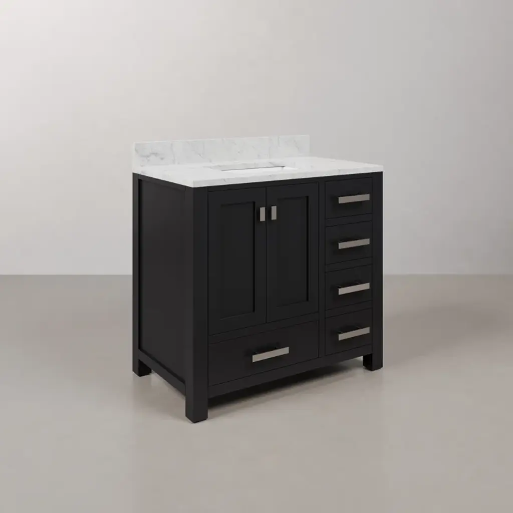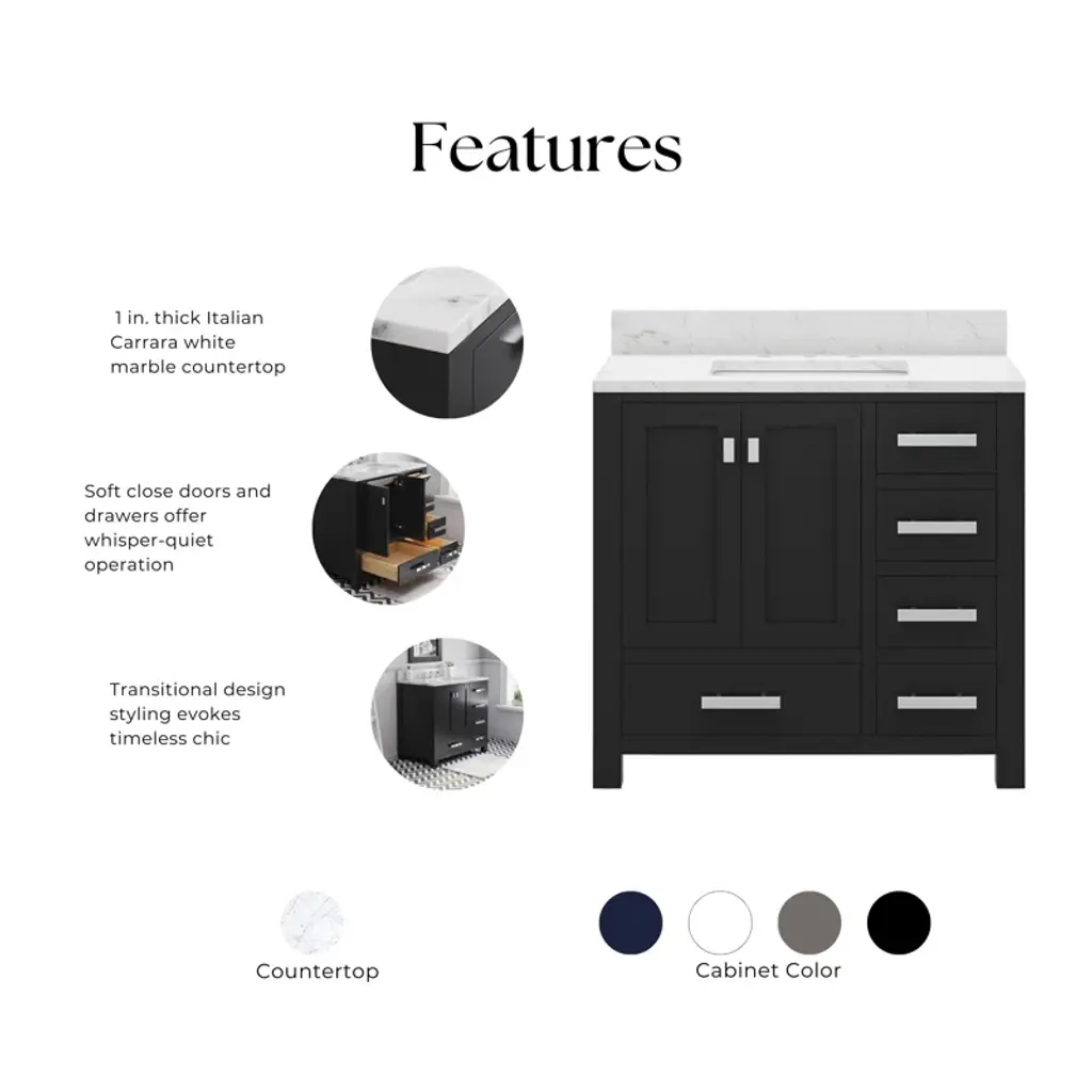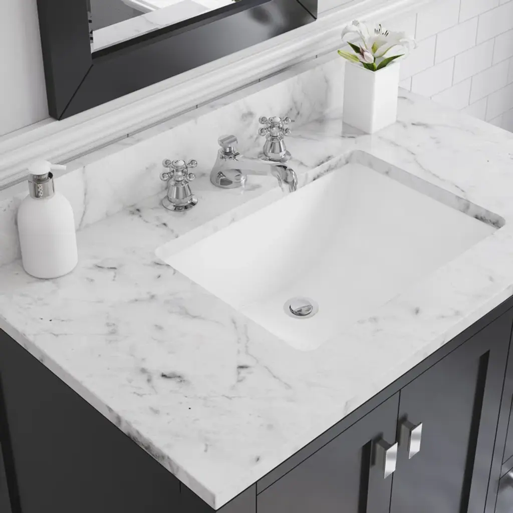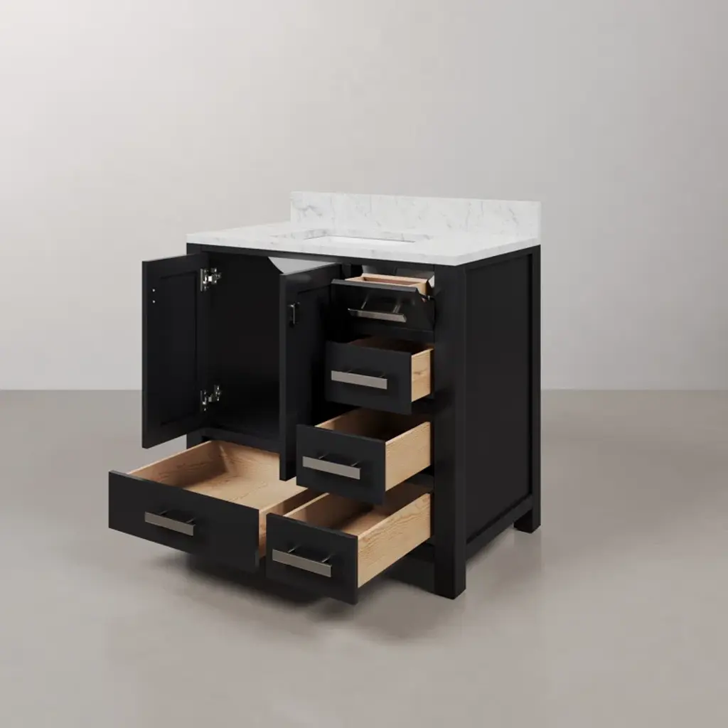 The crossroads of timeless design and innovative modern manufacturing processes merge harmoniously to ensure each vanity's finishes and function are as reliable as their unmistakable beauty. Constructed of 100% hardwood and not particle board, high-class Vanity that is designed to last a lifetime. The marble countertop, ceramic sink, and elegantly crafted doors all lend credence to durability and superior craftsmanship. With the understanding that no one space is alike, all of the vanity designs come in multiple lengths to accommodate any room size. All vanity is made from select hardwoods that have been kiln-dried to ensure a stable product that will not expand, contract, or warp. Using joinery techniques that are made to hold together for a lifetime, all vanity comes fully assembled and includes interior shelving and a large cut-out in the back for plumbing access. All vanities come with solid natural stone countertops that have been sealed at the factory to prevent staining and watermarks. Countertops are pre-drilled for a standard 8" widespread 3-hole lavatory faucet. The backsplash is included.