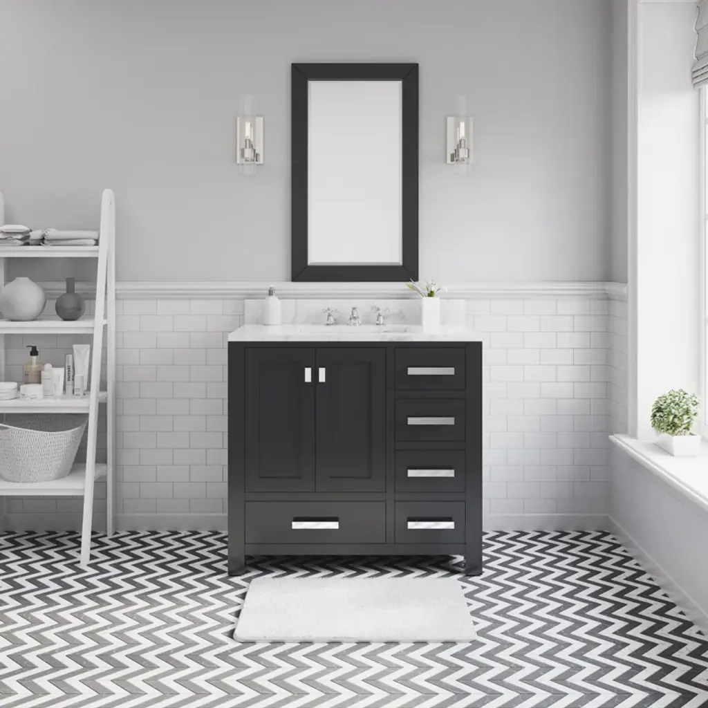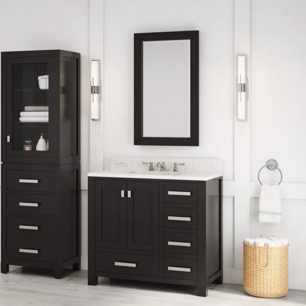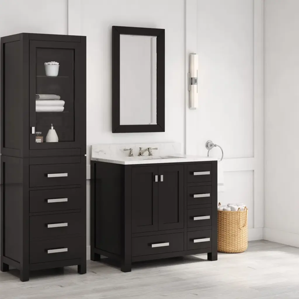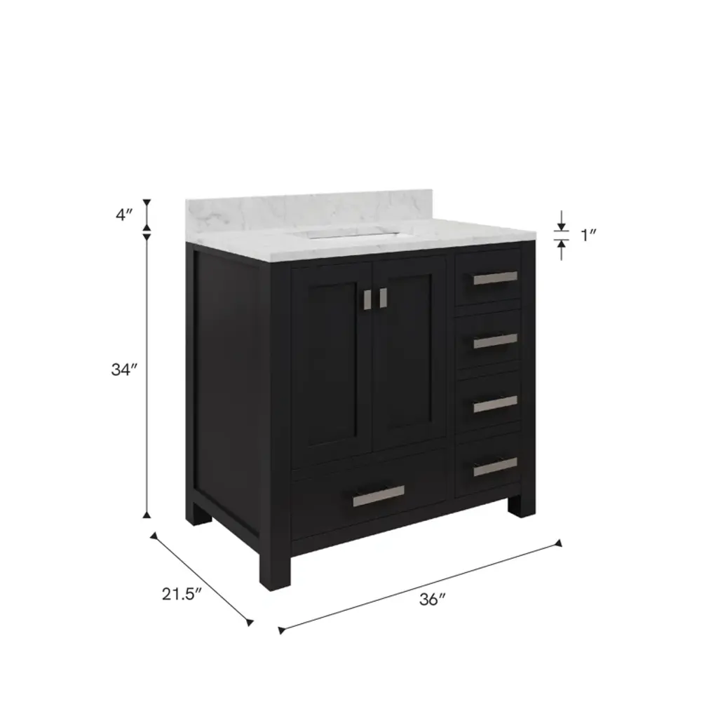 The crossroads of timeless design and innovative modern manufacturing processes merge harmoniously to ensure each vanity's finishes and function are as reliable as their unmistakable beauty. Constructed of 100% hardwood and not particle board, high-class Vanity that is designed to last a lifetime. The marble countertop, ceramic sink, and elegantly crafted doors all lend credence to durability and superior craftsmanship. With the understanding that no one space is alike, all of the vanity designs come in multiple lengths to accommodate any room size. All vanity is made from select hardwoods that have been kiln-dried to ensure a stable product that will not expand, contract, or warp. Using joinery techniques that are made to hold together for a lifetime, all vanity comes fully assembled and includes interior shelving and a large cut-out in the back for plumbing access. All vanities come with solid natural stone countertops that have been sealed at the factory to prevent staining and watermarks. Countertops are pre-drilled for a standard 8" widespread 3-hole lavatory faucet. The backsplash is included.