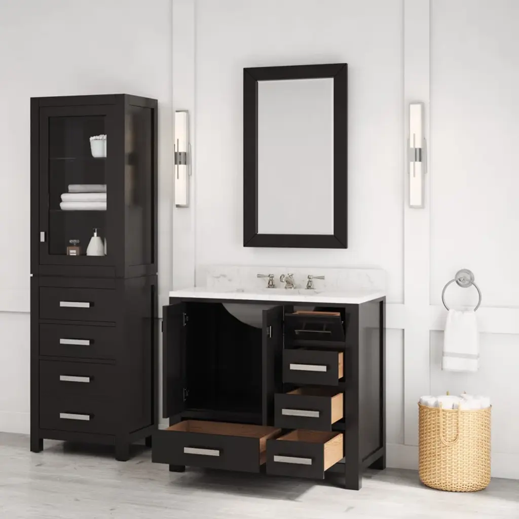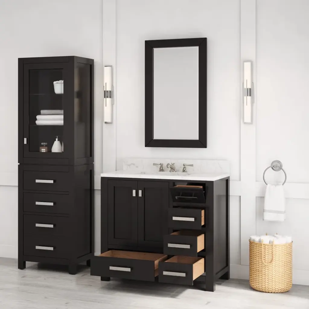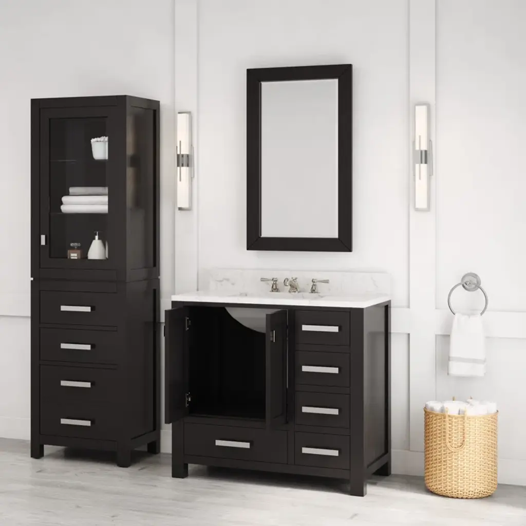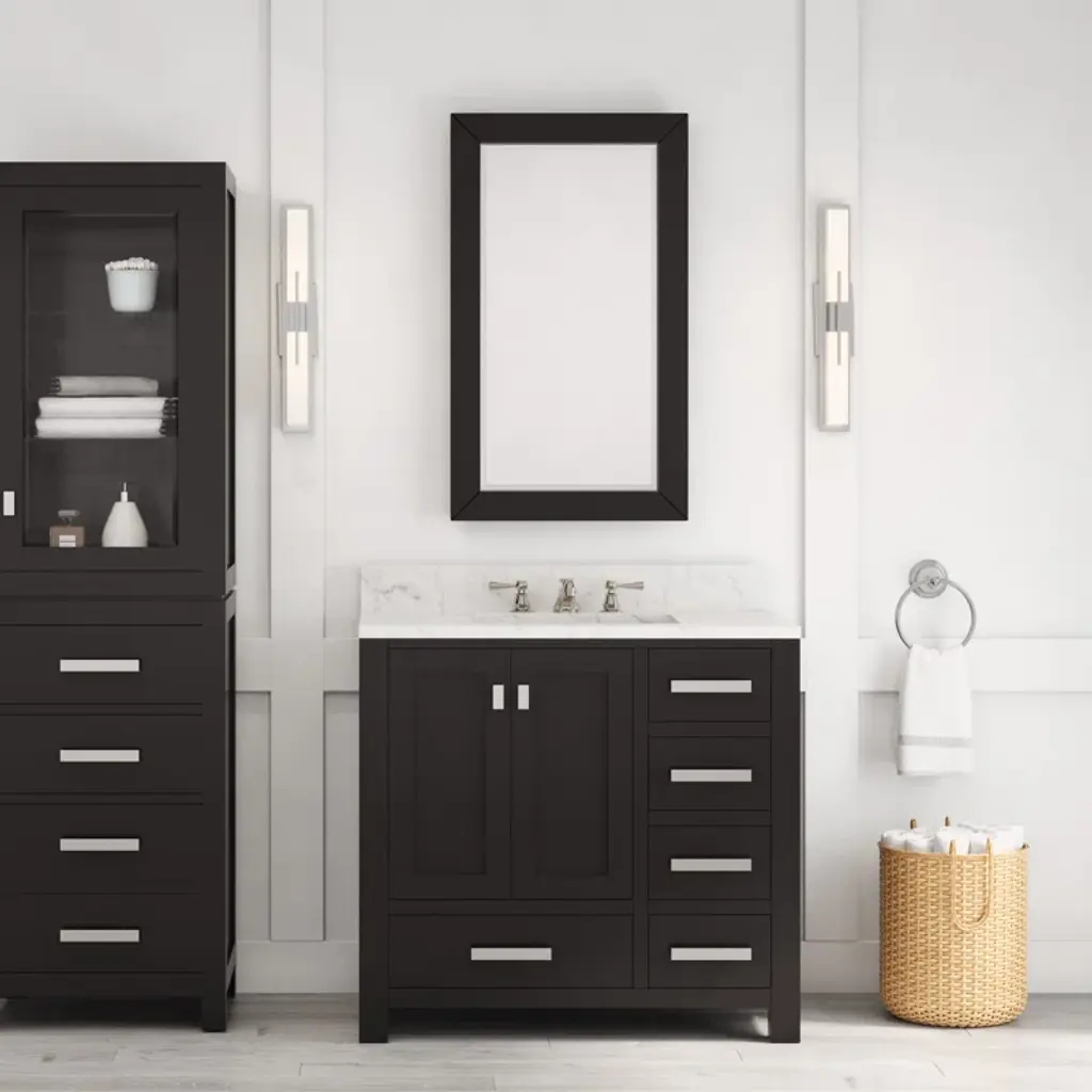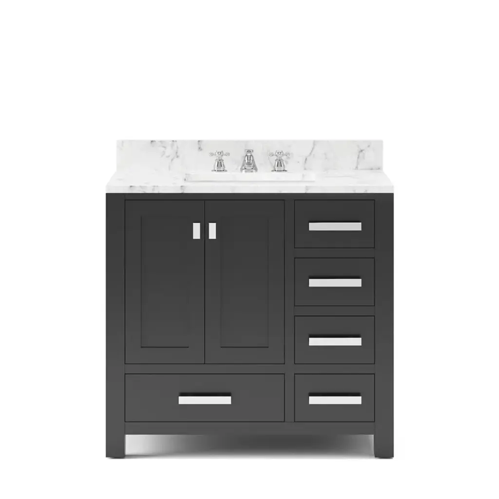 The crossroads of timeless design and innovative modern manufacturing processes merge harmoniously to ensure each vanity's finishes and function are as reliable as their unmistakable beauty. Constructed of 100% hardwood and not particle board, high-class Vanity that is designed to last a lifetime. The marble countertop, ceramic sink, and elegantly crafted doors all lend credence to durability and superior craftsmanship. With the understanding that no one space is alike, all of the vanity designs come in multiple lengths to accommodate any room size. All vanity is made from select hardwoods that have been kiln-dried to ensure a stable product that will not expand, contract, or warp. Using joinery techniques that are made to hold together for a lifetime, all vanity comes fully assembled and includes interior shelving and a large cut-out in the back for plumbing access. All vanities come with solid natural stone countertops that have been sealed at the factory to prevent staining and watermarks. Countertops are pre-drilled for a standard 8" widespread 3-hole lavatory faucet. The backsplash is included.