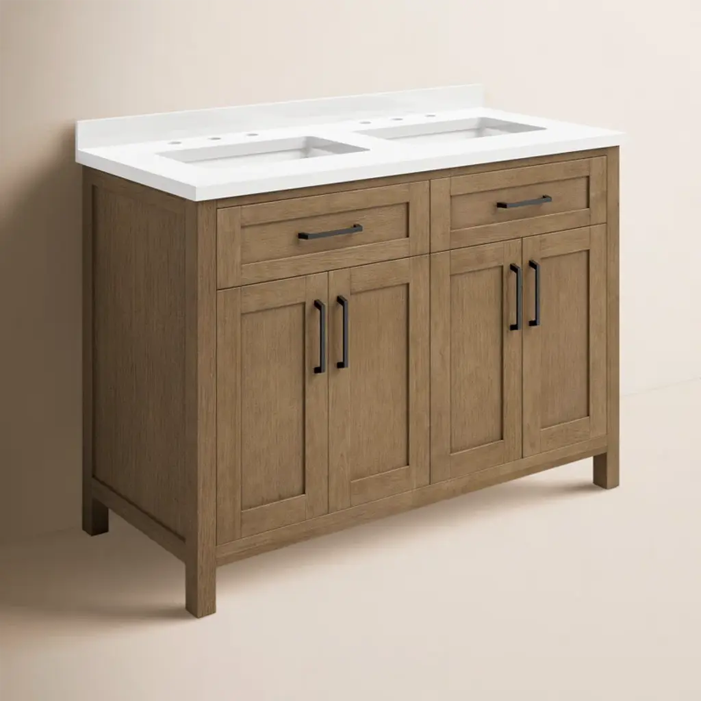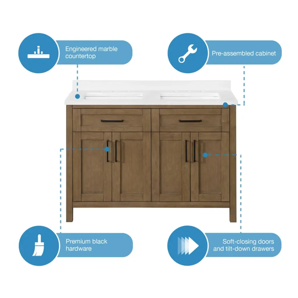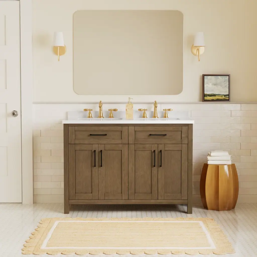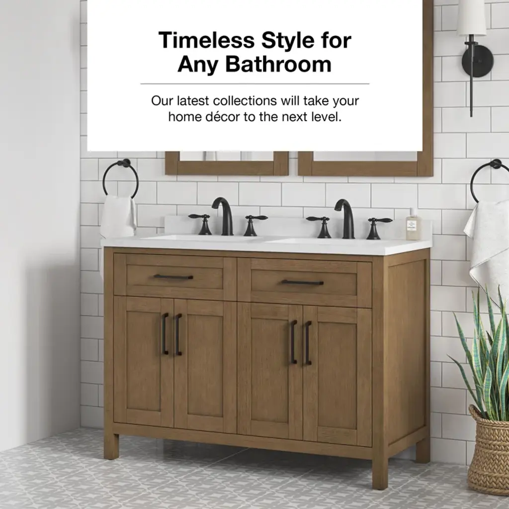 Never let anyone say a smaller bathroom can't have two sinks! The vanity by Ove Decors features double basins and delivers plenty of storage despite its compact footprint. Shaker doors and a sleek engineered marble countertop offer a style refresh that promises to be in fashion for years.
