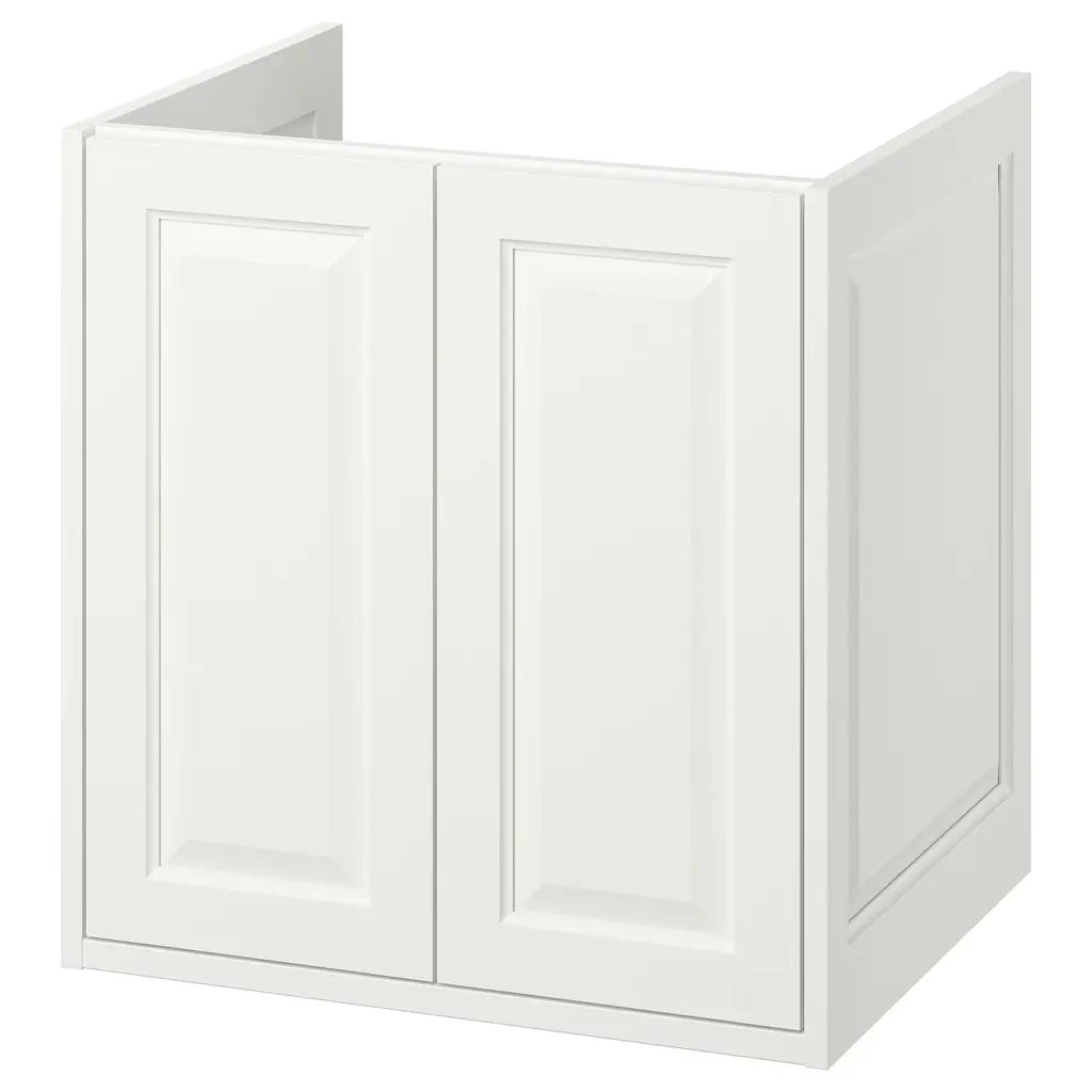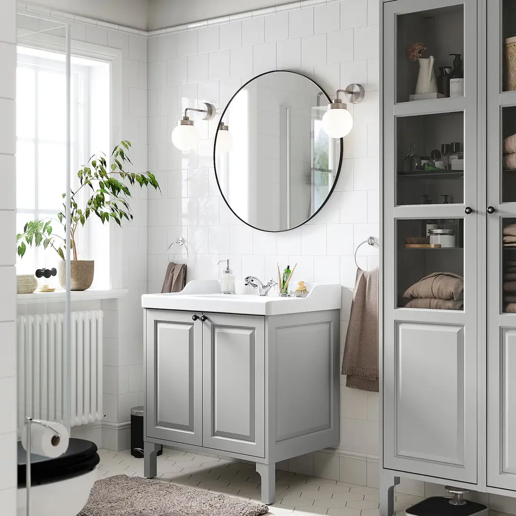 TÄNNFORSEN Bathroom vanity with doors - light gray 30x21x25 1/8 ". Closed storage with capacity for bulkier or taller items, like bottles and baskets, keeping them dust-free and out of sight. Hinges with integrated dampers catch the door and close it slowly, silently and softly.