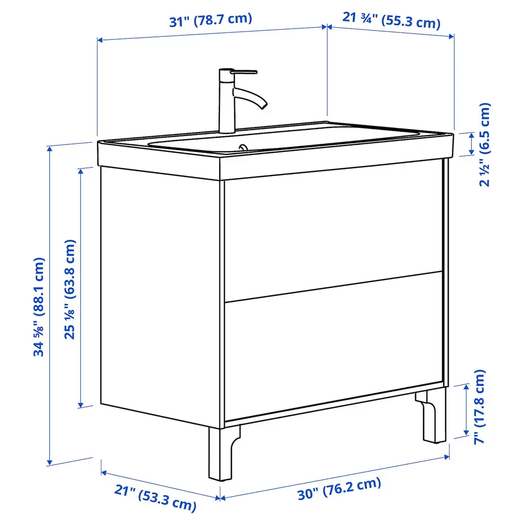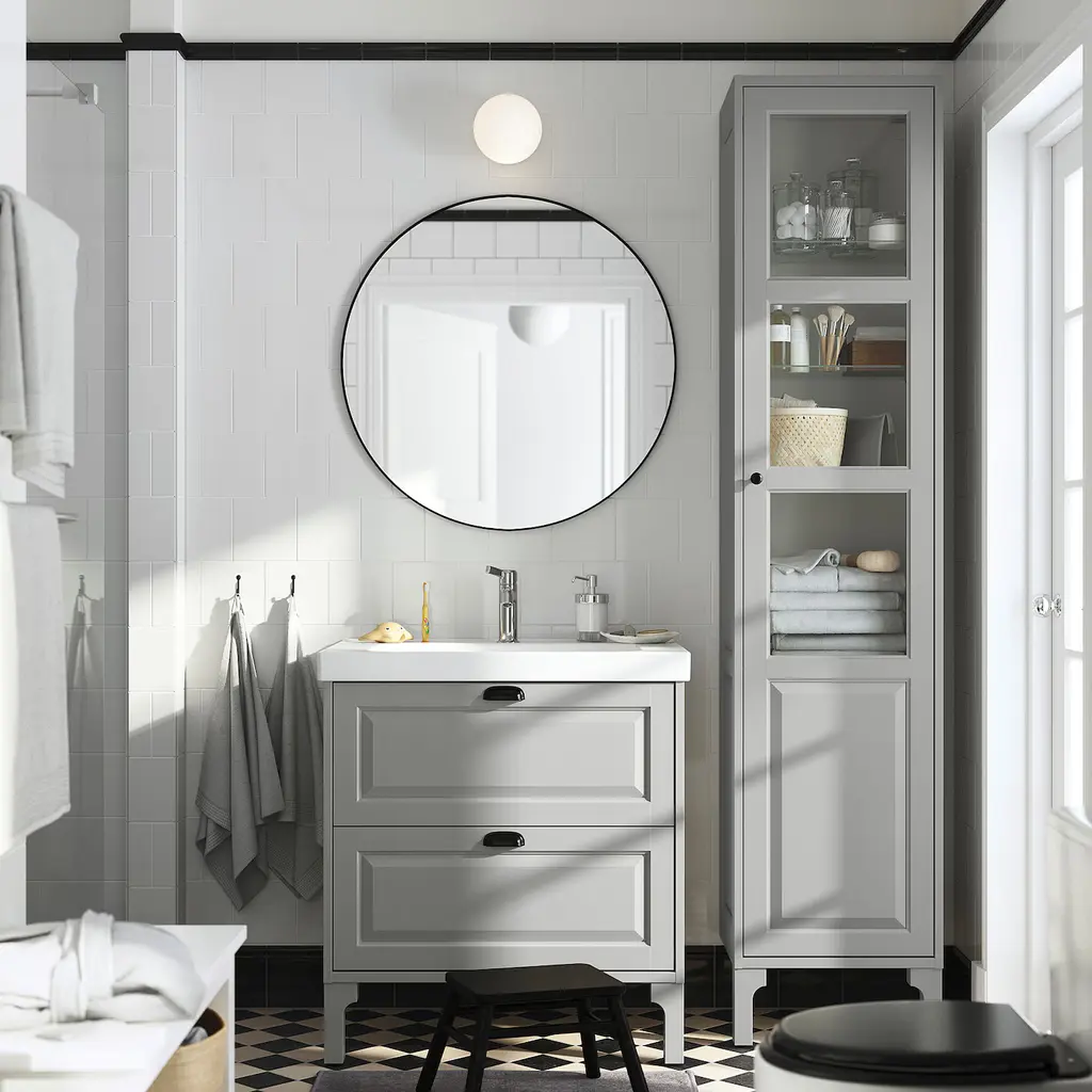 TÄNNFORSEN / ORRSJÖN Bathroom vanity with sink & faucet - light gray 31x21 3/4x34 5/8 ". Generous, full drawer storage capacity for all your essentials as piping is led through the back and not via a cut-out in the drawers. Drawers open all the way for a good overview.
