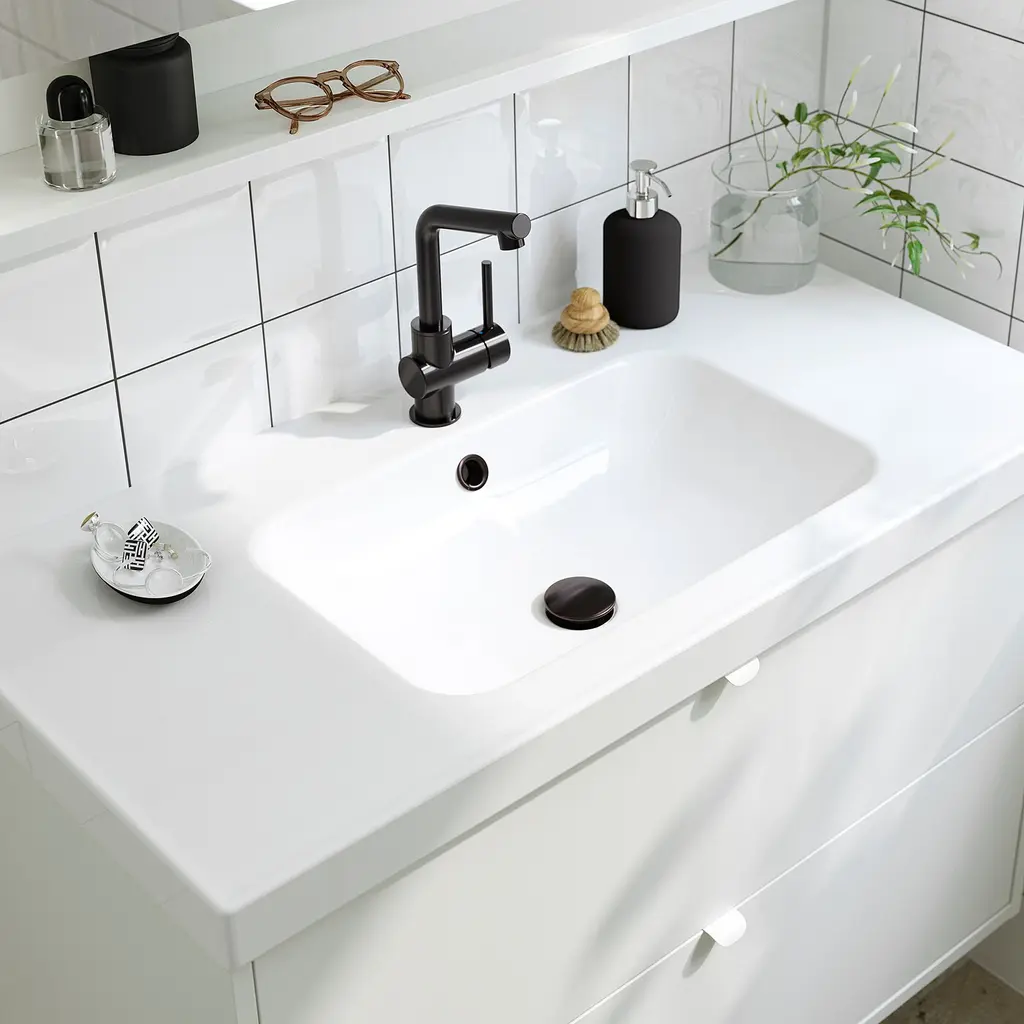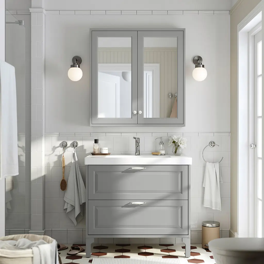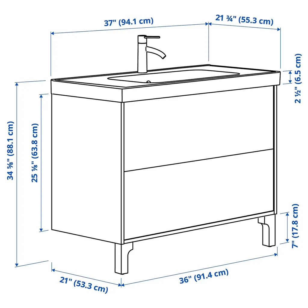 TÄNNFORSEN / ORRSJÖN Bathroom vanity with sink & faucet - light gray 37x21 3/4x34 5/8 ". Generous, full drawer storage capacity for all your essentials as piping is led through the back and not via a cut-out in the drawers. Drawers open all the way for a good overview.