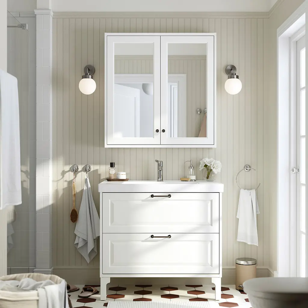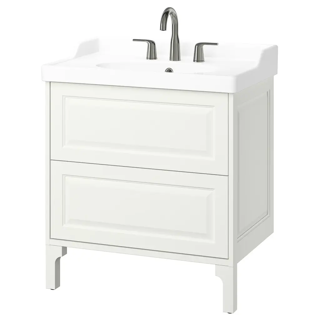 TÄNNFORSEN / ORRSJÖN Bathroom vanity with sink & faucet - white 37x21 3/4x34 5/8 ". Generous, full drawer storage capacity for all your essentials as piping is led through the back and not via a cut-out in the drawers. Drawers open all the way for a good overview. This product bears the CE mark.