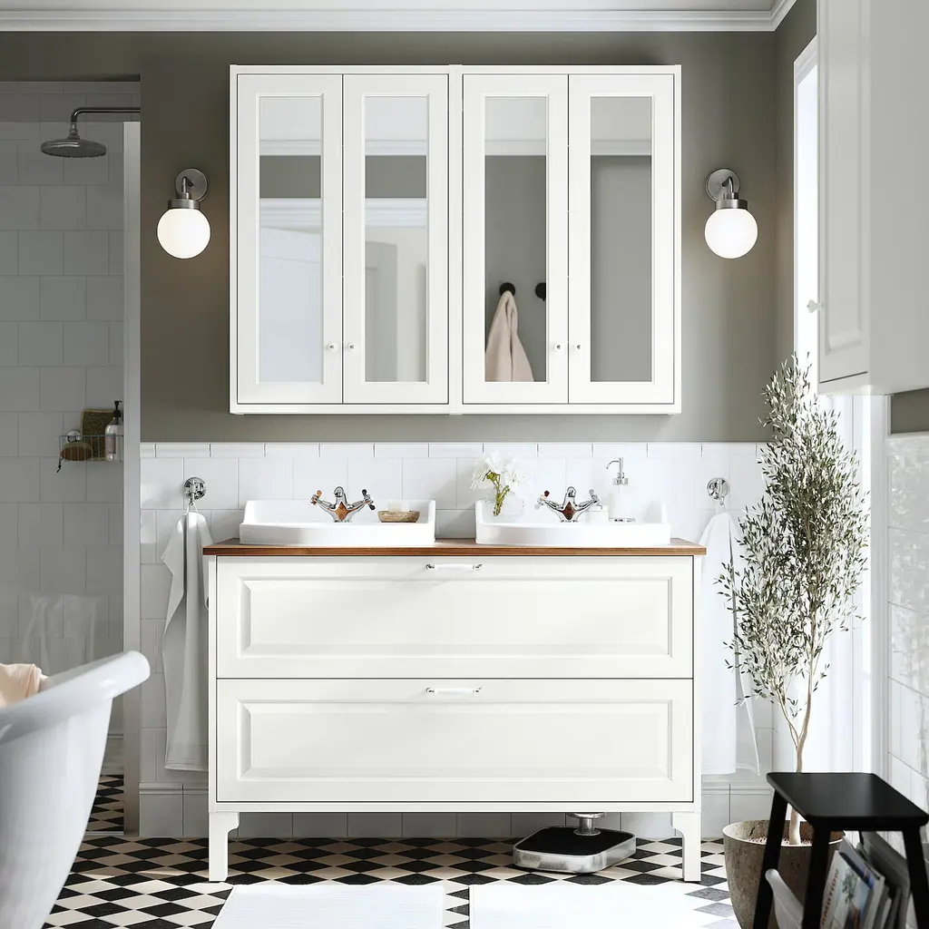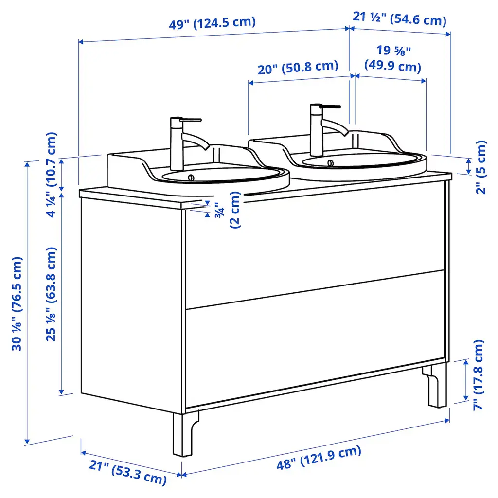 TÄNNFORSEN / RUTSJÖN Bathroom vanity with sink & faucets - white/brown walnut effect 49x21 1/2x30 1/8 ". Generous, full drawer storage capacity for all your essentials as piping is led through the back and not via a cut-out in the drawers. Drawers open all the way for a good overview.
