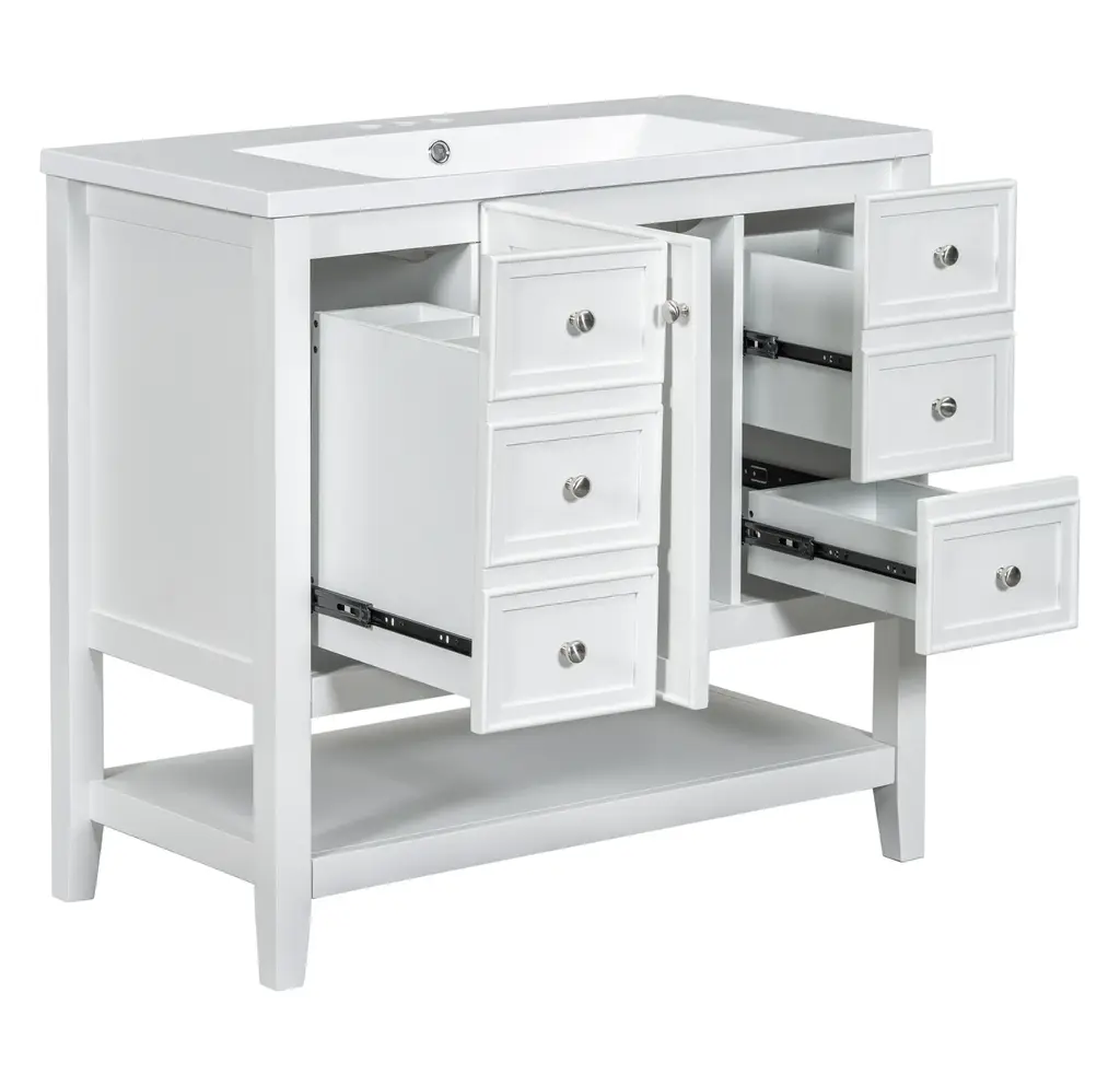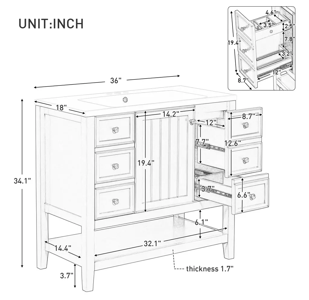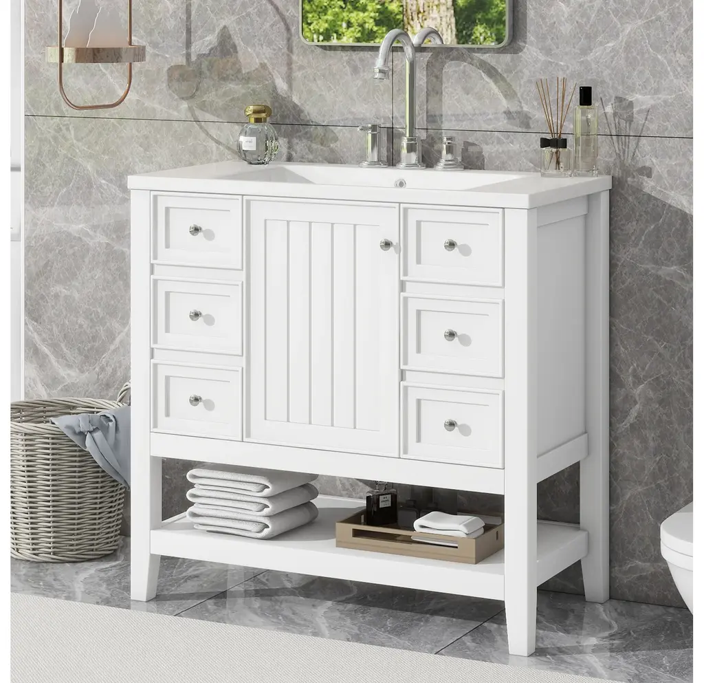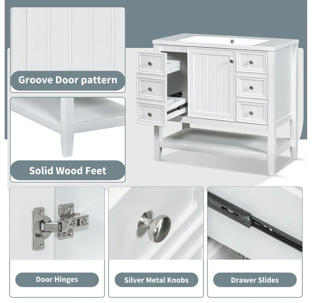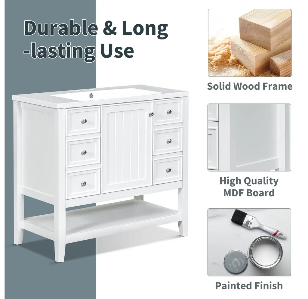 36" Bathroom Vanity with Sink Combo, One Cabinet and Three Drawers, Solid Wood and MDF BoardProduct FeaturesMaterial - Practicality and durability is important to bathroom facilities, so we use real wood and MDF boards for this product, which not only increases the product stability but also ensures a long-lasting use. Furthermore, the surface of this vanity cabinet is in painted finish. It is water-proof, stain proof and very easy to clean.Ceramic Sink - The elegant white ceramic sink with rounded basin is equipped with an integrated overflow and three hole faucet mount. Half-moon shaped design ceramic sink extends boundary almost to the edge to make a large sink. Ceramic is so easy to clean that you can keep it smooth and shinning effortlessly. 4 " centerset faucet will fit this sink (not included).Vanity with Cabinet & Drawers & Shelf - Considering the humid environment in bathroom, this bathroom vanity has ample enclosed storage spaces: one cabinet with door, one functional drawer on the left and two drawers on the right with slide rails, and lower open shelf. You can put soaps, towels, shampoos, tissue paper and other bathroom essentials in it so to keep them away from dust.Multi-Functional Drawer Divider - The panels in the left drawers can be removed or installed to different place as you like. All in all, the reasonable distribution of the whole vanity offers variety functions to meet the different requirements in daily life.Assembly Required - This bathroom vanity, needs assembly, has two packs, one for the sink and the other for the cabinet. All the hardware(screws, metal door hinges and handles, drawer slides, anti-toppling device etc.) and instruction manual are provided. You can install it according to the instruction easily.Product Dimensions&WeightsOverall Product:36"L x 18"W x 34.1"H (102.95lbs)Cabinet Base:35.50"L x 18.00"W x 32.90"H (74.95lbs)Sink Top:36.00"L x 18.03"W x 6.61"H (28lbs)Package Dimension:1:36.22"L x 21.26"W x 12.4"H 82.89 lbs.2:41.73"L x 24.49"W x 9.65"H 35.05 lbs.More InformationMaterial:Solid Poplar/Rubber Wood + MDF Board + CeramicShape:RectangularStyle:ModernFinish:Painted FinishMounting Type:FreestandingNumber of Sinks:Single SinkSink Type:Undermount; Drop-InSink Location:CenterVanity Top Edge Type:FlatEdge Thickness:0.98"Faucet Mount:4"(not included)Number of Doors:1Number of Drawers:3Adjustable Shelf:YesCapacity:200lbsHardware Included:YesAssembly:Assembly RequiredCountry of Origin:VietnamNotes:Manual measurement has been used, there may be some reasonable error.All the pictures are taken by actual samples, slight chromatic aberration may occur due to lighting or display.