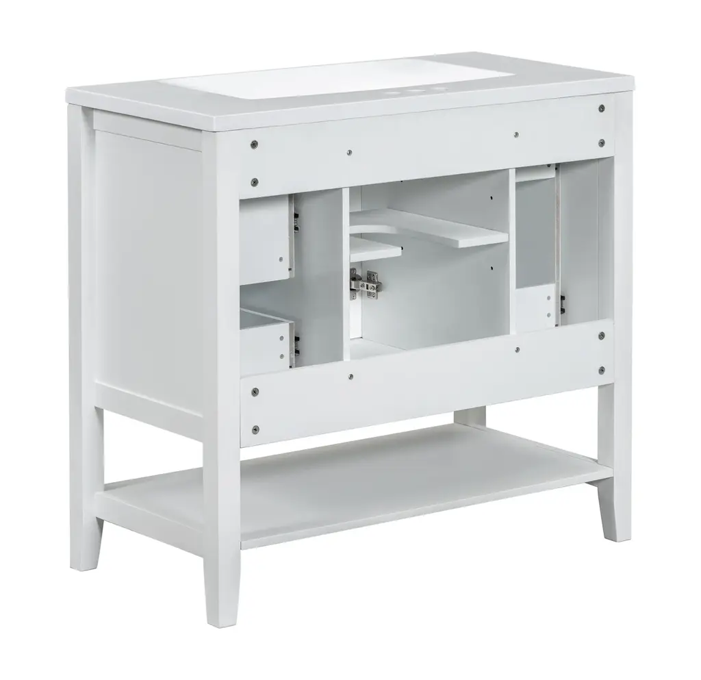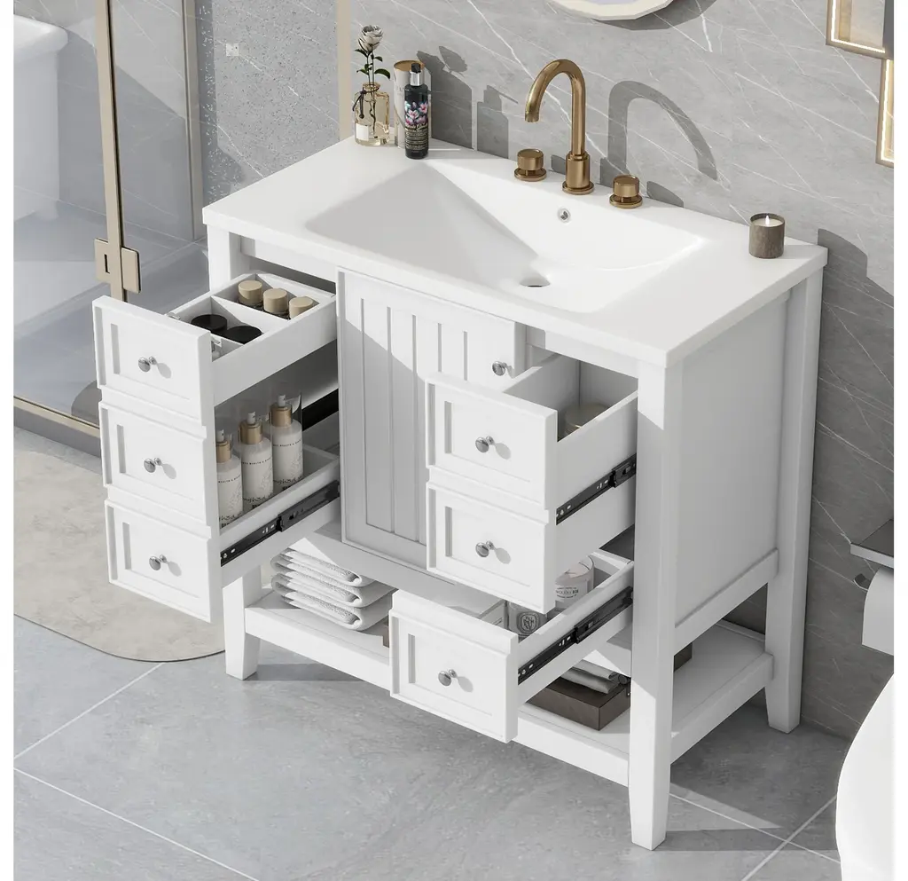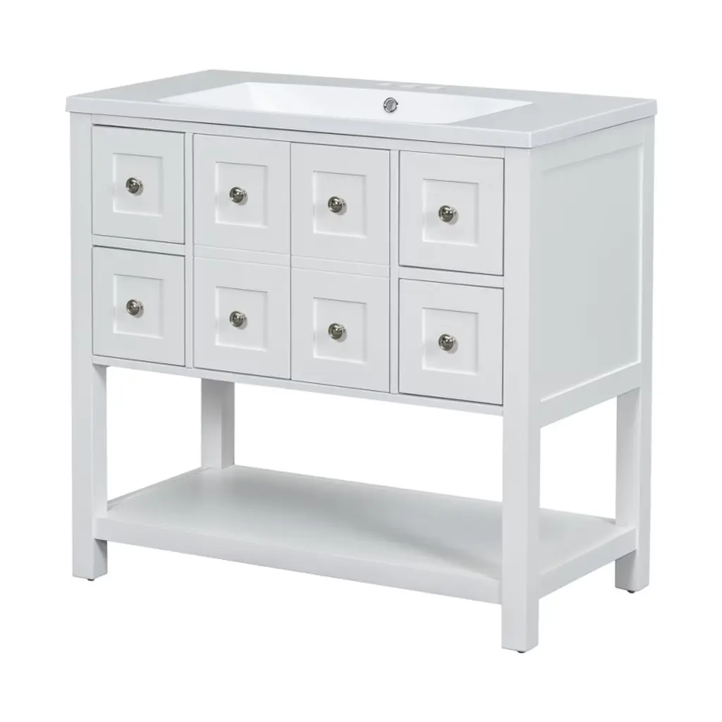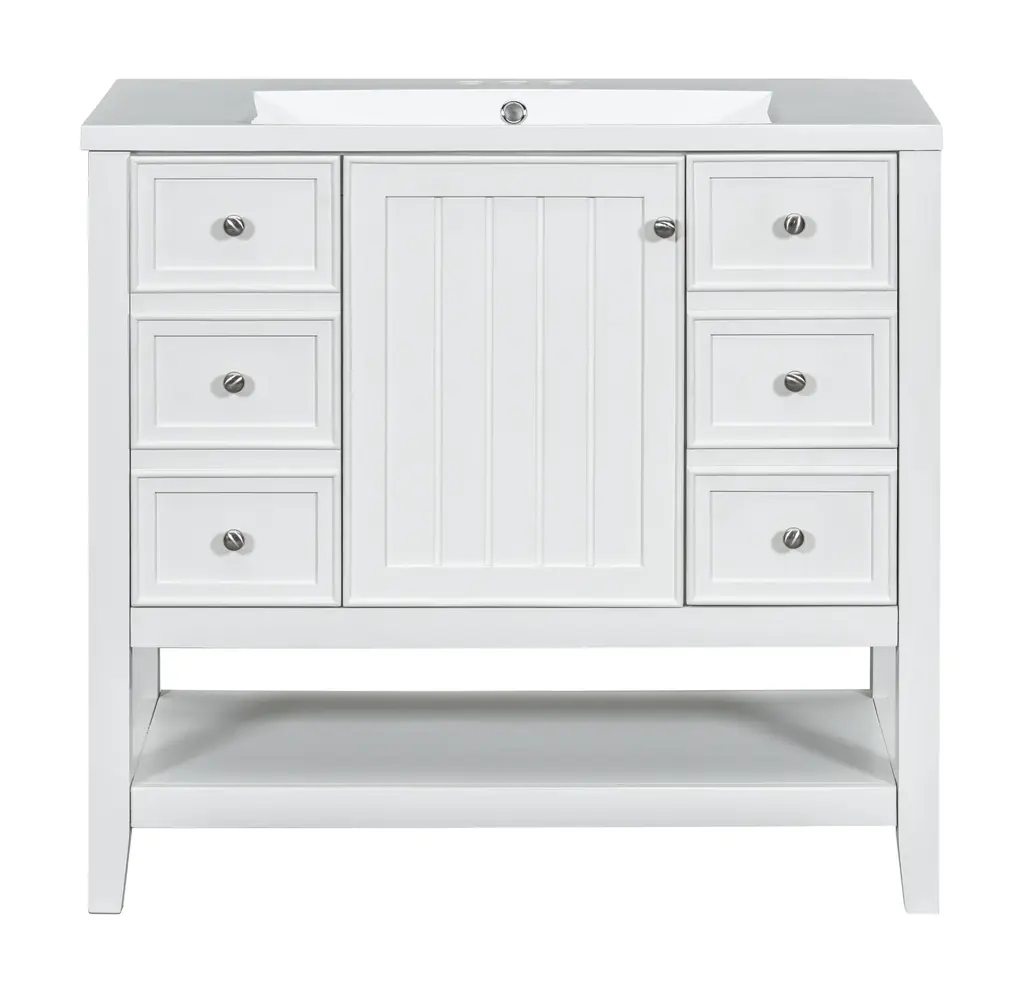 36" Bathroom Vanity with Sink Combo, One Cabinet and Three Drawers, Solid Wood and MDF BoardProduct FeaturesMaterial - Practicality and durability is important to bathroom facilities, so we use real wood and MDF boards for this product, which not only increases the product stability but also ensures a long-lasting use. Furthermore, the surface of this vanity cabinet is in painted finish. It is water-proof, stain proof and very easy to clean.Ceramic Sink - The elegant white ceramic sink with rounded basin is equipped with an integrated overflow and three hole faucet mount. Half-moon shaped design ceramic sink extends boundary almost to the edge to make a large sink. Ceramic is so easy to clean that you can keep it smooth and shinning effortlessly. 4 " centerset faucet will fit this sink (not included).Vanity with Cabinet & Drawers & Shelf - Considering the humid environment in bathroom, this bathroom vanity has ample enclosed storage spaces: one cabinet with door, one functional drawer on the left and two drawers on the right with slide rails, and lower open shelf. You can put soaps, towels, shampoos, tissue paper and other bathroom essentials in it so to keep them away from dust.Multi-Functional Drawer Divider - The panels in the left drawers can be removed or installed to different place as you like. All in all, the reasonable distribution of the whole vanity offers variety functions to meet the different requirements in daily life.Assembly Required - This bathroom vanity, needs assembly, has two packs, one for the sink and the other for the cabinet. All the hardware(screws, metal door hinges and handles, drawer slides, anti-toppling device etc.) and instruction manual are provided. You can install it according to the instruction easily.Product Dimensions&WeightsOverall Product:36"L x 18"W x 34.1"H (102.95lbs)Cabinet Base:35.50"L x 18.00"W x 32.90"H (74.95lbs)Sink Top:36.00"L x 18.03"W x 6.61"H (28lbs)Package Dimension:1:36.22"L x 21.26"W x 12.4"H 82.89 lbs.2:41.73"L x 24.49"W x 9.65"H 35.05 lbs.More InformationMaterial:Solid Poplar/Rubber Wood + MDF Board + CeramicShape:RectangularStyle:ModernFinish:Painted FinishMounting Type:FreestandingNumber of Sinks:Single SinkSink Type:Undermount; Drop-InSink Location:CenterVanity Top Edge Type:FlatEdge Thickness:0.98"Faucet Mount:4"(not included)Number of Doors:1Number of Drawers:3Adjustable Shelf:YesCapacity:200lbsHardware Included:YesAssembly:Assembly RequiredCountry of Origin:VietnamNotes:Manual measurement has been used, there may be some reasonable error.All the pictures are taken by actual samples, slight chromatic aberration may occur due to lighting or display.