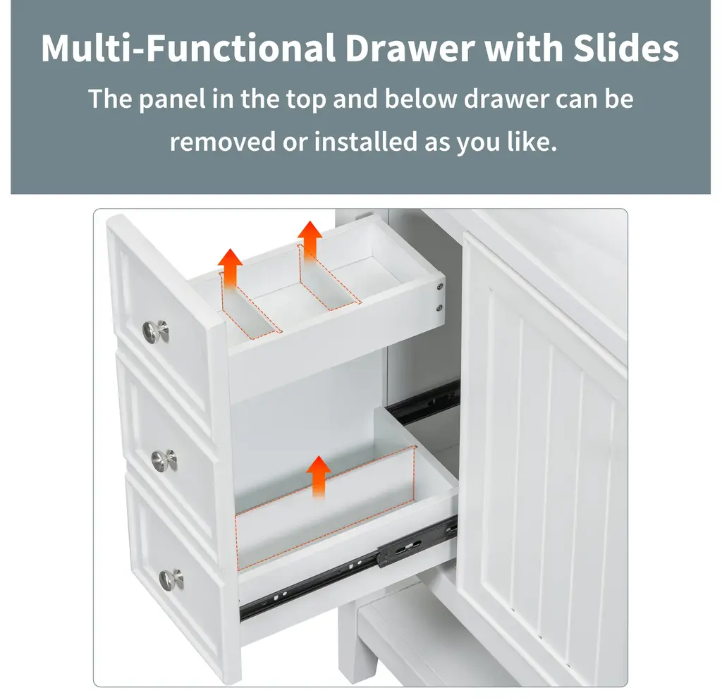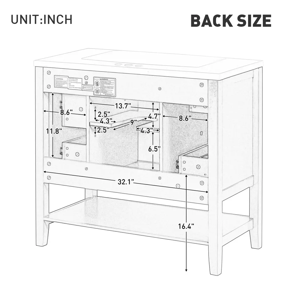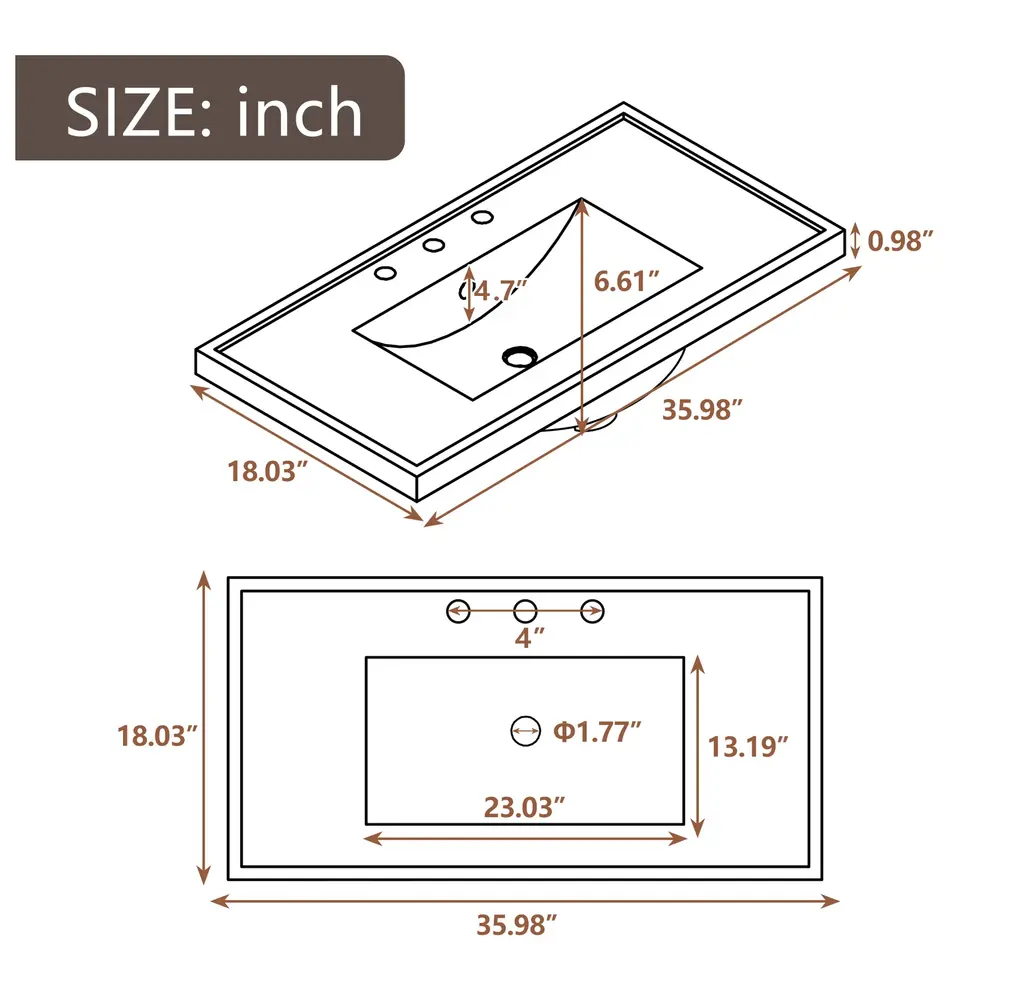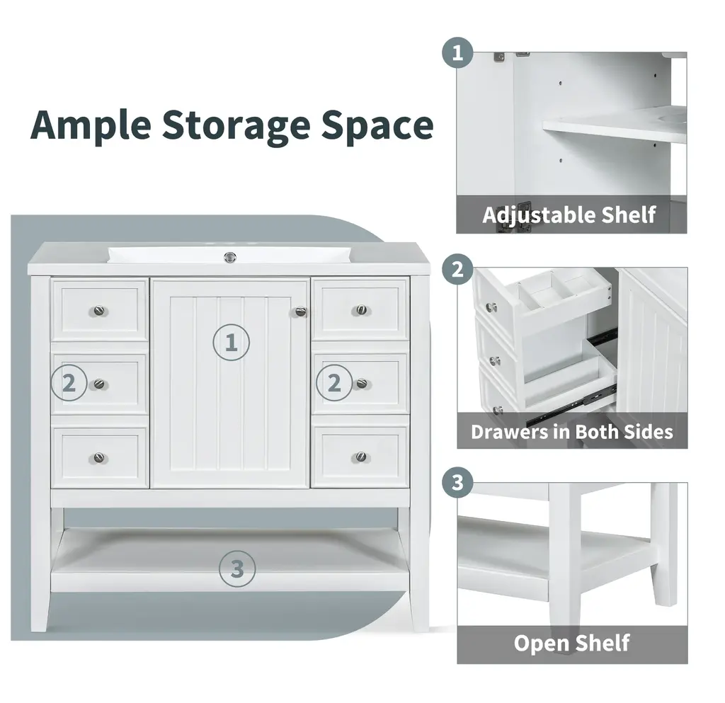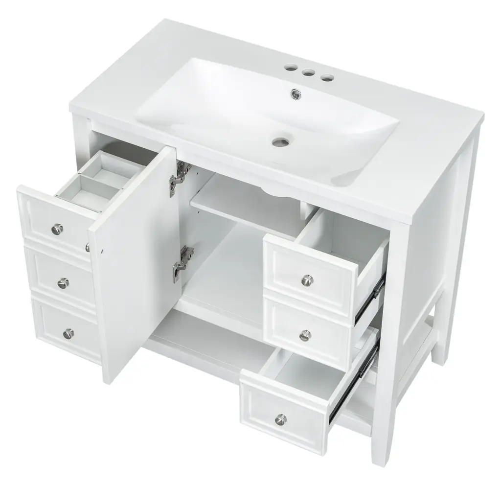 36" Bathroom Vanity with Sink Combo, One Cabinet and Three Drawers, Solid Wood and MDF BoardProduct FeaturesMaterial - Practicality and durability is important to bathroom facilities, so we use real wood and MDF boards for this product, which not only increases the product stability but also ensures a long-lasting use. Furthermore, the surface of this vanity cabinet is in painted finish. It is water-proof, stain proof and very easy to clean.Ceramic Sink - The elegant white ceramic sink with rounded basin is equipped with an integrated overflow and three hole faucet mount. Half-moon shaped design ceramic sink extends boundary almost to the edge to make a large sink. Ceramic is so easy to clean that you can keep it smooth and shinning effortlessly. 4 " centerset faucet will fit this sink (not included).Vanity with Cabinet & Drawers & Shelf - Considering the humid environment in bathroom, this bathroom vanity has ample enclosed storage spaces: one cabinet with door, one functional drawer on the left and two drawers on the right with slide rails, and lower open shelf. You can put soaps, towels, shampoos, tissue paper and other bathroom essentials in it so to keep them away from dust.Multi-Functional Drawer Divider - The panels in the left drawers can be removed or installed to different place as you like. All in all, the reasonable distribution of the whole vanity offers variety functions to meet the different requirements in daily life.Assembly Required - This bathroom vanity, needs assembly, has two packs, one for the sink and the other for the cabinet. All the hardware(screws, metal door hinges and handles, drawer slides, anti-toppling device etc.) and instruction manual are provided. You can install it according to the instruction easily.Product Dimensions&WeightsOverall Product:36"L x 18"W x 34.1"H (102.95lbs)Cabinet Base:35.50"L x 18.00"W x 32.90"H (74.95lbs)Sink Top:36.00"L x 18.03"W x 6.61"H (28lbs)Package Dimension:1:36.22"L x 21.26"W x 12.4"H 82.89 lbs.2:41.73"L x 24.49"W x 9.65"H 35.05 lbs.More InformationMaterial:Solid Poplar/Rubber Wood + MDF Board + CeramicShape:RectangularStyle:ModernFinish:Painted FinishMounting Type:FreestandingNumber of Sinks:Single SinkSink Type:Undermount; Drop-InSink Location:CenterVanity Top Edge Type:FlatEdge Thickness:0.98"Faucet Mount:4"(not included)Number of Doors:1Number of Drawers:3Adjustable Shelf:YesCapacity:200lbsHardware Included:YesAssembly:Assembly RequiredCountry of Origin:VietnamNotes:Manual measurement has been used, there may be some reasonable error.All the pictures are taken by actual samples, slight chromatic aberration may occur due to lighting or display.
