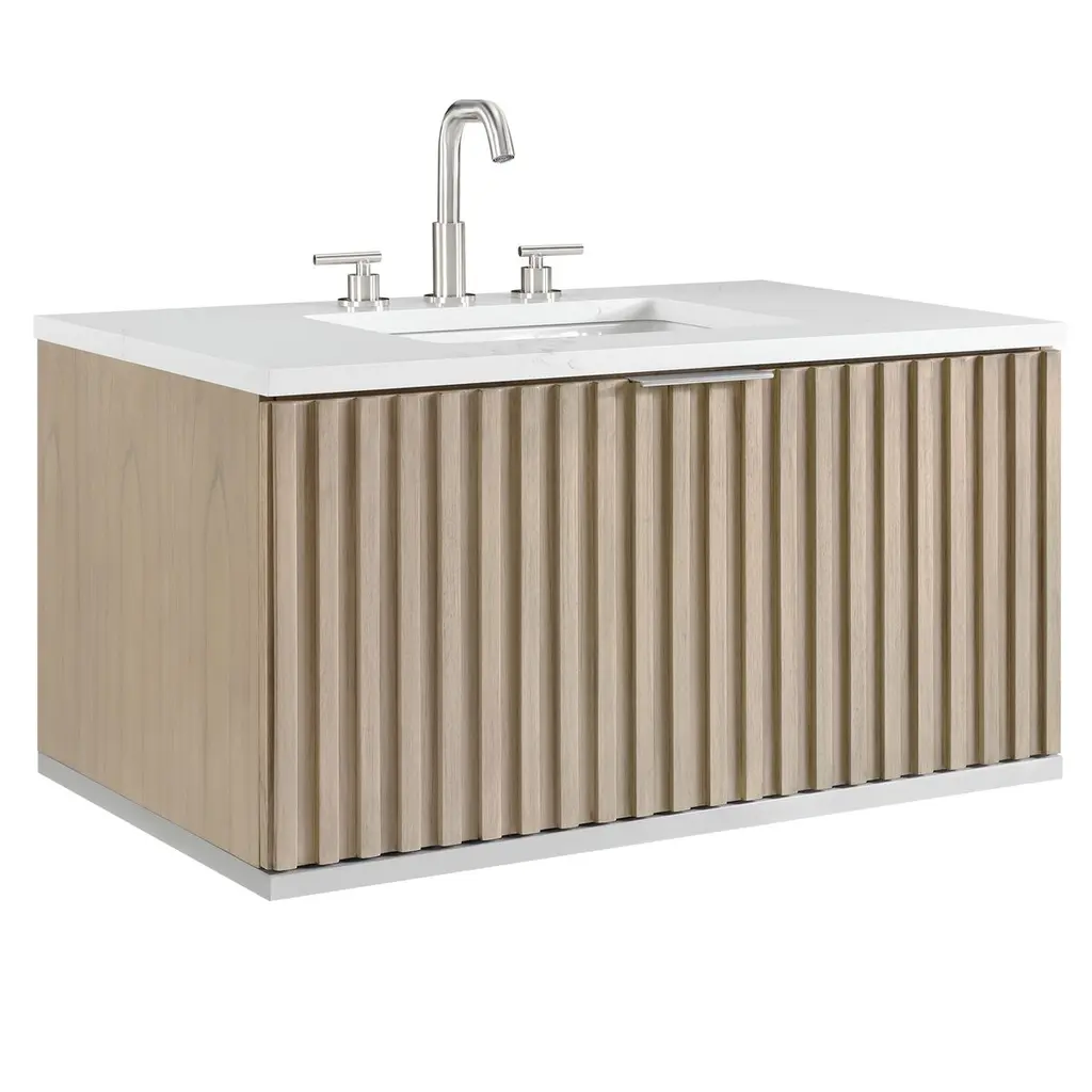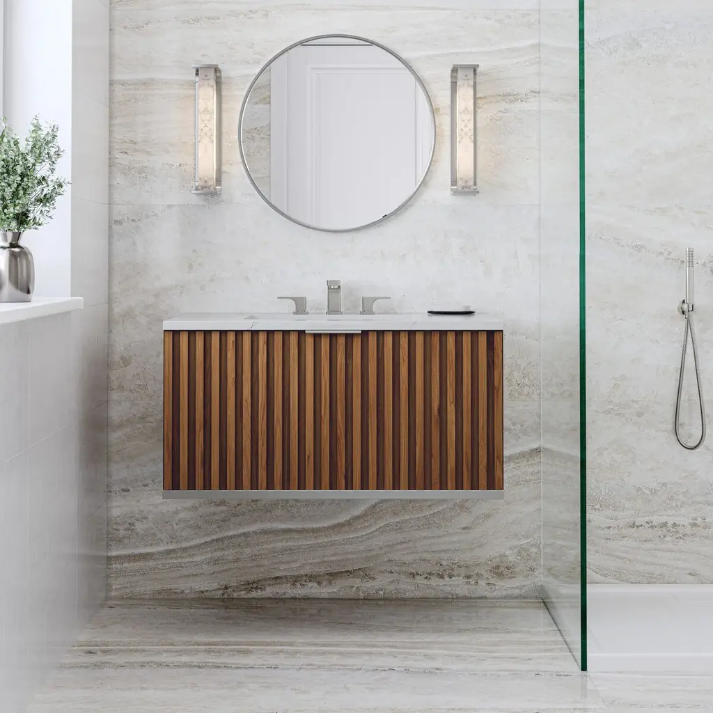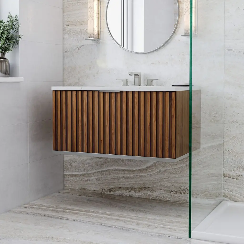 The Terra Floating Bathroom Vanity is a masterpiece of modern design, featuring a uniquely fluted facade that adds a sleek and bold aesthetic to any bathroom. Its architectural metal frame is meticulously crafted, offering a choice of finishes to suit your style. Designed with functionality in mind, the floor models include a handsome, durable, and integrated storage shelf. The vanity boasts deep soft-close and interior pullout drawers, complemented by a matching finish for an easy-to-clean environment. Premium Blum glides ensure effortless motion, while dovetailed joints provide seamless joinery. Complete the unified look with your choice of a smooth Italian Carrara marble, Calacatta Quartz, or Pure White Quartz top. This vanity is not just a piece of furniture; it's a statement of elegance and practicality. (Faucet not included)