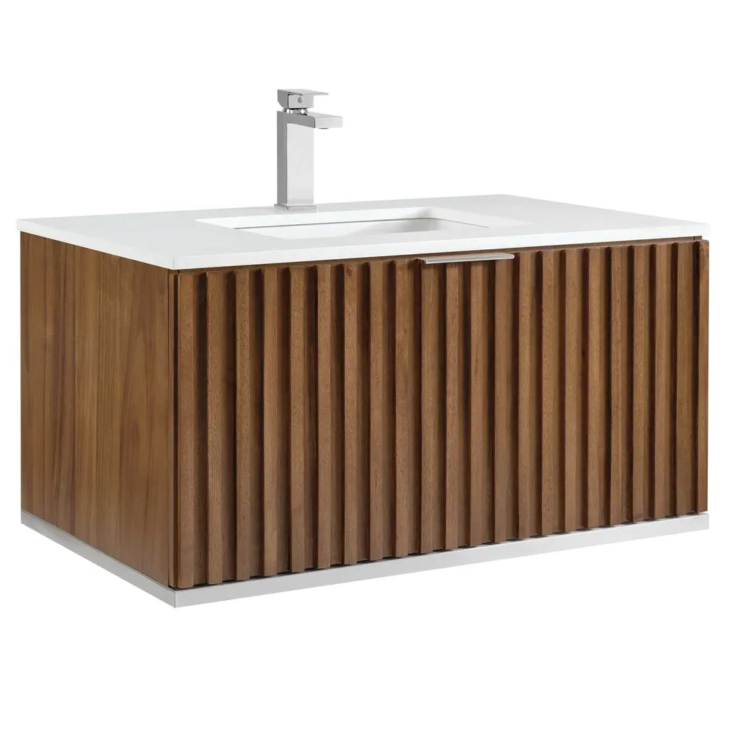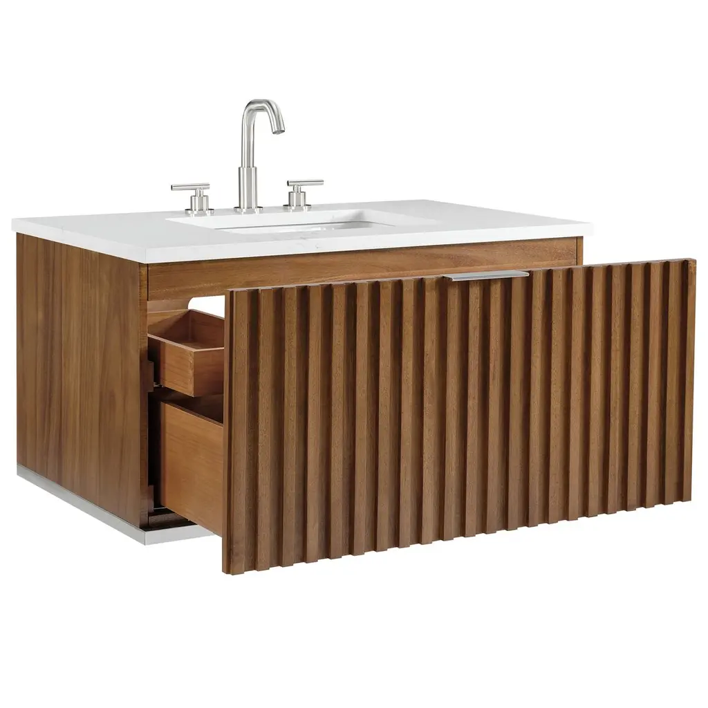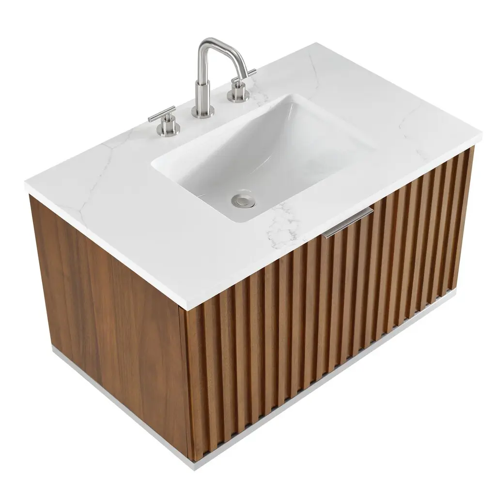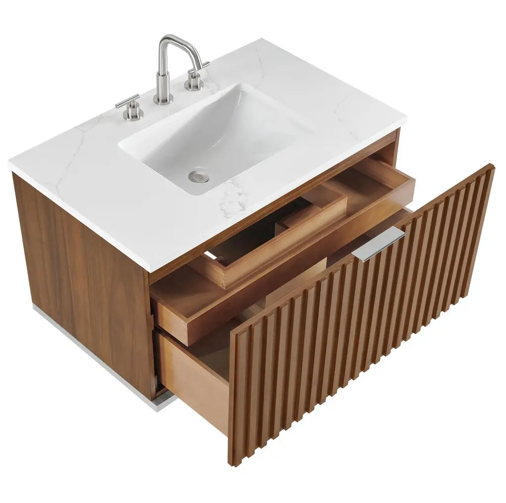 The Terra Floating Bathroom Vanity is a masterpiece of modern design, featuring a uniquely fluted facade that adds a sleek and bold aesthetic to any bathroom. Its architectural metal frame is meticulously crafted, offering a choice of finishes to suit your style. Designed with functionality in mind, the floor models include a handsome, durable, and integrated storage shelf. The vanity boasts deep soft-close and interior pullout drawers, complemented by a matching finish for an easy-to-clean environment. Premium Blum glides ensure effortless motion, while dovetailed joints provide seamless joinery. Complete the unified look with your choice of a smooth Italian Carrara marble, Calacatta Quartz, or Pure White Quartz top. This vanity is not just a piece of furniture; it's a statement of elegance and practicality. (Faucet not included)