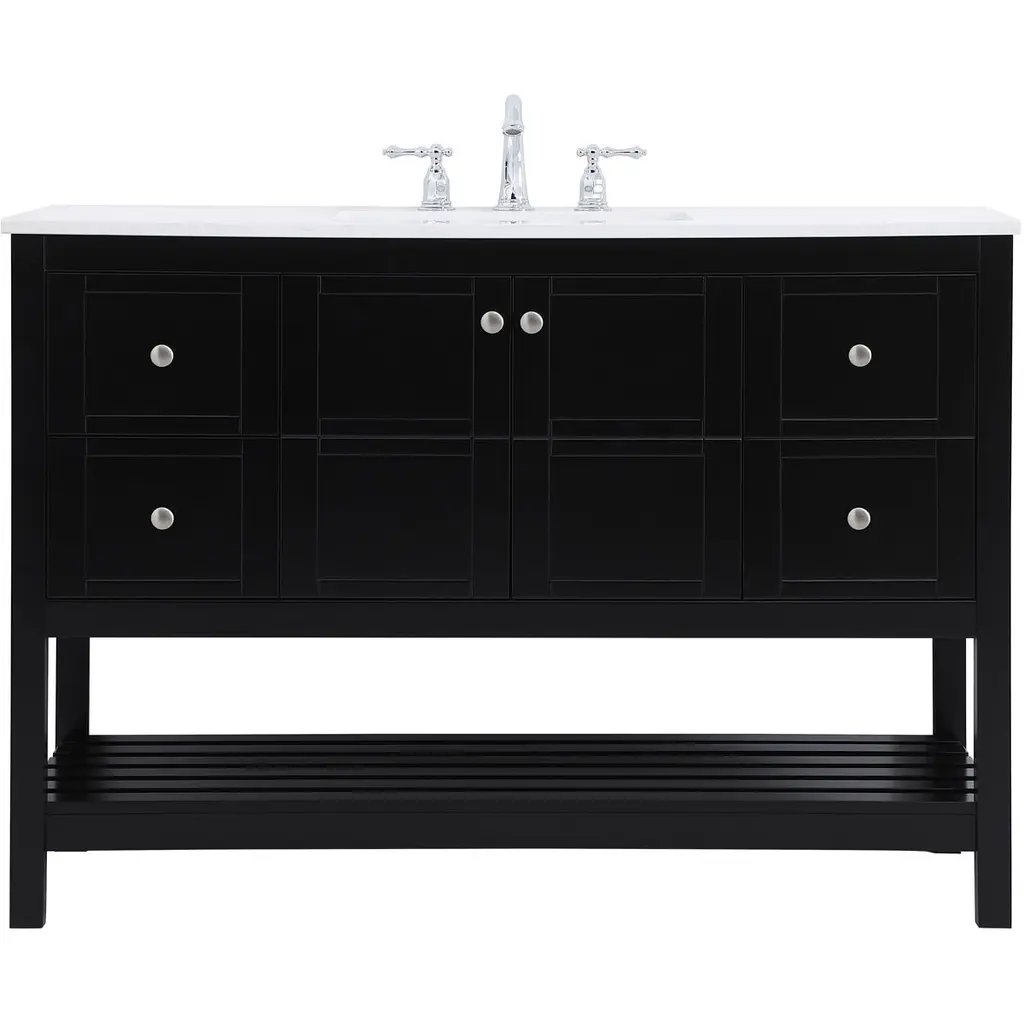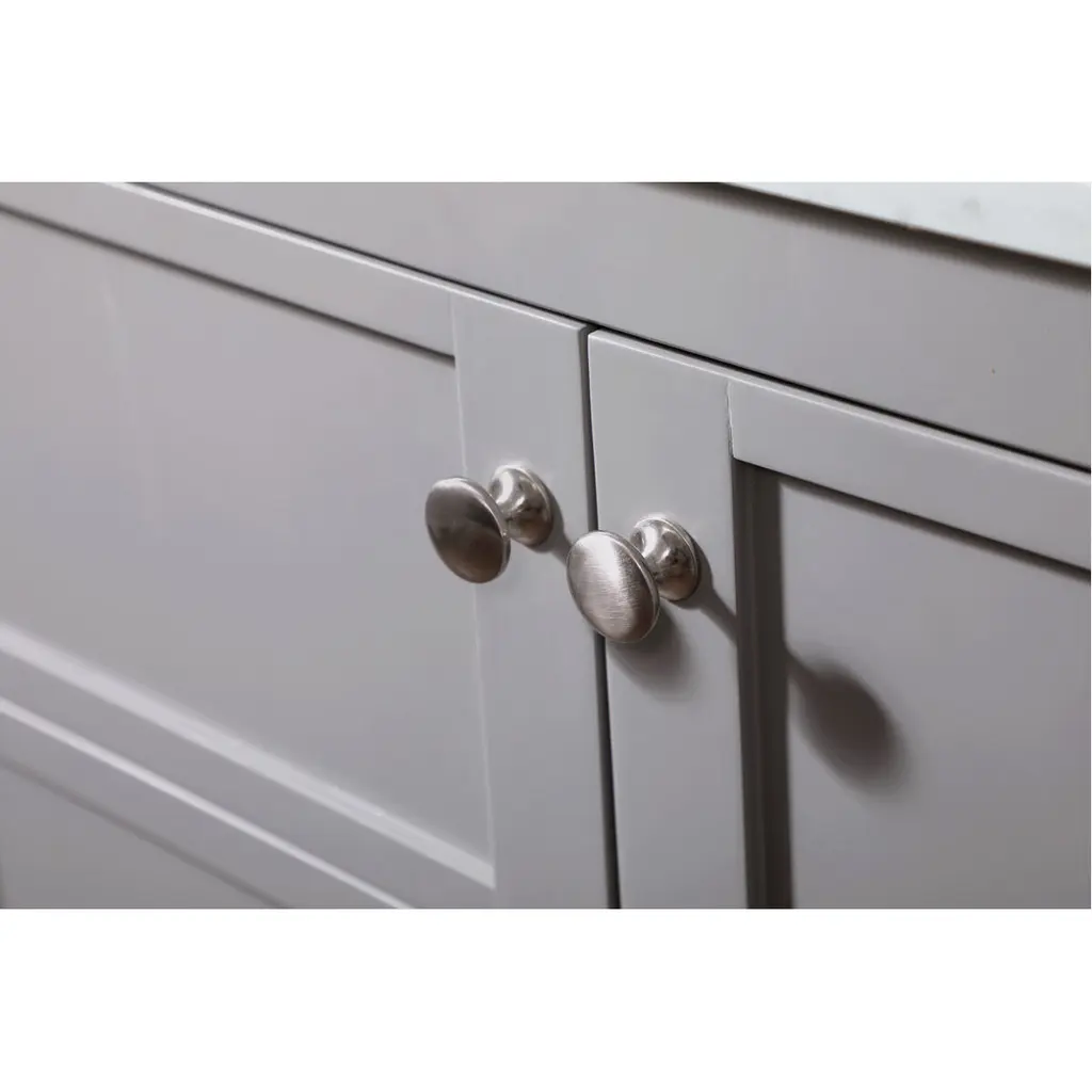 The subtle beauty of the Theo collection vanity exudes comfortable luxury. Its modern, yet traditional beauty will surely dress up your bathroom or powder room without any fuss. The calcatta quartz countertop and porcelain undermount sink shows quiet opulence, and the legs support upright without fail. Brushed nickel hardware complements the trendy gray finish, with pulls adorning the two cabinet doors, showcasing ample storage space within. Slated shelf allows for additional space to organize your towels. Whether this vanity is in your bathroom or for guests, its presence will surely elevate the aesthetics of your room.