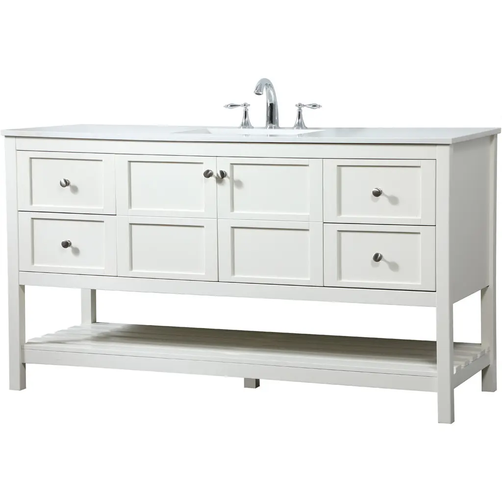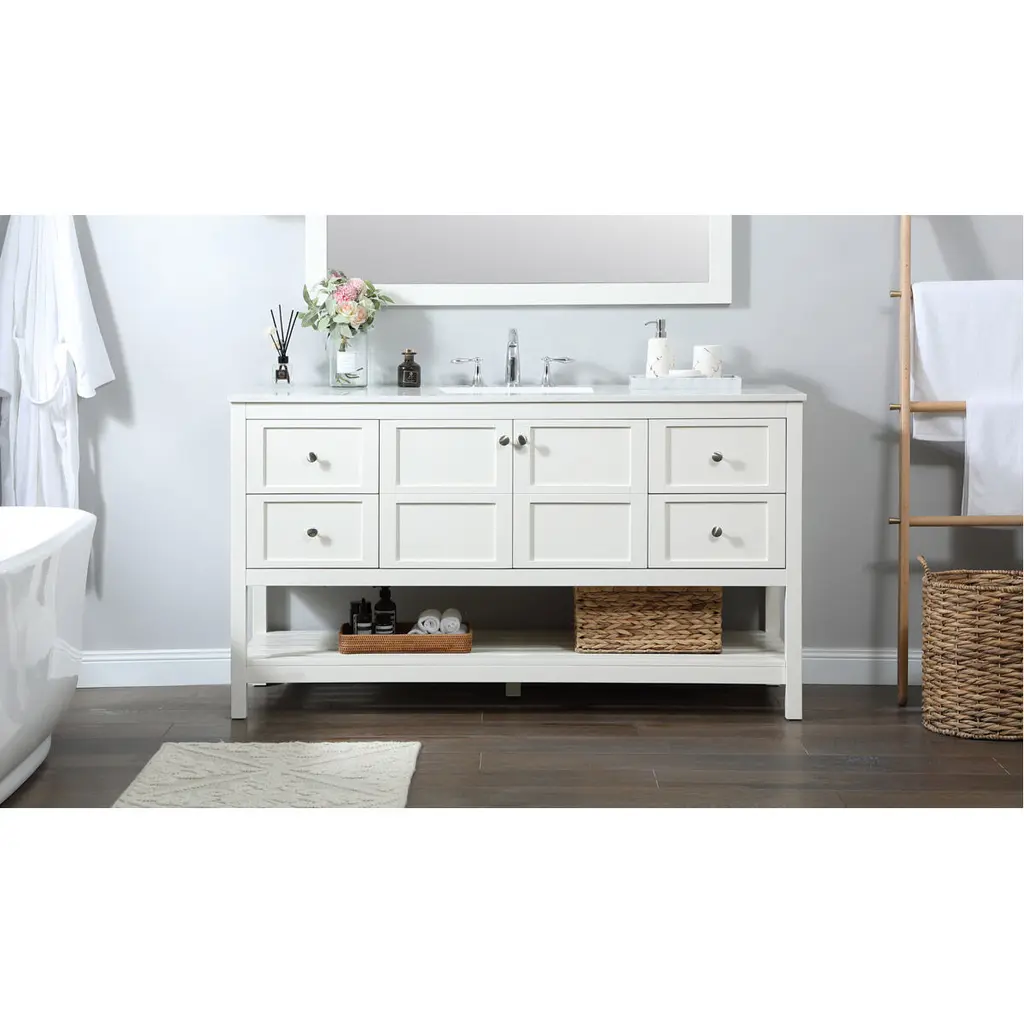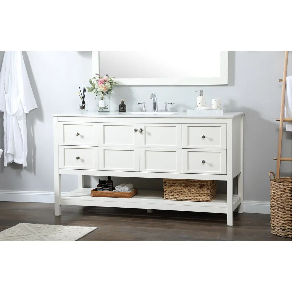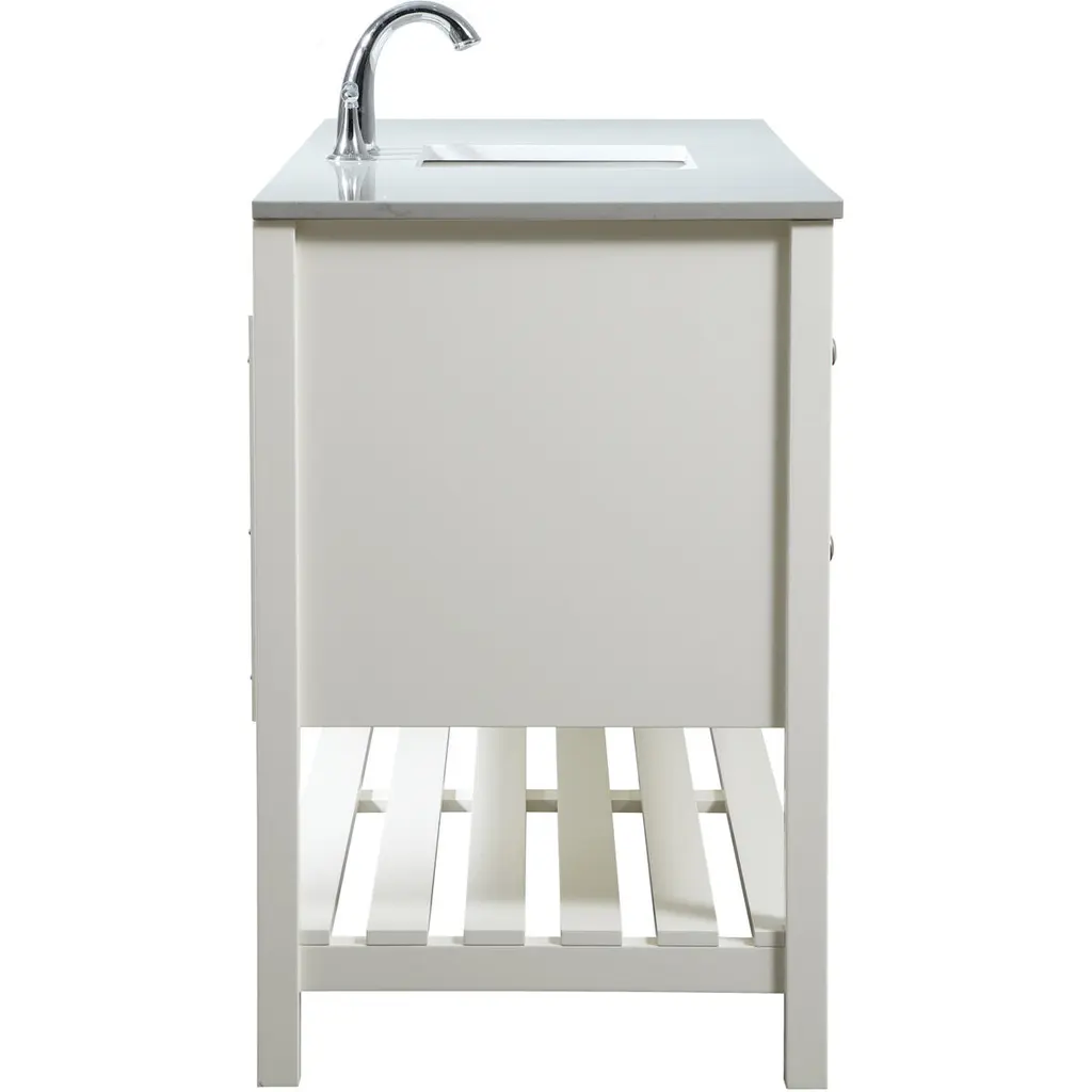 The subtle beauty of the Theo collection 60" vanity in a white finish exudes comfortable luxury. Its modern, yet traditional beauty will surely dress up your bathroom or powder room without any fuss. The white stone countertop and porcelain undermount sink shows quiet opulence, and the legs support upright without fail. Brushed Nickel hardware complements the trendy white finish, with pulls adorning the four cabinet doors and two drawers, showcasing ample storage space within. Slated shelf allows for additional space to organize your towels. Whether this vanity is in your bathroom or for guests, its presence will surely elevate the aesthetics of your room.