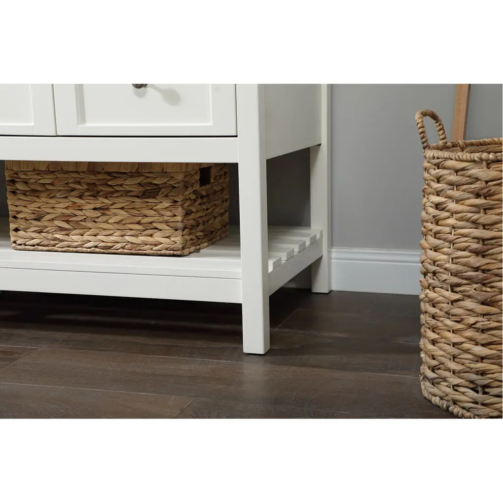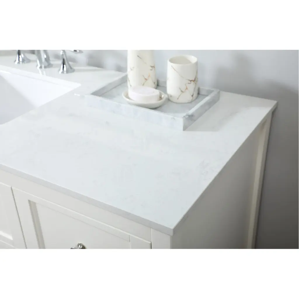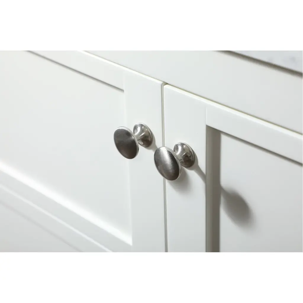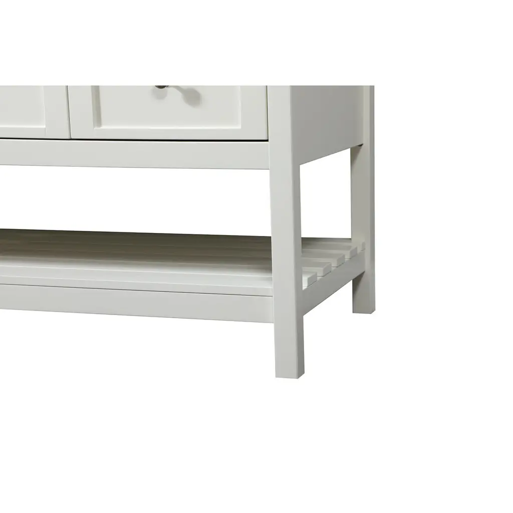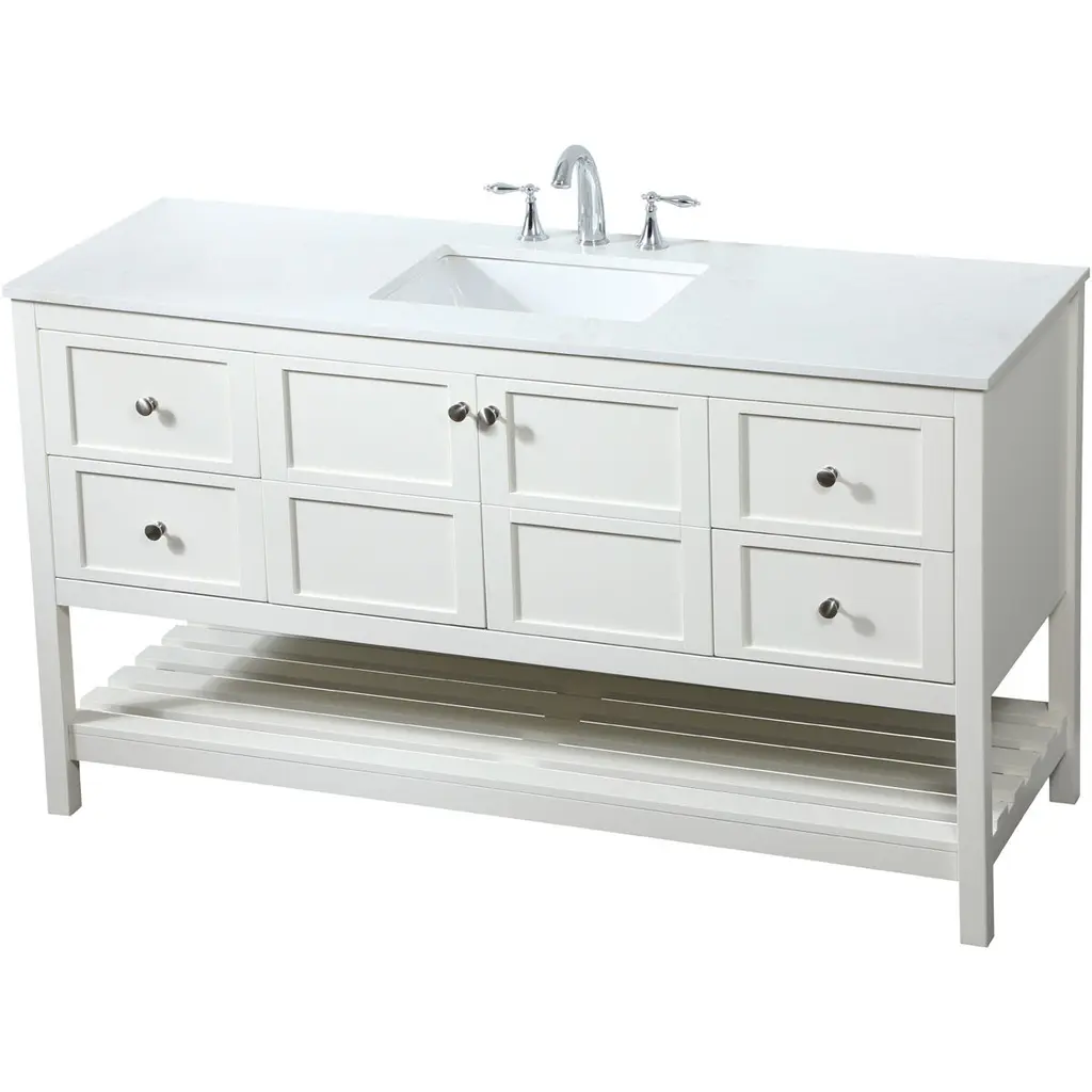 The subtle beauty of the Theo collection 60" vanity in a white finish exudes comfortable luxury. Its modern, yet traditional beauty will surely dress up your bathroom or powder room without any fuss. The white stone countertop and porcelain undermount sink shows quiet opulence, and the legs support upright without fail. Brushed Nickel hardware complements the trendy white finish, with pulls adorning the four cabinet doors and two drawers, showcasing ample storage space within. Slated shelf allows for additional space to organize your towels. Whether this vanity is in your bathroom or for guests, its presence will surely elevate the aesthetics of your room.