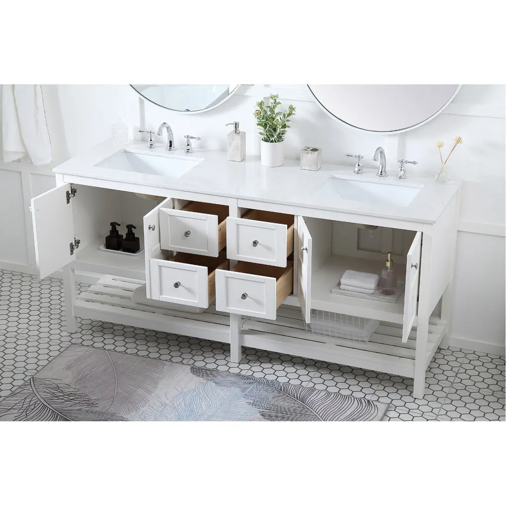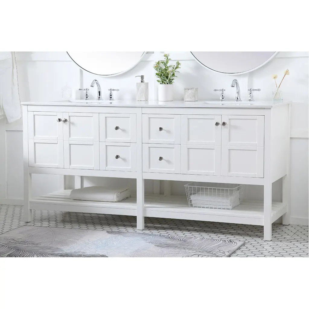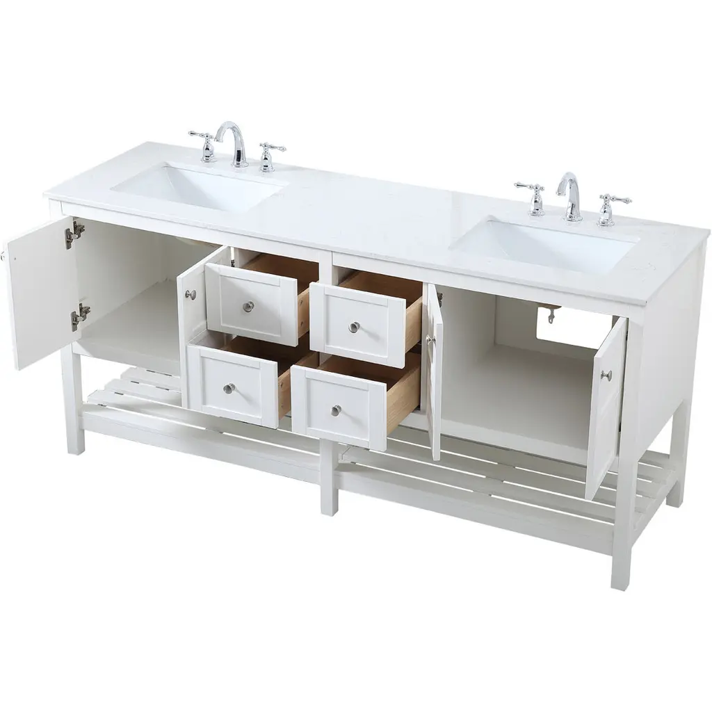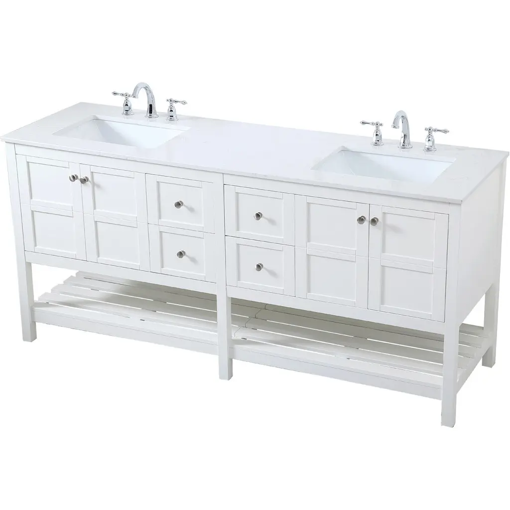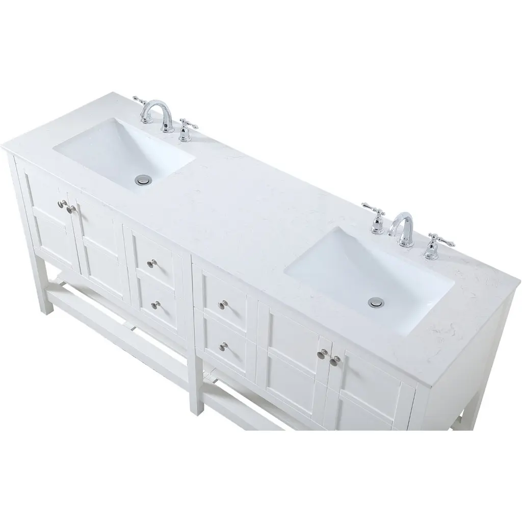The subtle beauty of the Theo collection 72" vanity in a white finish exudes comfortable luxury. Its modern, yet traditional beauty will surely dress up your bathroom or powder room without any fuss. The white stone countertop and porcelain undermount sink shows quiet opulence, and the legs support upright without fail. Brushed Nickel hardware complements the trendy white finish, with pulls adorning the four cabinet doors and four drawers, showcasing ample storage space within. Slated shelf allows for additional space to organize your towels. Whether this vanity is in your bathroom or for guests, its presence will surely elevate the aesthetics of your room.