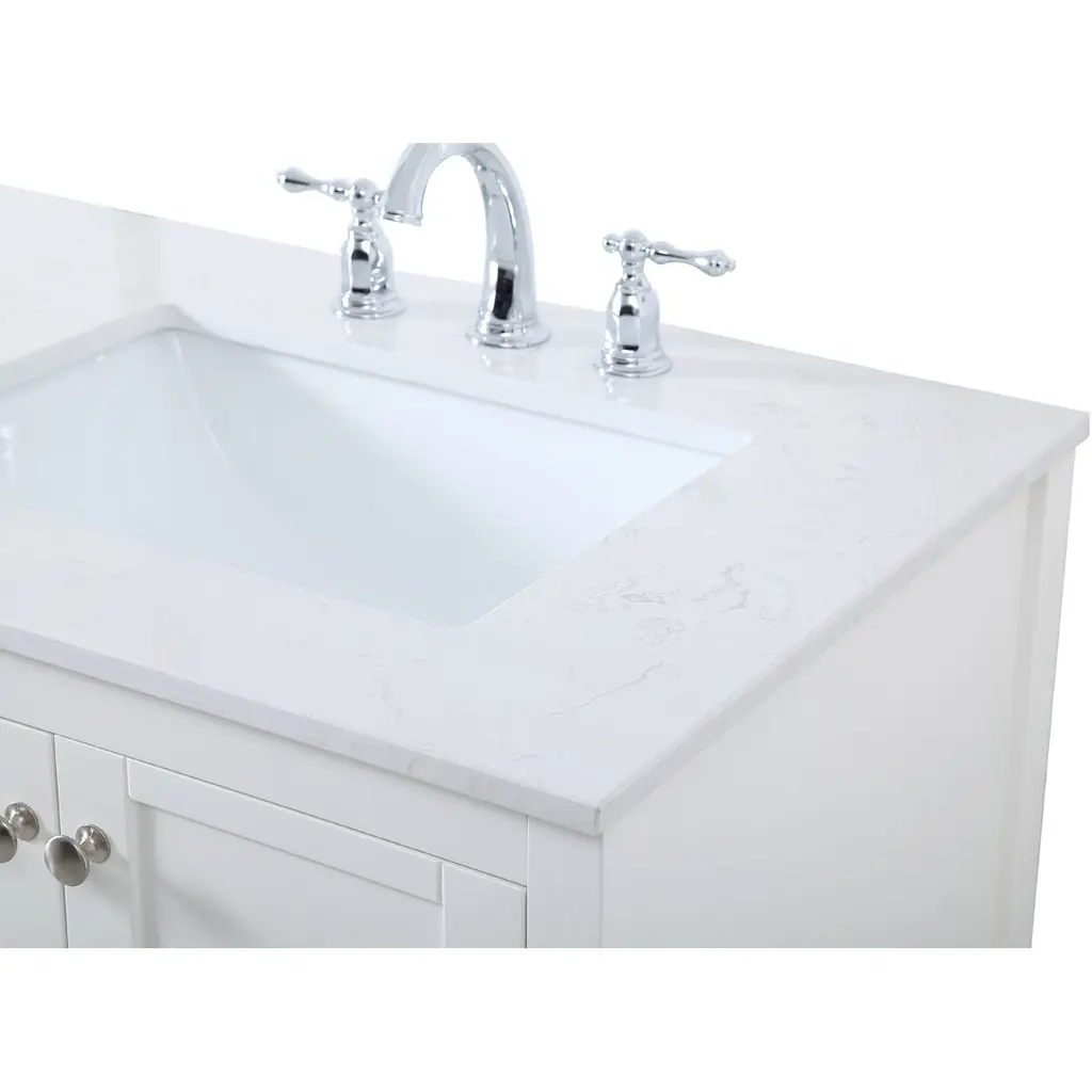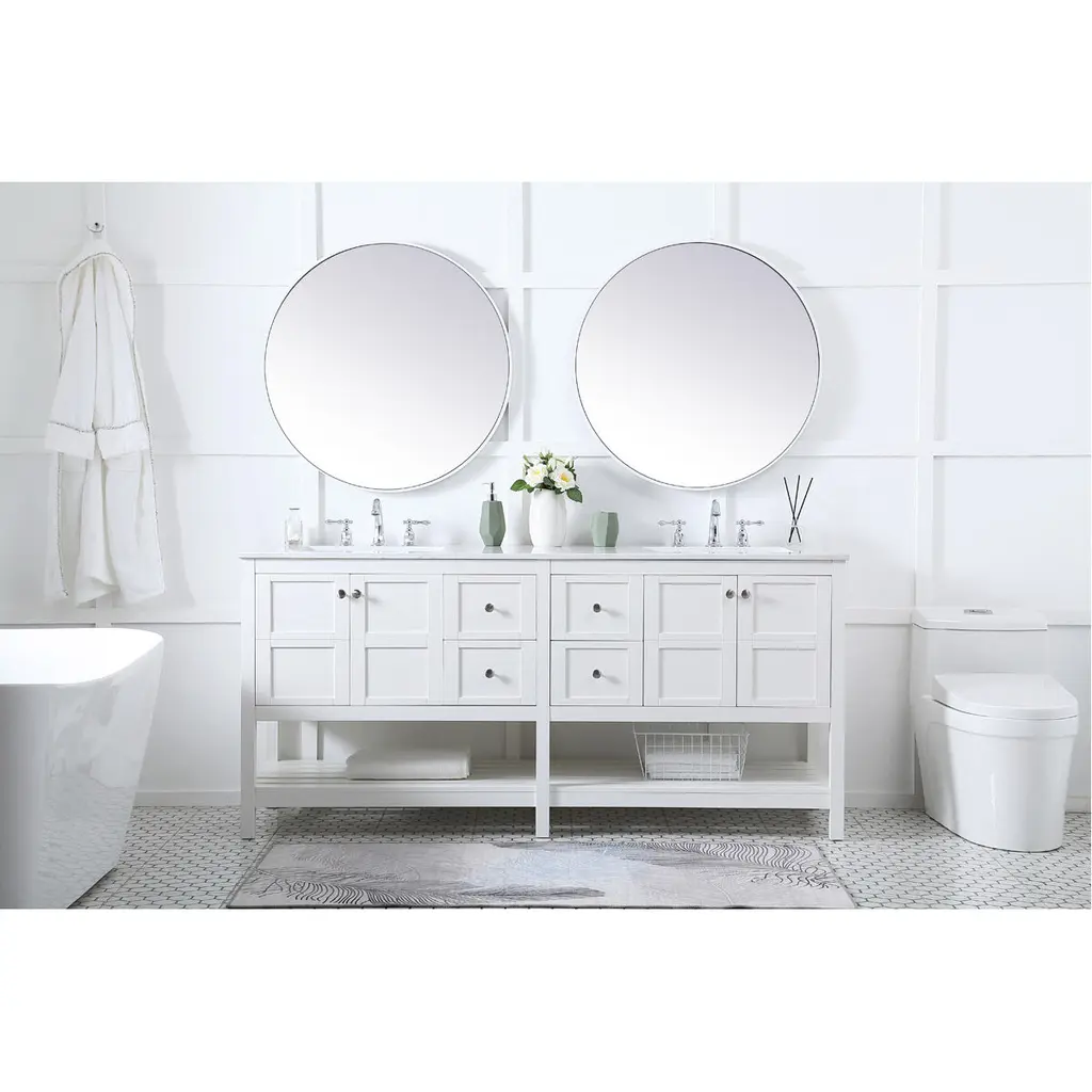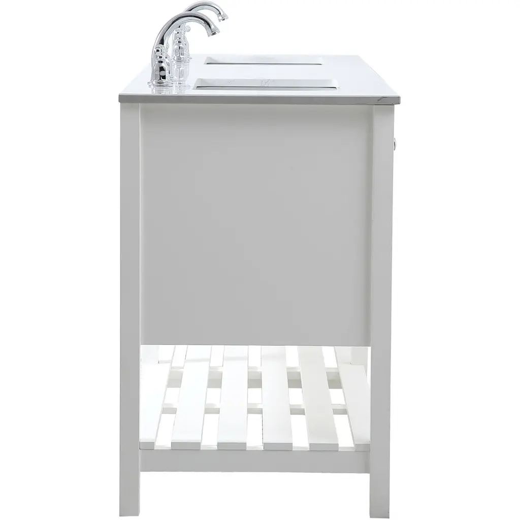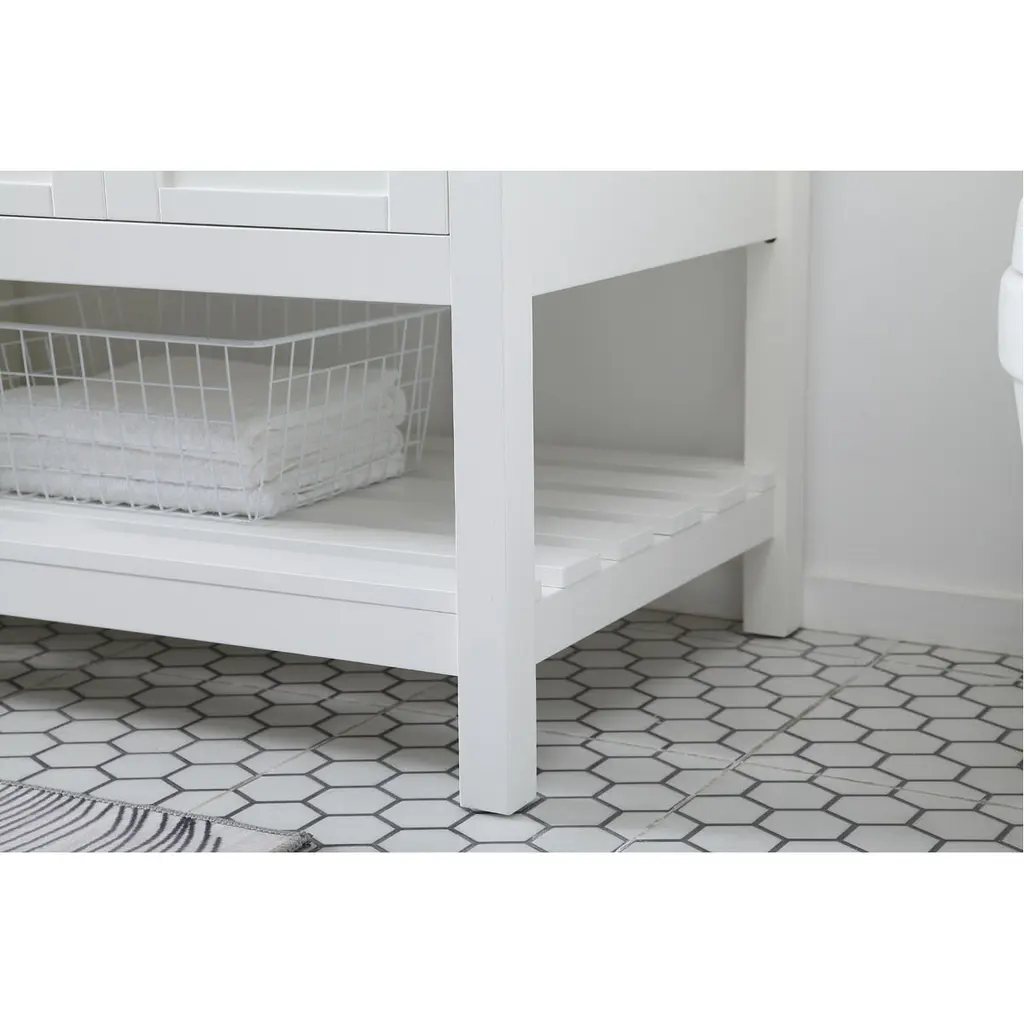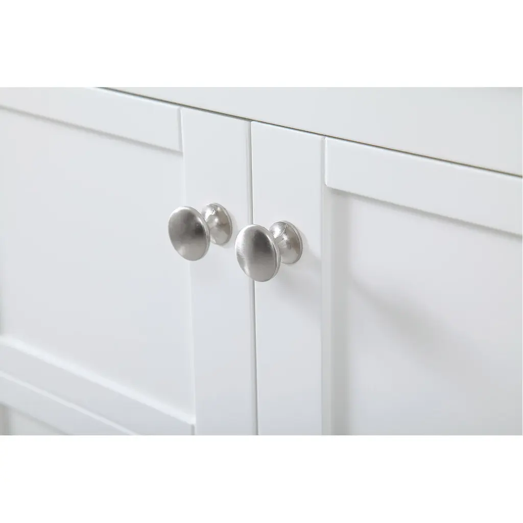 The subtle beauty of the Theo collection 72" vanity in a white finish exudes comfortable luxury. Its modern, yet traditional beauty will surely dress up your bathroom or powder room without any fuss. The white stone countertop and porcelain undermount sink shows quiet opulence, and the legs support upright without fail. Brushed Nickel hardware complements the trendy white finish, with pulls adorning the four cabinet doors and four drawers, showcasing ample storage space within. Slated shelf allows for additional space to organize your towels. Whether this vanity is in your bathroom or for guests, its presence will surely elevate the aesthetics of your room.