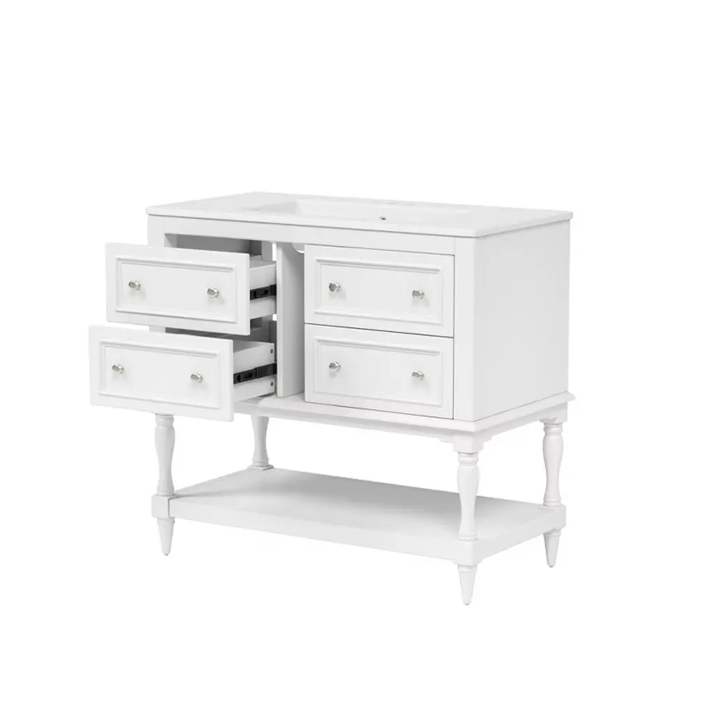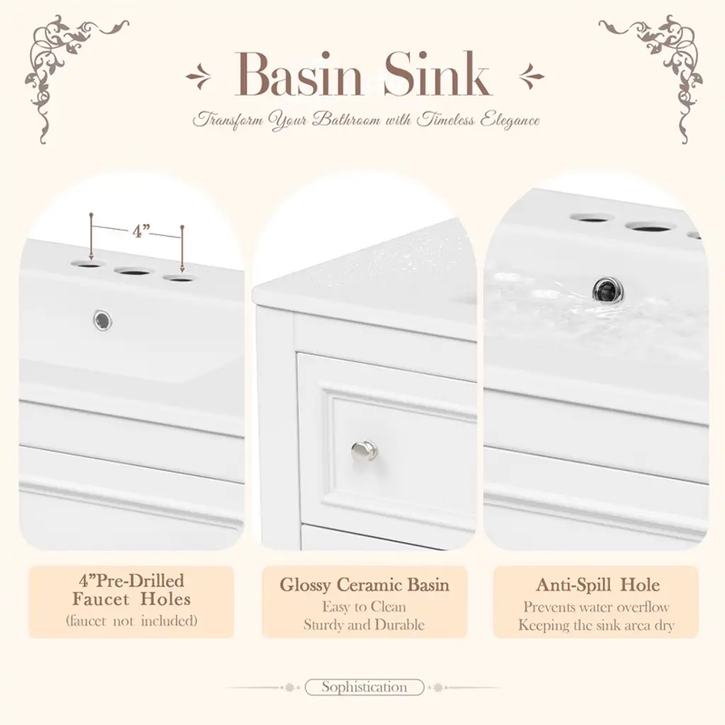 This elegant bathroom vanity set combines an undermount ceramic sink with a sturdy solid wood frame construction. Crafted from eco-friendly MDF materials and assembled with durable stainless steel hinges, this vanity offers both environmental consciousness and reliable performance that will enhance your bathroom space for years to come.