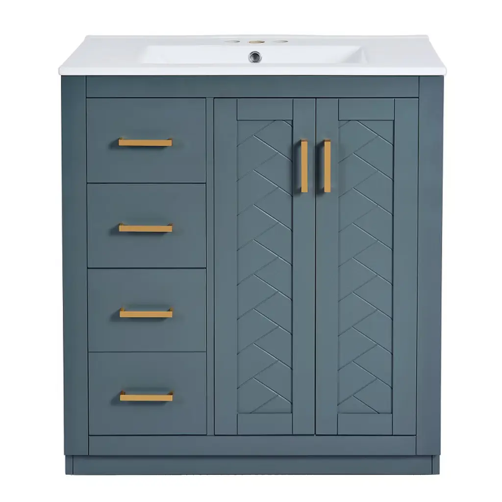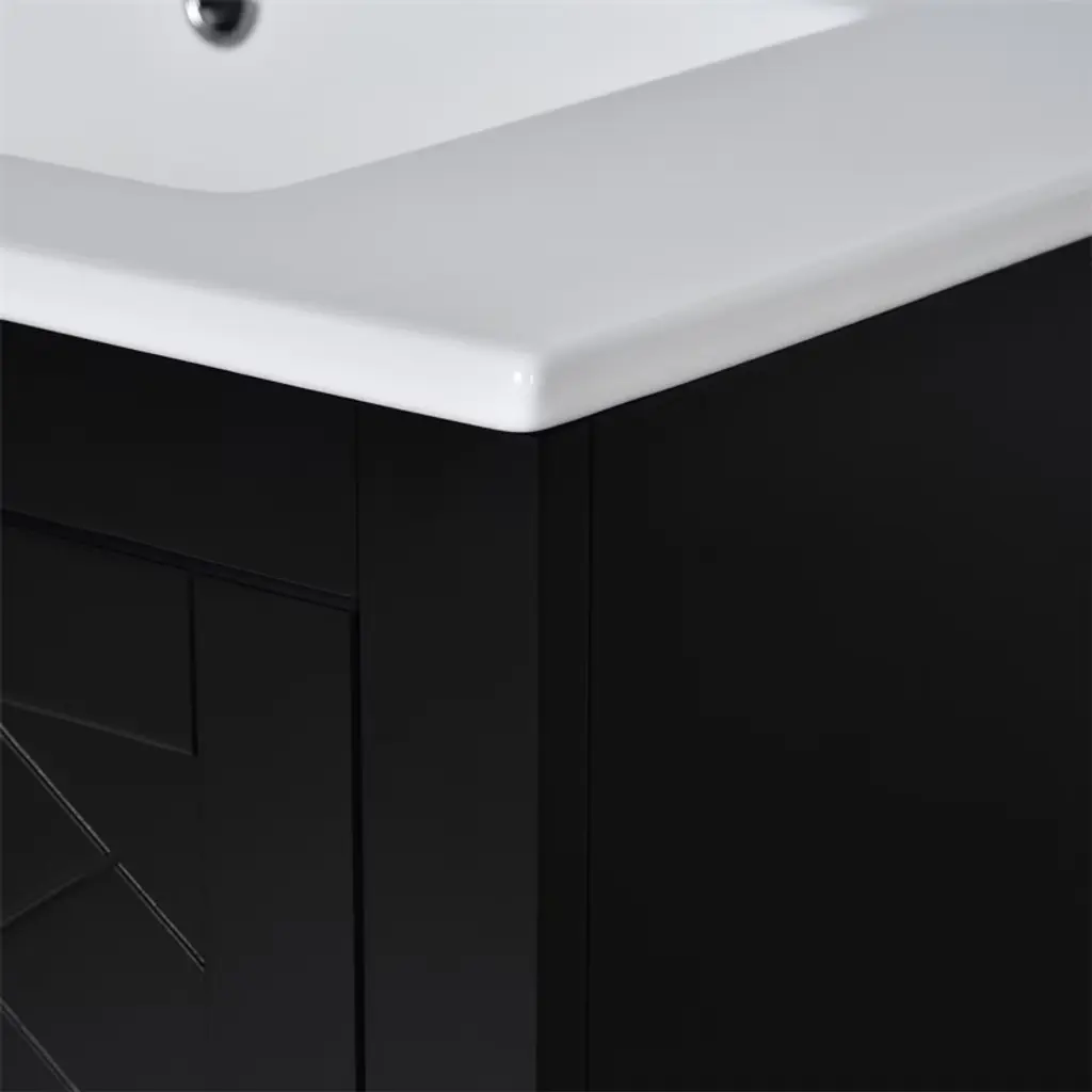This high-quality bathroom vanity set combines a sturdy solid wood frame with durable MDF construction, ensuring exceptional longevity and reliability. The elegant freestanding design features a smooth ceramic undercounter sink that is easy to clean and designed to accommodate a standard 4-inch centerset faucet for your convenience.