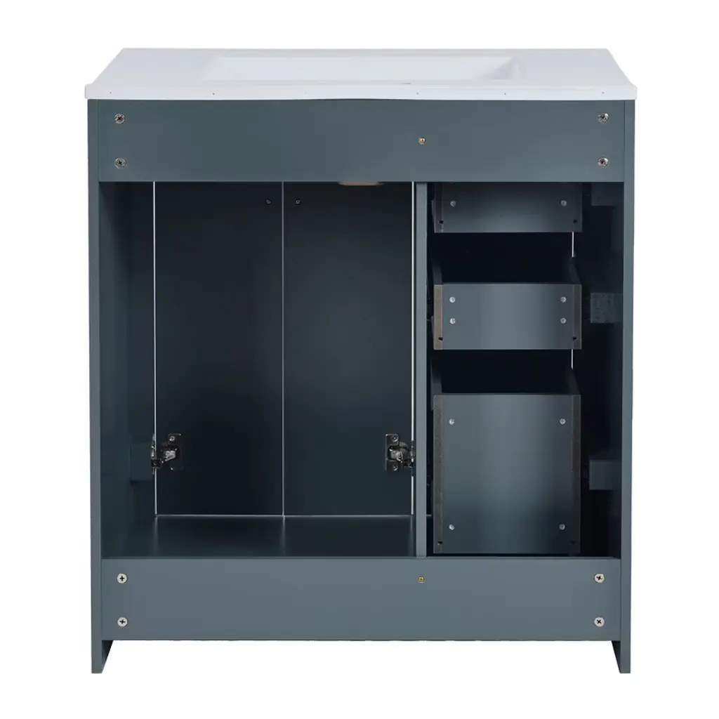 This high-quality bathroom vanity set combines a sturdy solid wood frame with durable MDF construction, ensuring exceptional longevity and reliability. The elegant freestanding design features a smooth ceramic undercounter sink that is easy to clean and designed to accommodate a standard 4-inch centerset faucet for your convenience.