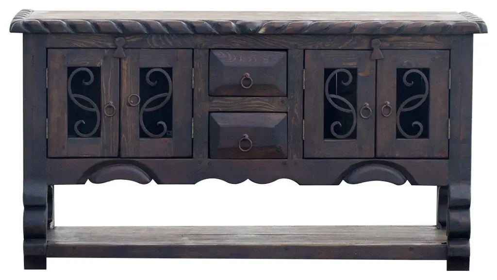 This gorgeous bathroom vanity has it all! It is beautifully constructed with hand forged metal in each door. The metal is oxidized with a rustic finish and sealed. The top is hand carved as well as the ornate bottom beneath the doors. The open shelving allows for decorative items, or to be left open.You might have noticed that our pieces are different than anything you've seen. Every piece made by FoxDen is handmade, for you, when you order it. What makes us different is that most of our designs have actually come from collaboration with our customers. While we've always focused on grassroots design, we keep our history at our core. FoxDen's home is one of the oldest cities in the United States, settled by the Spanish in 1598, which is where we get our rich blend of Spanish, Mexican and American influences! Each Piece is solid wood, made to last a lifetime!The top is sealed with polyurethane to protect from water damage.The item pictured is 60x20x32.Solid WoodPictured as Single Sink VanityStandalone VanityHand Finished: Dark WaxFull Extension, Double Bearing Metal GlidesFits in with Rustic, Farmhouse and Southwest StylesVanity With Top (Solid Wood)Ideal for Vessel SinkSuitable for Drop-in Sink- Sink Not Included