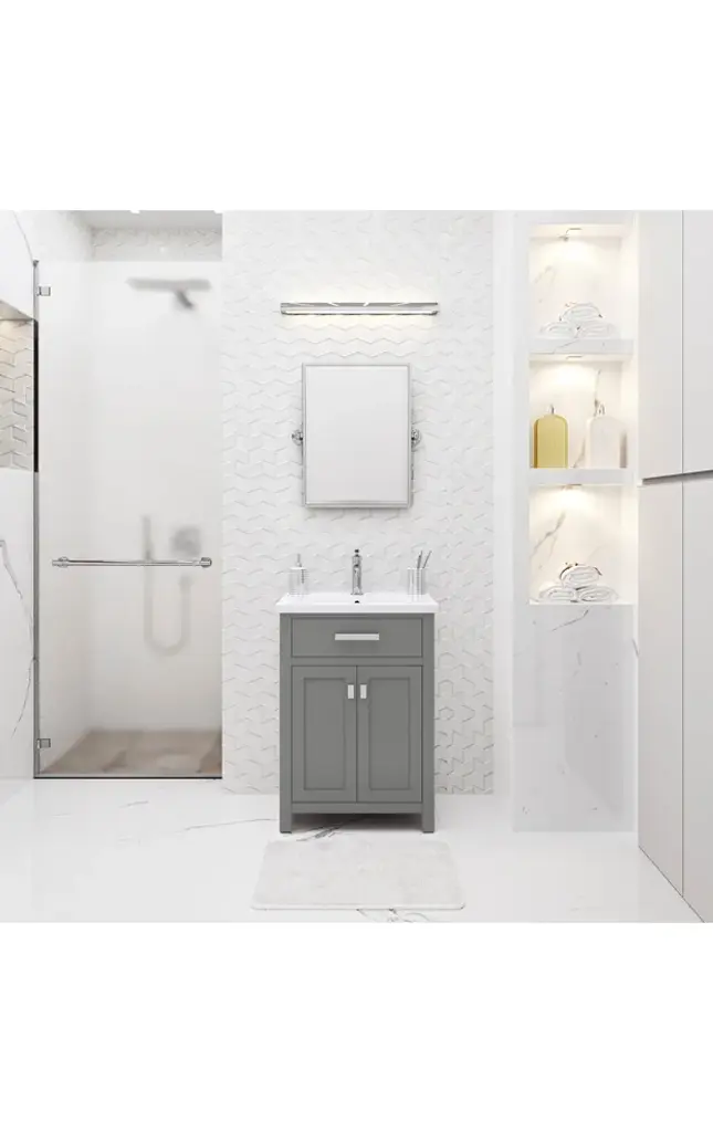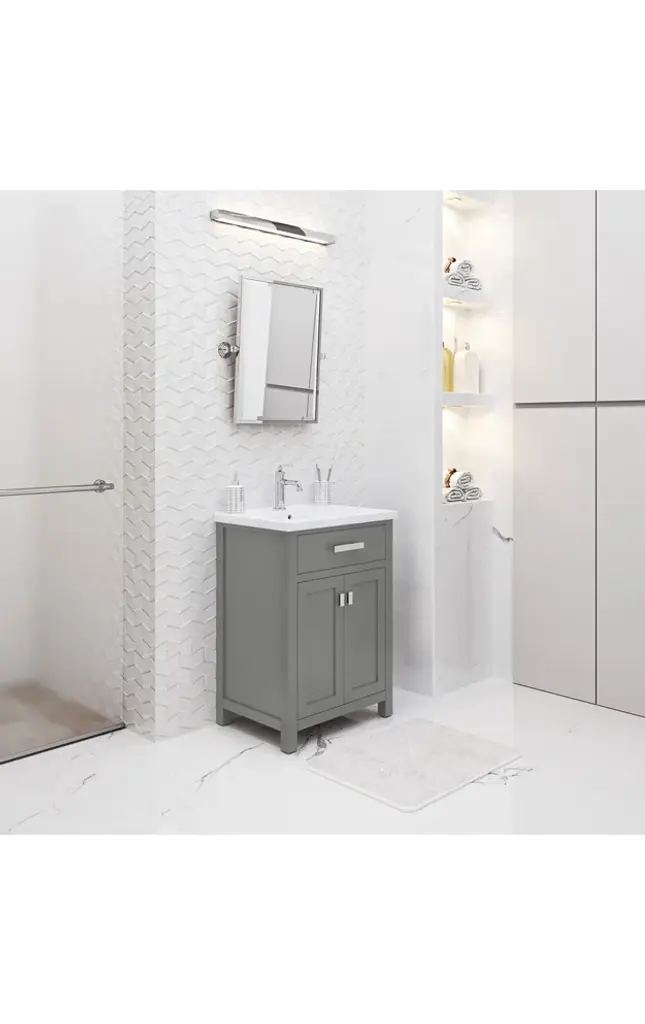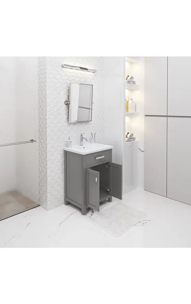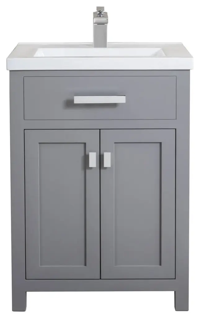 Water Creation's Ceramics countertop vanities give consumers a choice to both keep remodeling the bathroom under an affordable budget, and still be able to aim for that prestige high end design that they prefer. The design, craftsmanship, material, and finishing techniques are all offered top notch in their class. The hardwares are also well crafted and put together. Water Creation's vanities consummates the bathroom and would last in their timeless design.Crafted of MDF for Exceptional Strength and Structural IntegrityFully Assembled for Easy InstallationMulti-Layered Coating for Vanity Base to Ensure DurabilityVanity Top Material: Durable Integrated Ceramic Sink CountertopEuropean Style Concealed Hinges for Soft Close DoorVanity Overall Dimension: 24 In. W x 18.3 In. D x 34 In. HFeatures:Cabinet Material: Solid WoodBacksplash Material: Not includedNumber of Sink: 1Vanity Sink Shape: RectangularVanity Sink Type: IntegratedVanity Sink Material: CeramicBacksplash not includedCountertop Material: CeramicVanity Mounting Type: Free-standing*Faucet and drain assembly not included