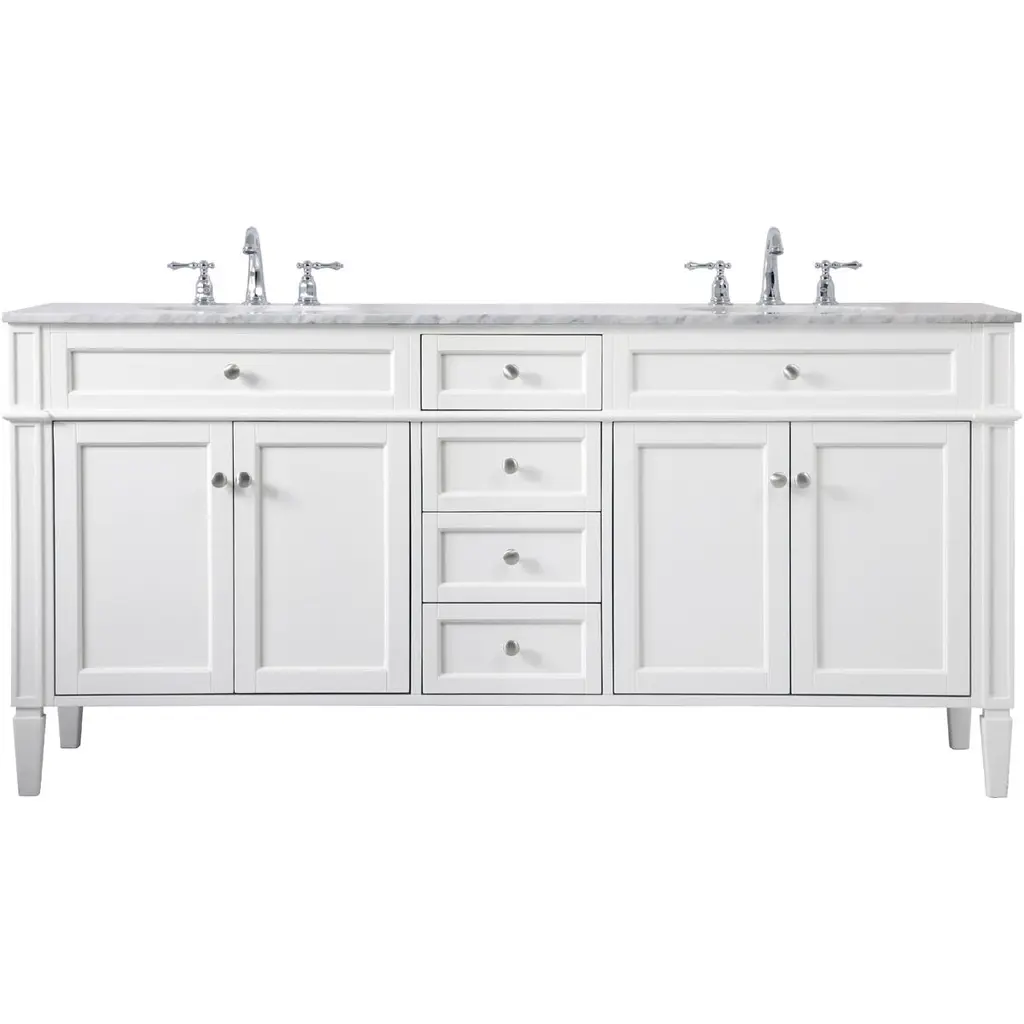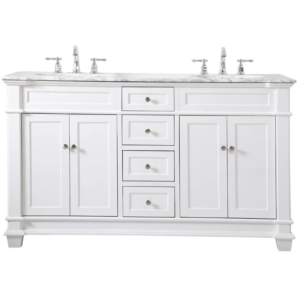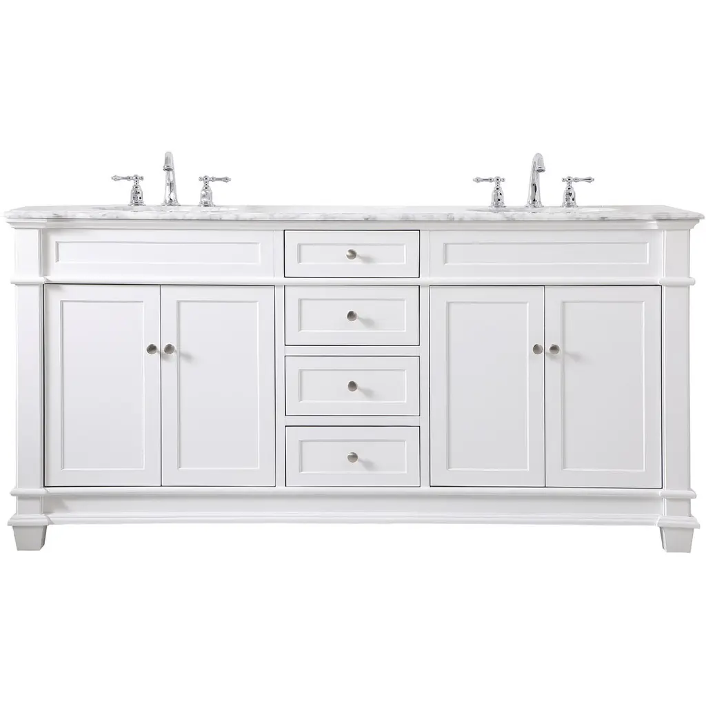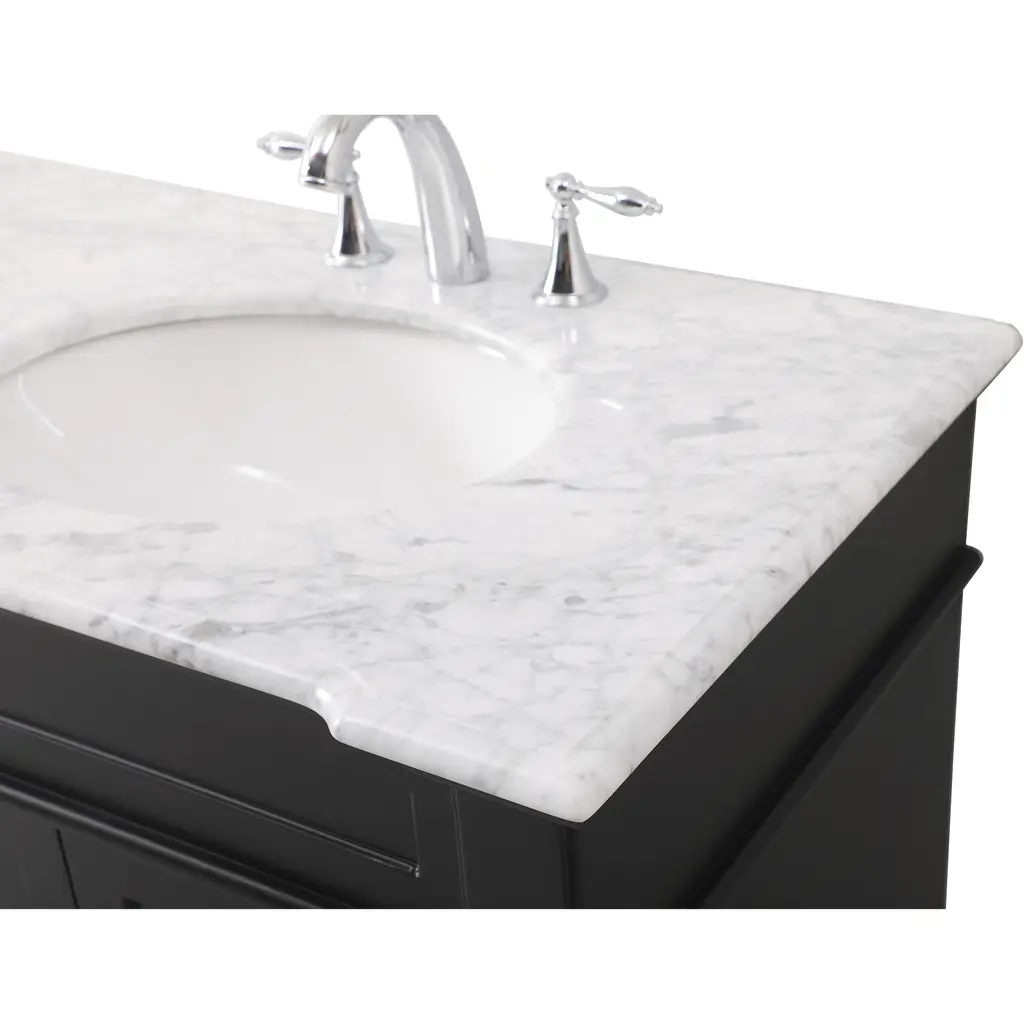 The Wesley Collection vanity cabinet will bring a settle pop of color into your bathroom. The flattering finish is a sophisticated color which creates a calming atmosphere in the room. The brushed nickel knobs bring a vibrant touch to balance the vanity. With the detailed engravings, the cabinet catches eyes with its beautiful lining work. Open the cabinet doors to store what you desire and make use of the spacious area. To top it off, the Carrara white marble adds a luxury and modern finish to the countertop.