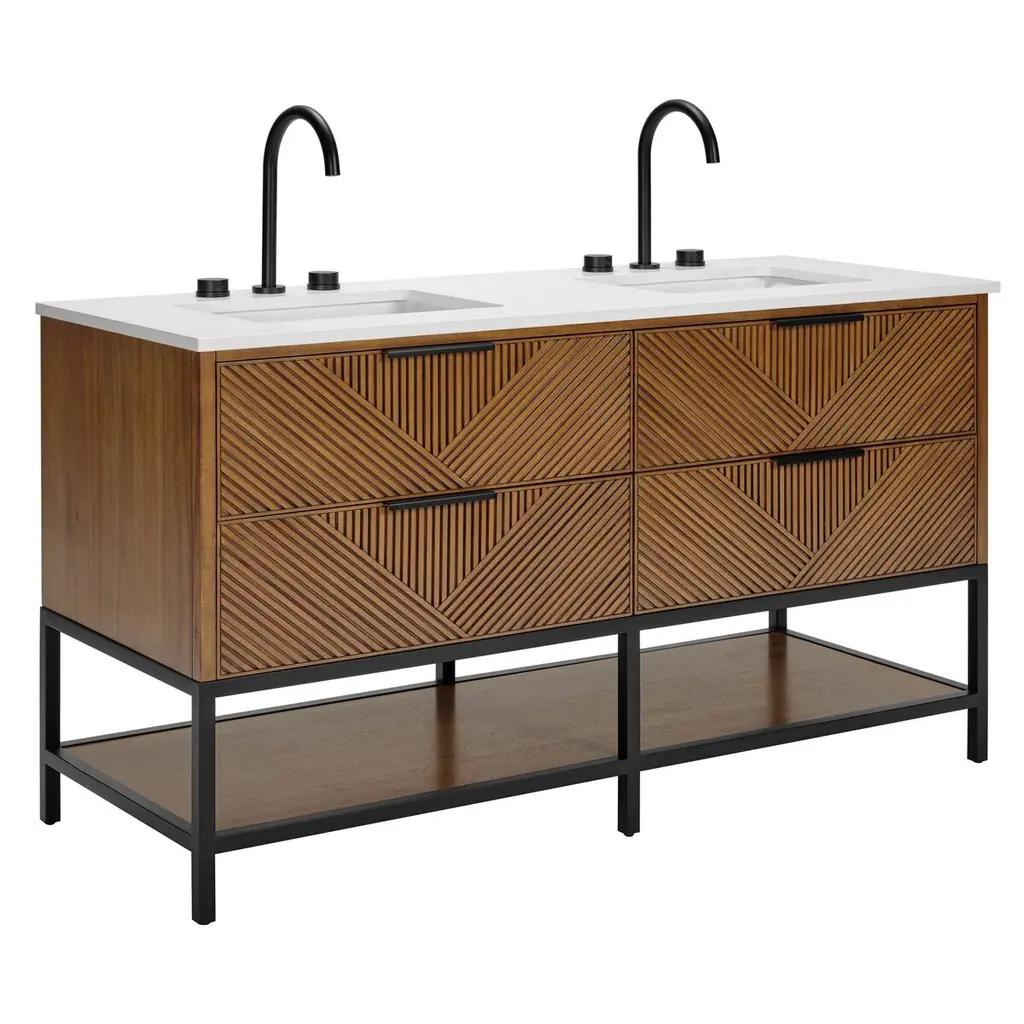 Blends mid-century style with contemporary appeal. Quartz is known for its resistance to stains and beautiful color. The three drawers and two cabinets mean plenty of storage space. Its handles add a chic accent and pop of color.