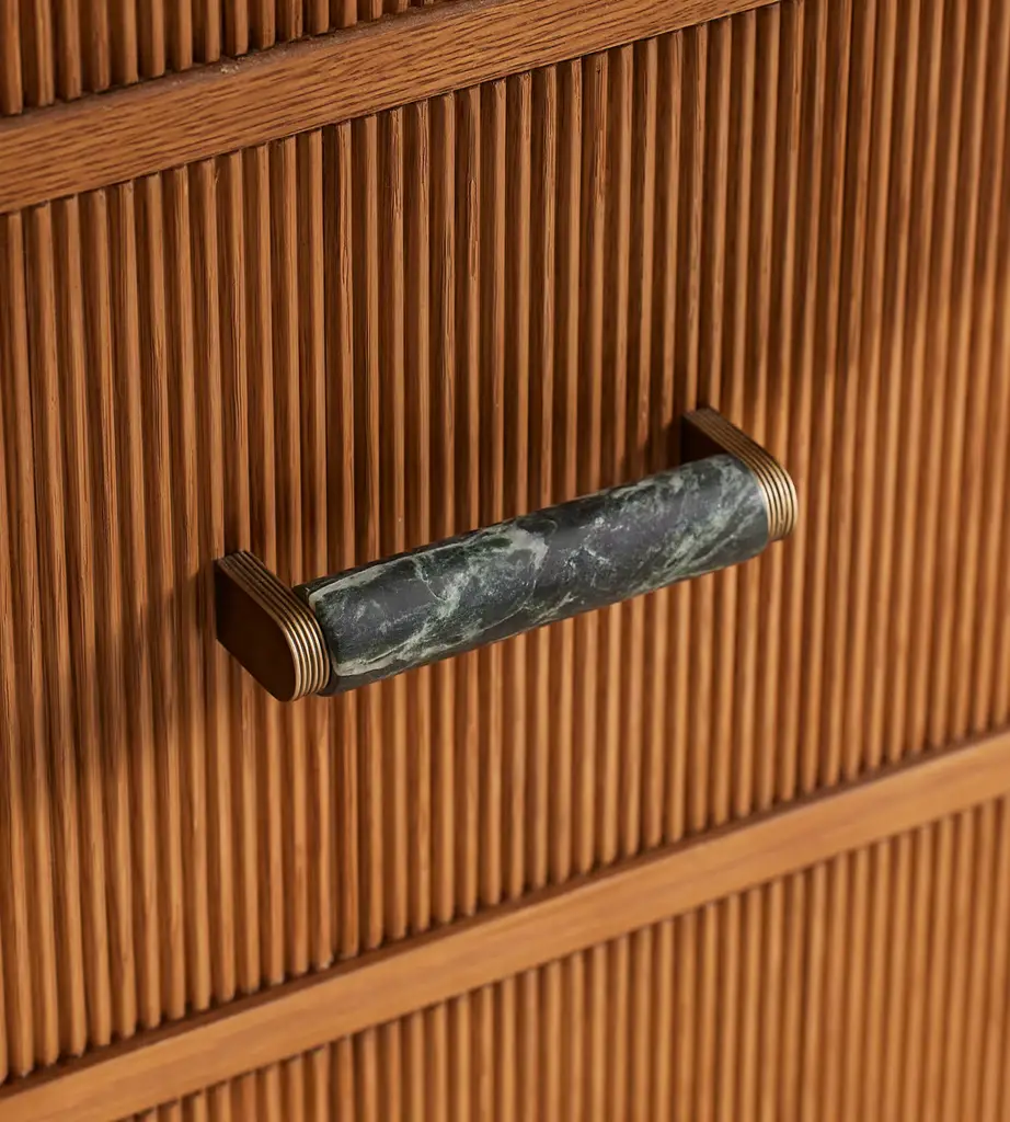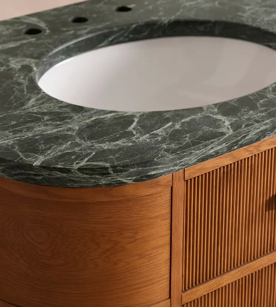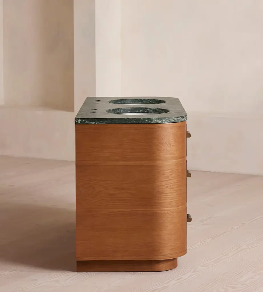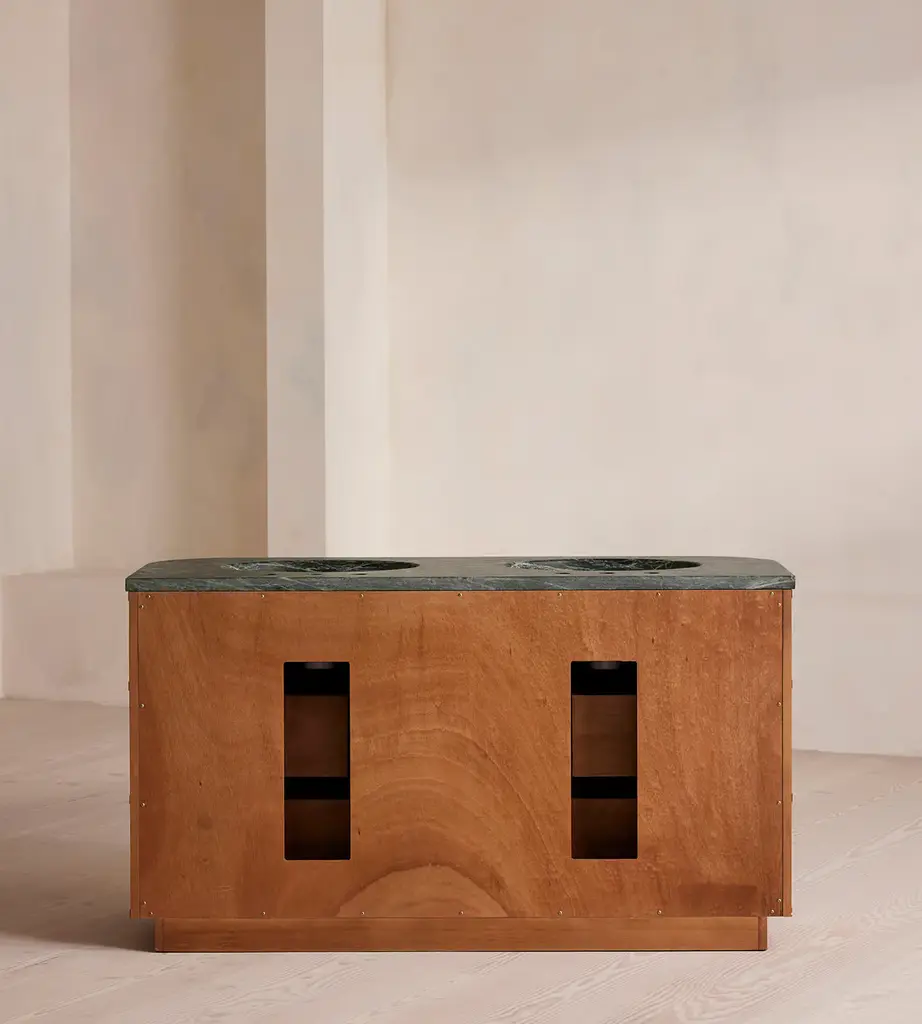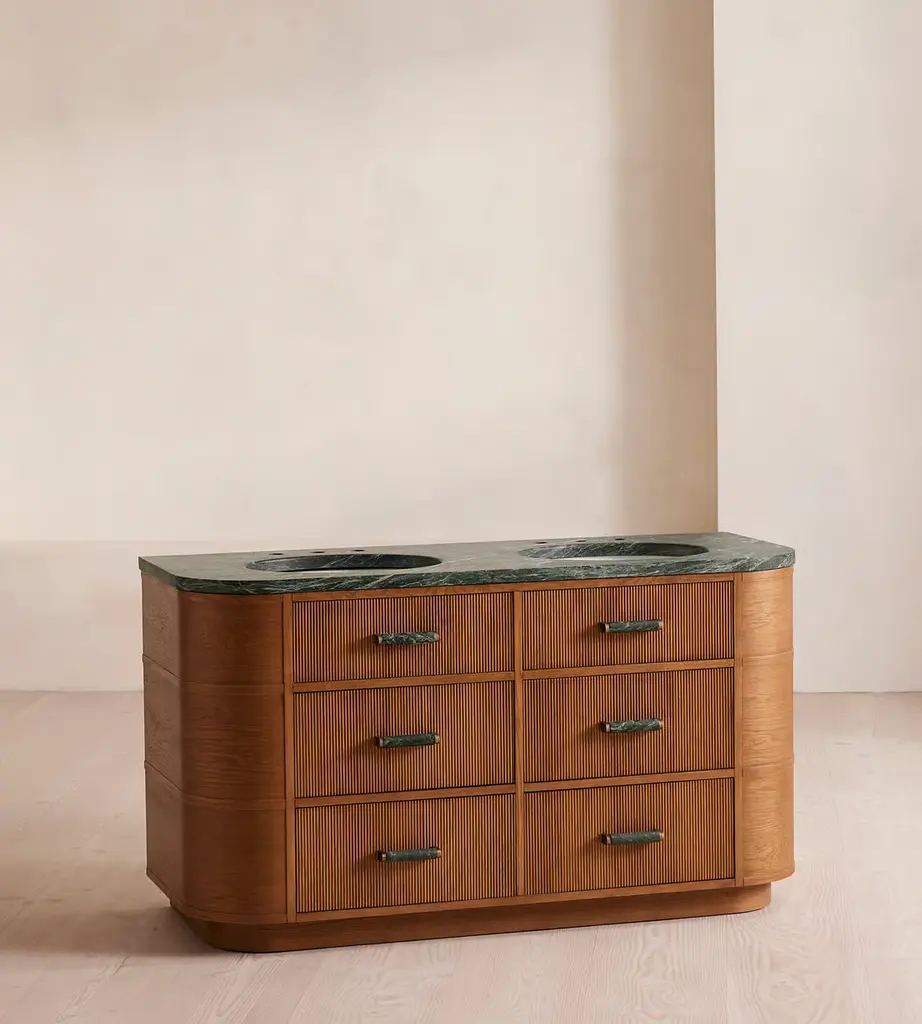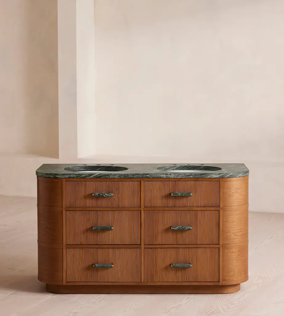 This wraparound-style vanity features a honed top crafted from Napoli Green marble. Carved from a mix of mid-toned oak and a deep-green marble, the Witley double vanity is fitted with four ribbed drawers and twin inset sinks. It's styled here with the Lefroy Brooks Janey Mac taps in brushed brass.