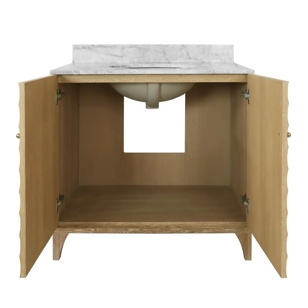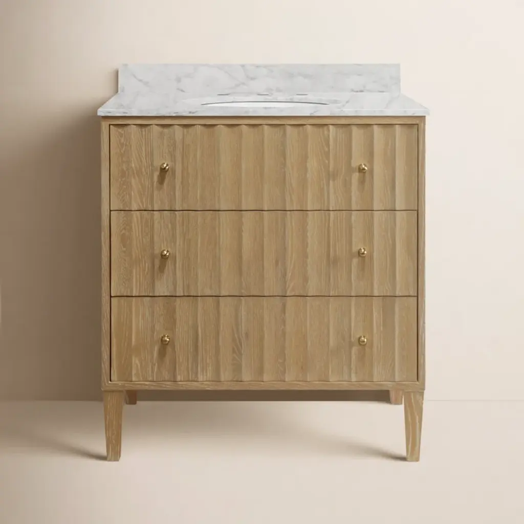 Add a statement piece to your bathroom with the Rhodes CO. Bath Vanity. This vanity combines architectural inspiration with premium materials and functional design. The horizontal fluted details provide a unique texture, while the Carrara marble top offers a luxurious surface.