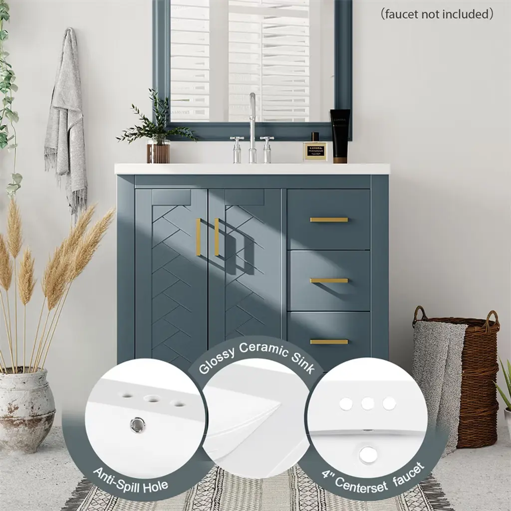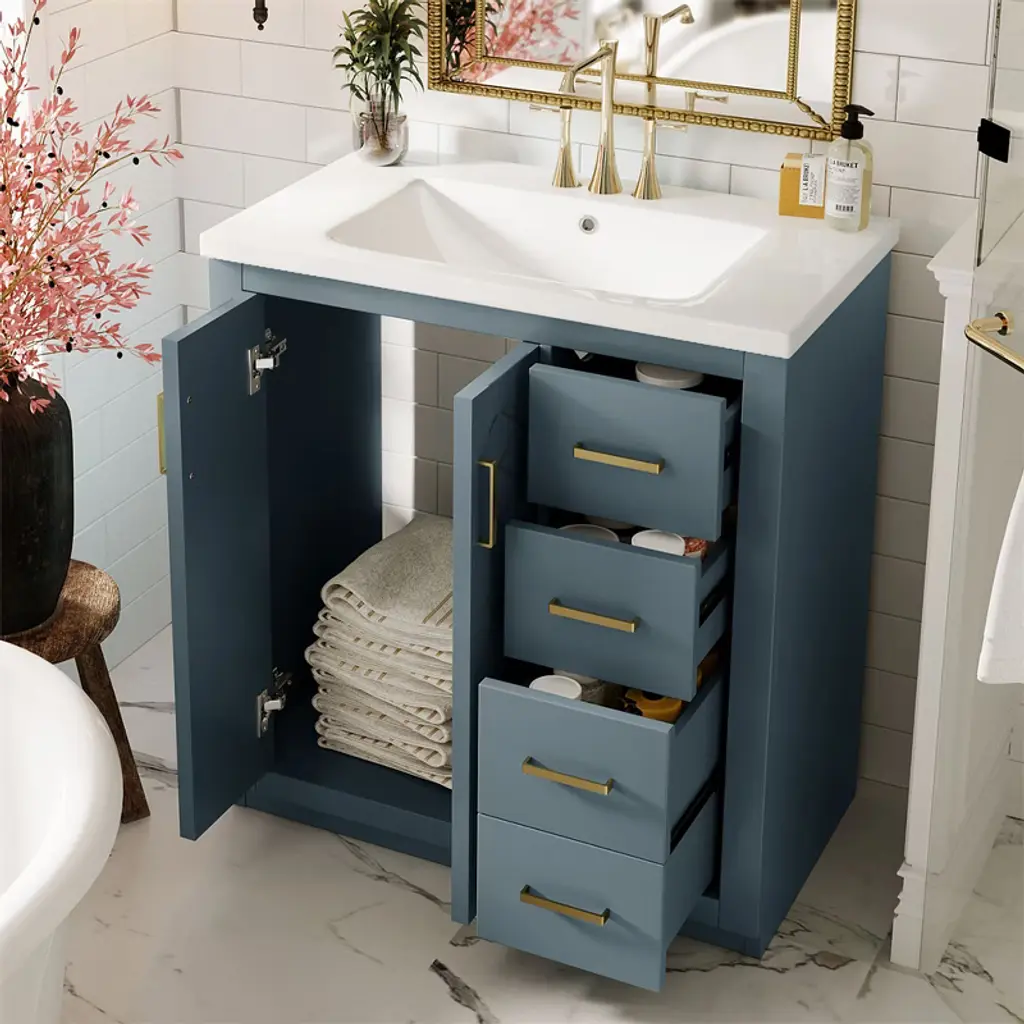 Xinghanzhenxuan Blue Solid Wood Bathroom Vanity With Ceramic Sink, Freestanding Vanity Set With 3 Drawers & Soft-close Doors