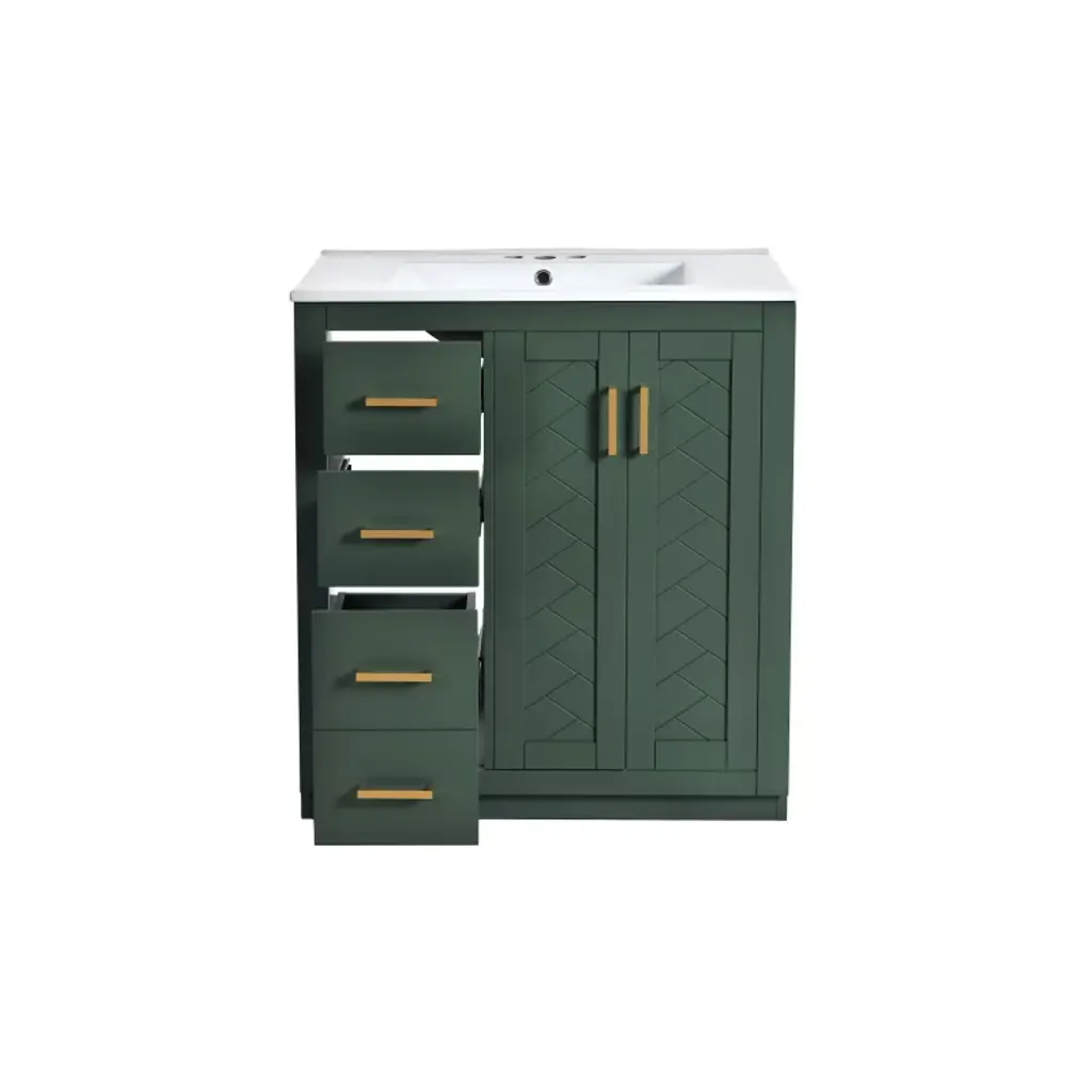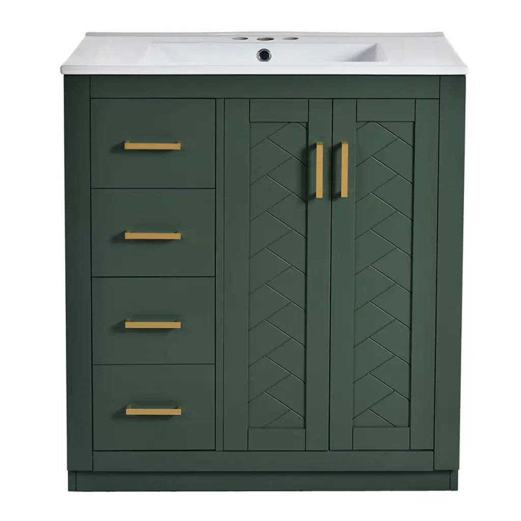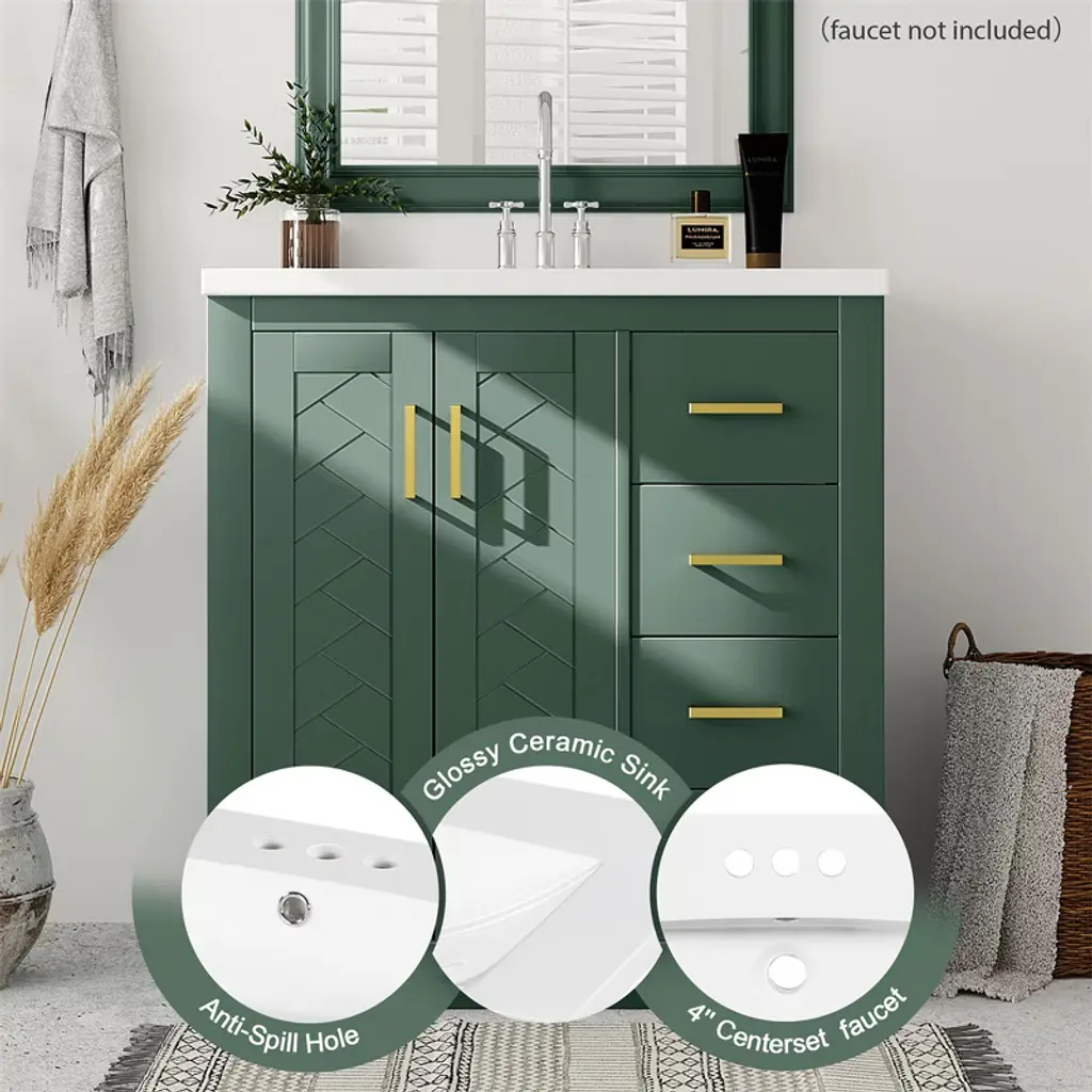 Xinghanzhenxuan Green Solid Wood Bathroom Vanity With Ceramic Sink, Freestanding Vanity Set With 3 Drawers & Soft-close Doors