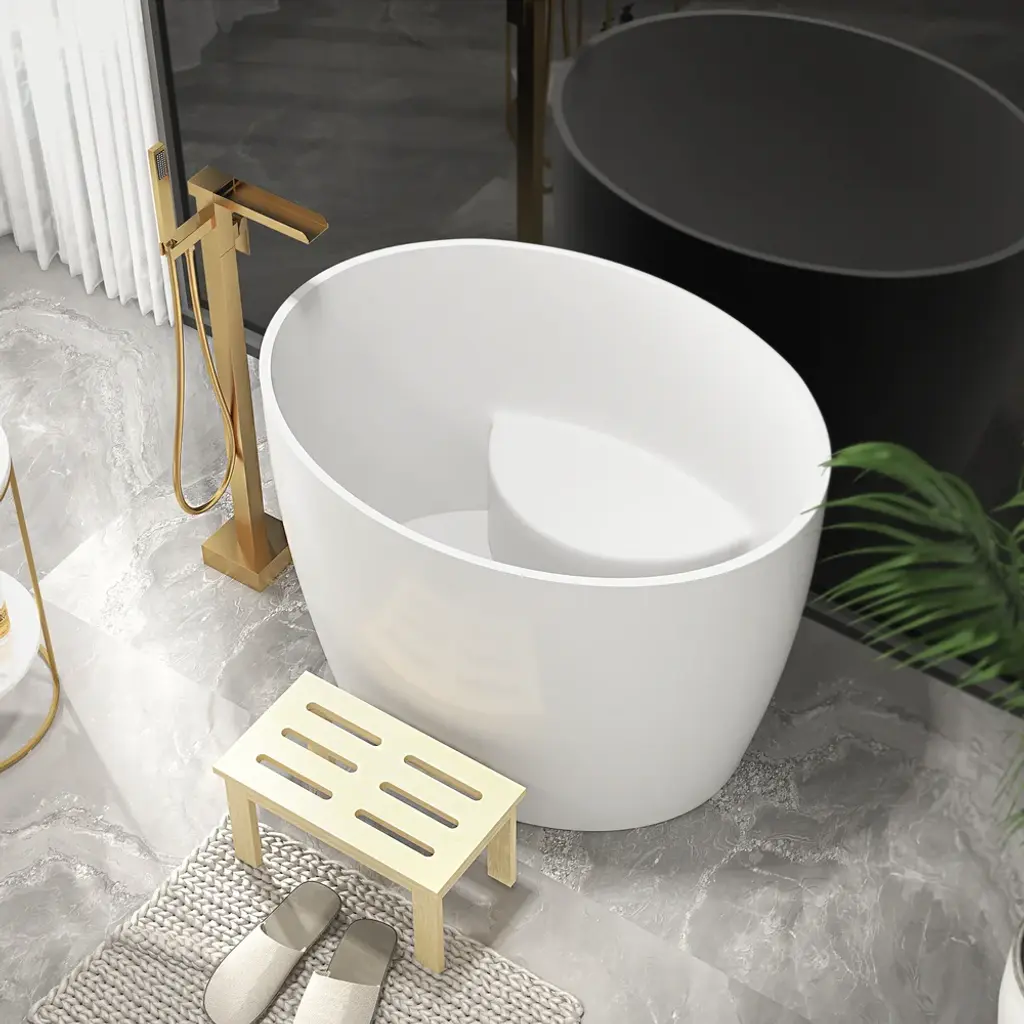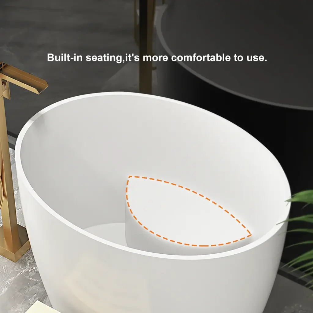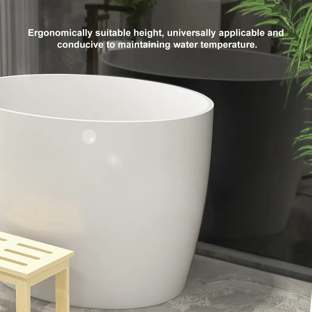 Perfect for compact spaces, this 39.37" deep soaking bathtub offers a luxurious retreat. Crafted from durable stone resin with a sleek matte white finish, its oval design features a built-in seat and ergonomic height for exceptional comfort and heat retention. This freestanding bathtub masterfully combines space-saving design with deep-soak functionality for the ultimate personal spa experience.