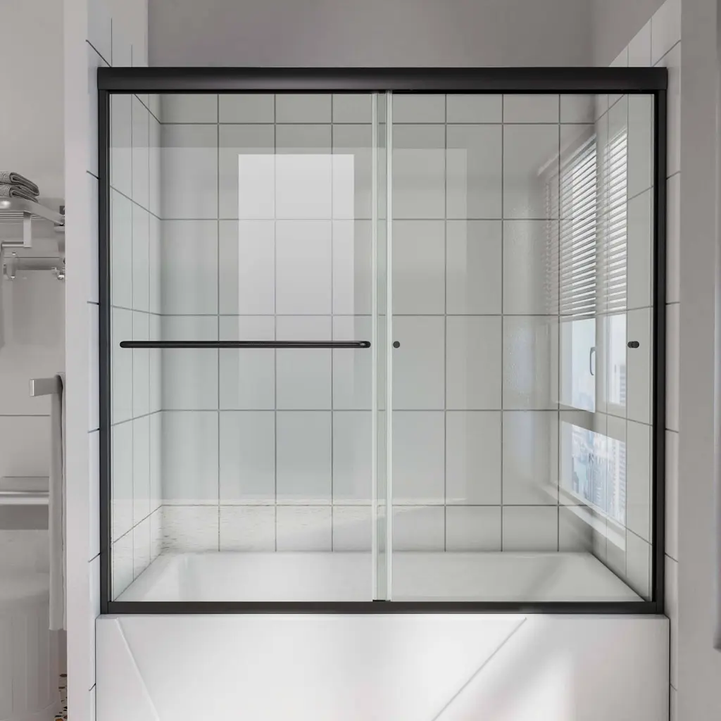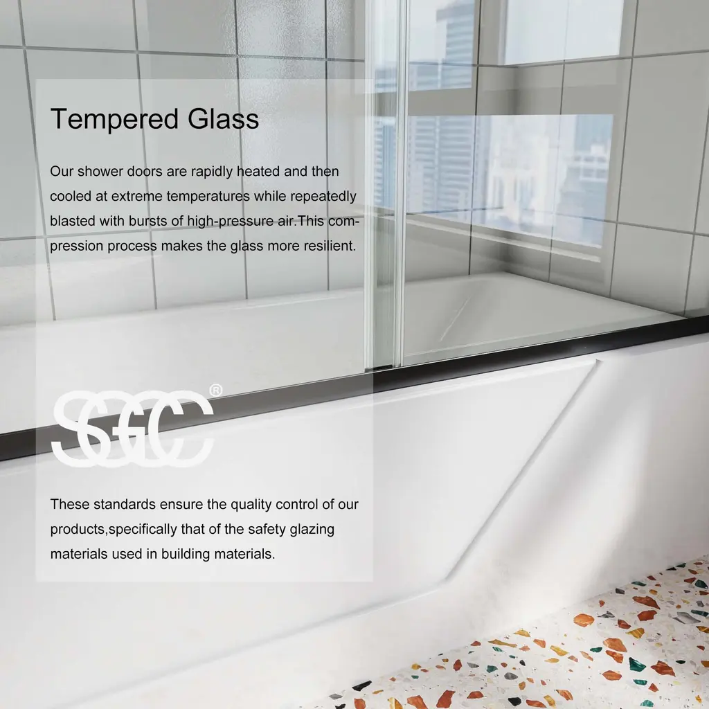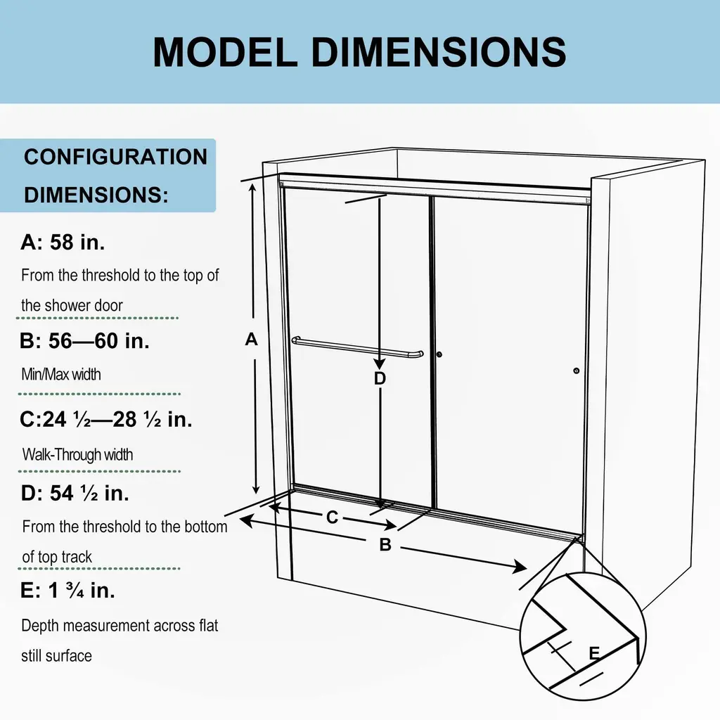【Product Features】 ★Installation Size: Min 56'' to Max 60'' Width x 58'' Height ★STANDARD GLASS: 1/4 in. (6 mm) certified tempered glass tub door ★SMOOTH GLIDE: Center track guide comes standard on all doors for smoother, quieter slide ★FIT: Requires opening width of 56 in. minimum to 60 in. maximum and 58 in. threshold to top of door; Offers walk-in width of 24-1/2 to 28-1/2 in. , 54-1/2 in. height threshold to the bottom of the top track 【Description】 [Bathtub Shower Door, 56-60 in. W x 58 in. H, Resistance Free Hinges] INSTALL NOTE: No stud required to install this sliding shower door; design allows for out-of-plumb conditions up to 3/8 in. CLEAR GLASS: Crystal-clear glass gives the most open and spacious feel SIMPLICITY HANDLES: Simple horizontal handle and two coordinating knobs, with a beautiful opening price point WHAT'S INCLUDED: All hardware and install instructions included TRACKS THAT LAST: Tracks crafted from anodized aluminum for strength and corrosion resistance FULL BYPASS: Sliding doors can be opened from left or right with full by-pass (both panels slide) GUARD AGAINST LEAKS: Inner glass panel should be installed on the same side as showerhead/control valve, all seals and sweeps must be installed as directed INSTALL TIP: Measure twice, cut once - top track and bottom track/dam strip must be cut according to measurements in manual for a proper installation 【This product is fragile, if there is any damage when you receive the goods, please take a photo and contact us, so that we can quickly verify and deal with you】 【Notes】 1.Size Notice:Manual measurement has been used, there may be some reasonable errort, thanks for your understanding. 2.Color Notice:Due to factors such as display equipment and shooting environment, the color of the item may be slightly different from the picture, which is a normal phenomenon, please refer to the actual item 3.Assembly Notice:Please read assemble manual in advance. Please do not over-tighten nuts, as this may cause distortion or breakage. 4.It is recommended to put a layer of foam or soft cushion on the floor when installing to avoid scratching the floor. 5.If the item has any defects, damage or missing parts, please contact us with pictures or videos so that we can understand your needs and help you quickly, and always remember to retain its original packaging to ensure any return requests. We will try our best to solve any problems you may have. 6.If you receive the wrong product, please attach the product picture, the infographic of the outer package and the picture containing SKUs, so that we can verify and quickly deal with it for you