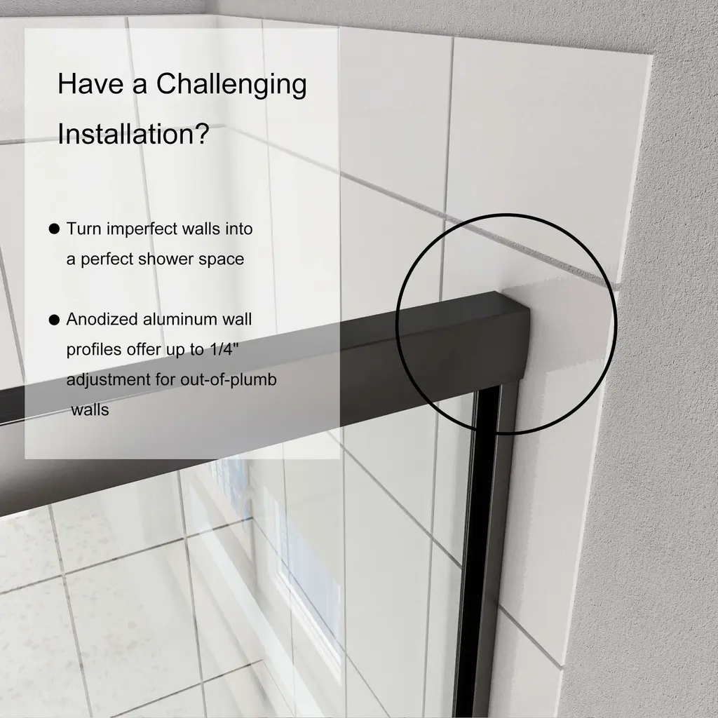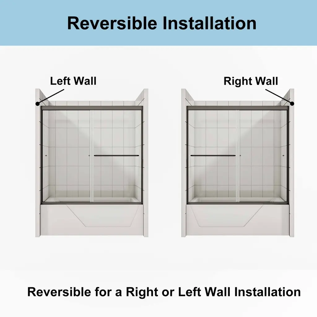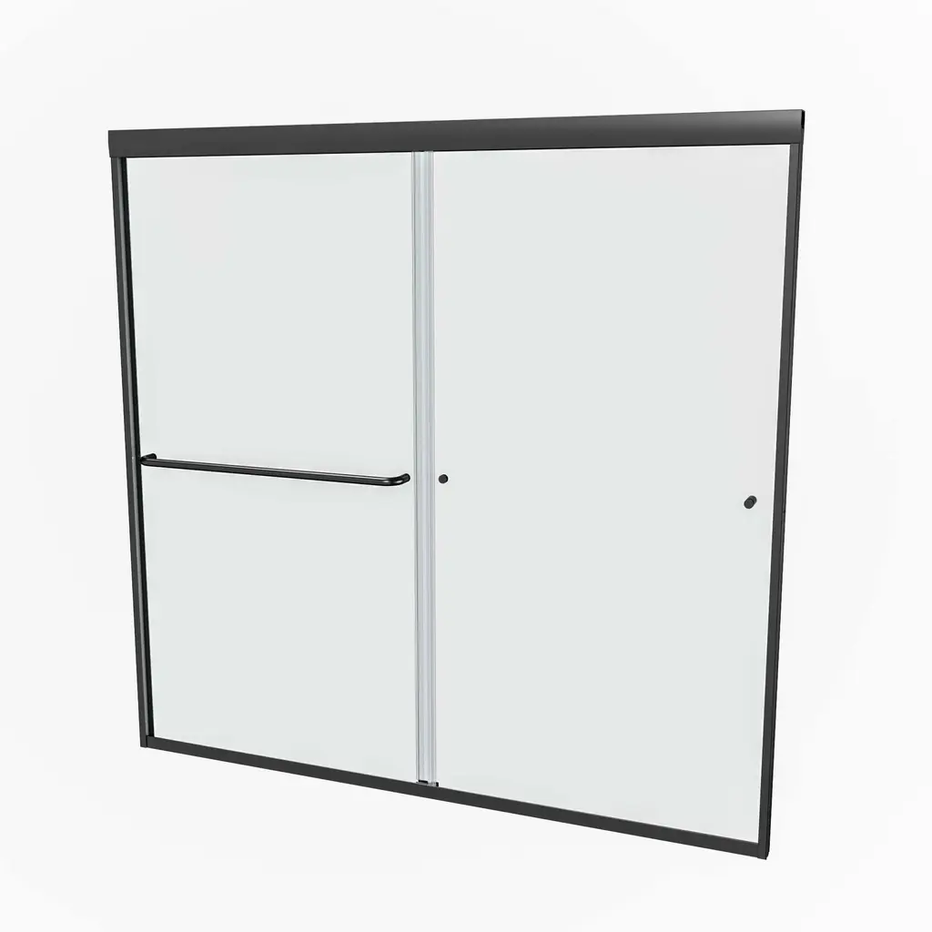 【Product Features】 ★Installation Size: Min 56'' to Max 60'' Width x 58'' Height ★STANDARD GLASS: 1/4 in. (6 mm) certified tempered glass tub door ★SMOOTH GLIDE: Center track guide comes standard on all doors for smoother, quieter slide ★FIT: Requires opening width of 56 in. minimum to 60 in. maximum and 58 in. threshold to top of door; Offers walk-in width of 24-1/2 to 28-1/2 in. , 54-1/2 in. height threshold to the bottom of the top track 【Description】 [Bathtub Shower Door, 56-60 in. W x 58 in. H, Resistance Free Hinges] INSTALL NOTE: No stud required to install this sliding shower door; design allows for out-of-plumb conditions up to 3/8 in. CLEAR GLASS: Crystal-clear glass gives the most open and spacious feel SIMPLICITY HANDLES: Simple horizontal handle and two coordinating knobs, with a beautiful opening price point WHAT'S INCLUDED: All hardware and install instructions included TRACKS THAT LAST: Tracks crafted from anodized aluminum for strength and corrosion resistance FULL BYPASS: Sliding doors can be opened from left or right with full by-pass (both panels slide) GUARD AGAINST LEAKS: Inner glass panel should be installed on the same side as showerhead/control valve, all seals and sweeps must be installed as directed INSTALL TIP: Measure twice, cut once - top track and bottom track/dam strip must be cut according to measurements in manual for a proper installation 【This product is fragile, if there is any damage when you receive the goods, please take a photo and contact us, so that we can quickly verify and deal with you】 【Notes】 1.Size Notice:Manual measurement has been used, there may be some reasonable errort, thanks for your understanding. 2.Color Notice:Due to factors such as display equipment and shooting environment, the color of the item may be slightly different from the picture, which is a normal phenomenon, please refer to the actual item 3.Assembly Notice:Please read assemble manual in advance. Please do not over-tighten nuts, as this may cause distortion or breakage. 4.It is recommended to put a layer of foam or soft cushion on the floor when installing to avoid scratching the floor. 5.If the item has any defects, damage or missing parts, please contact us with pictures or videos so that we can understand your needs and help you quickly, and always remember to retain its original packaging to ensure any return requests. We will try our best to solve any problems you may have. 6.If you receive the wrong product, please attach the product picture, the infographic of the outer package and the picture containing SKUs, so that we can verify and quickly deal with it for you