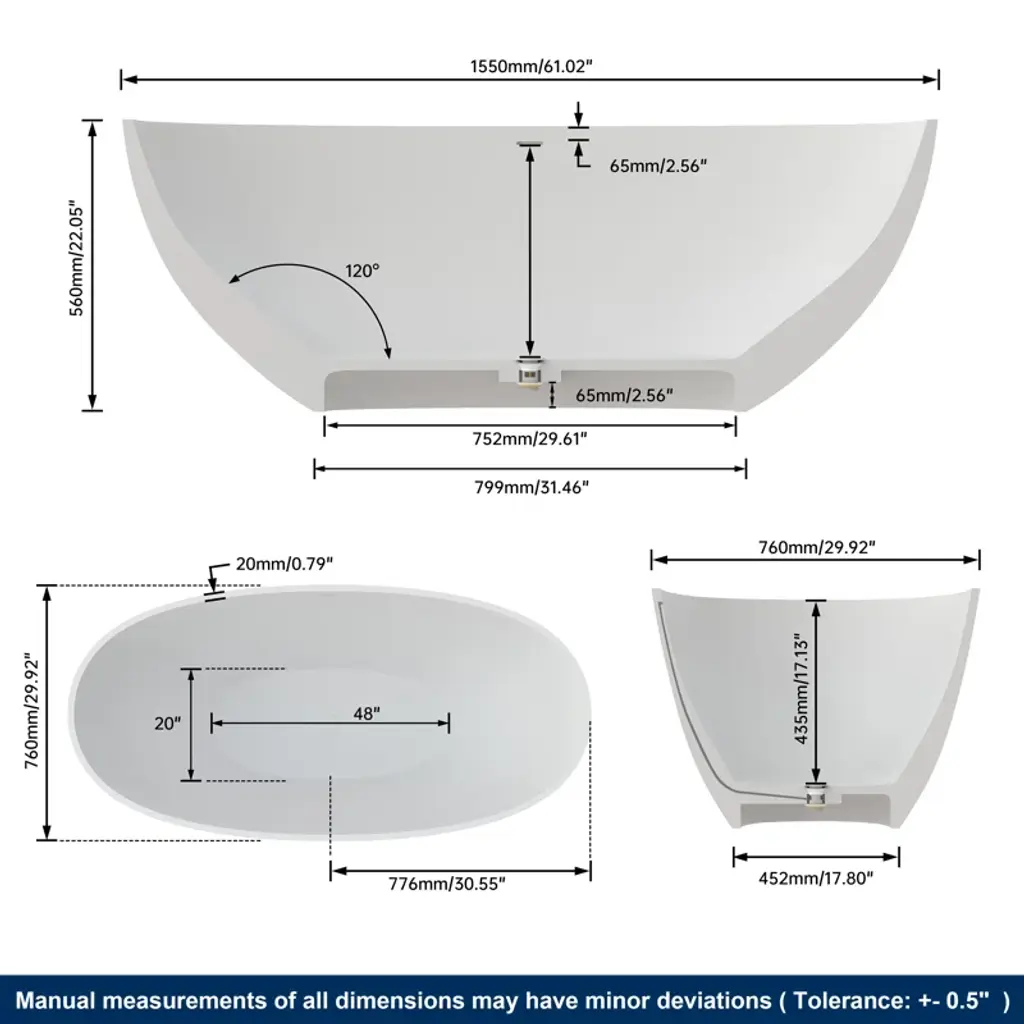 Crafted from 100% eco-friendly handmade Resin Stone, non-porous, 100% fade-resistant, natural stone feel,ensuring durability and strength while remaining non-poisonous. No worry about minor scratches or damage or stubborn stains thanks to its special repairable function. No-slip matte finish and a silky-smooth texture. Our tub conforms to the body's natural contours, Sloped lumbar support offers extra comfort, providing exceptional lumbar and head support for extended relaxation. Its excellent heat retention ensures a long, soothing soak, akin to being cocooned in luxury. Its corner-friendly design makes it ideal for both indoor and outdoor settings, Advanced lightweight pure white stone resin keeps bathwater warm and cozy, while durably resisting any scratches or staining. This freestanding tub is what bathing dreams are made of. Includes pop-up drainer, the bottom outlet is in the center, and the drain hose (not included in the price)