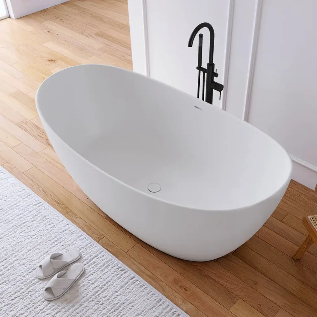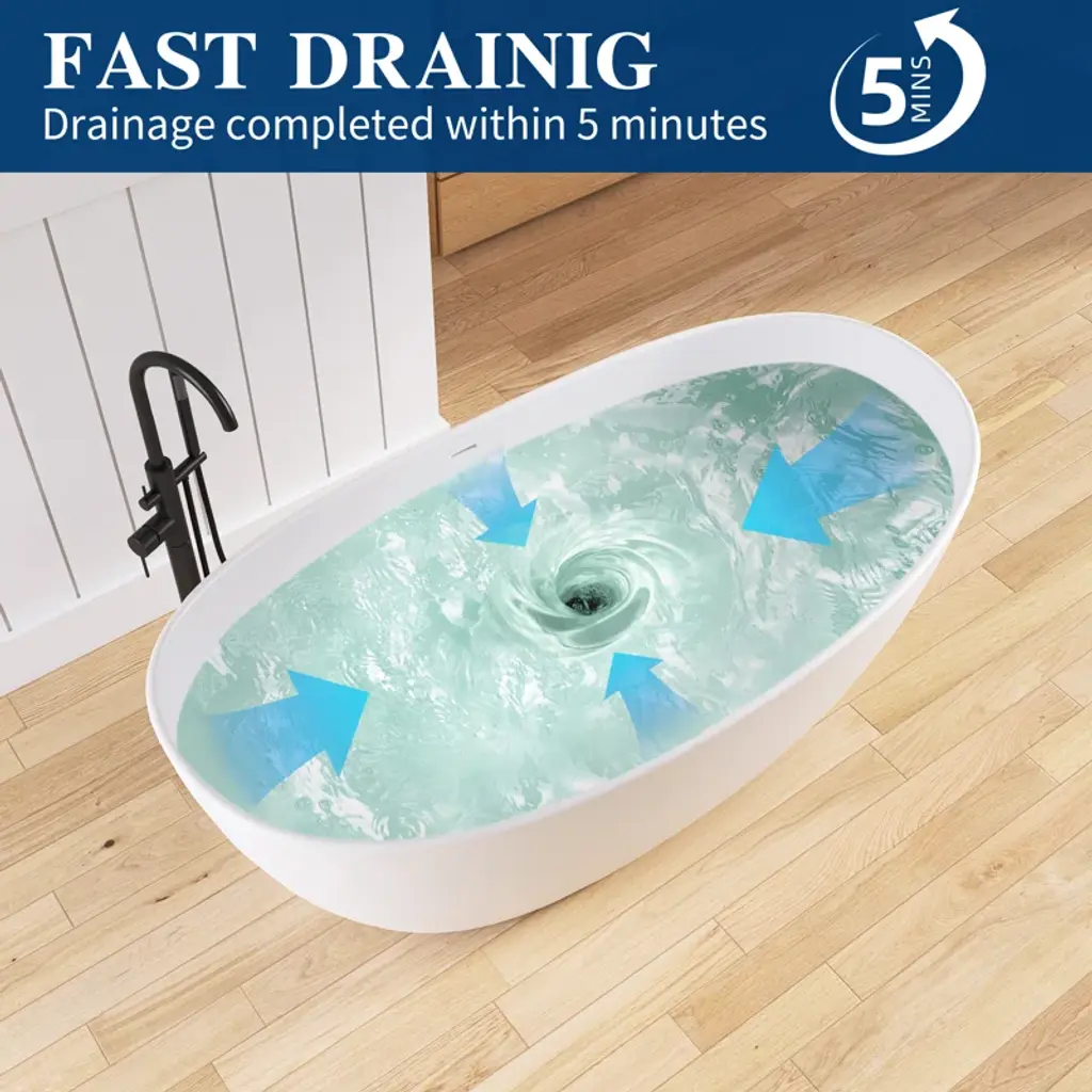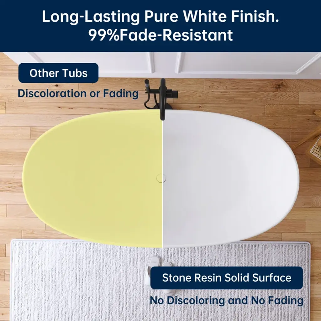 Crafted from 100% eco-friendly handmade Resin Stone, non-porous, 100% fade-resistant, natural stone feel,ensuring durability and strength while remaining non-poisonous. No worry about minor scratches or damage or stubborn stains thanks to its special repairable function. No-slip matte finish and a silky-smooth texture. Our tub conforms to the body's natural contours, Sloped lumbar support offers extra comfort, providing exceptional lumbar and head support for extended relaxation. Its excellent heat retention ensures a long, soothing soak, akin to being cocooned in luxury. Its corner-friendly design makes it ideal for both indoor and outdoor settings, Advanced lightweight pure white stone resin keeps bathwater warm and cozy, while durably resisting any scratches or staining. This freestanding tub is what bathing dreams are made of. Includes pop-up drainer, the bottom outlet is in the center, and the drain hose (not included in the price)
