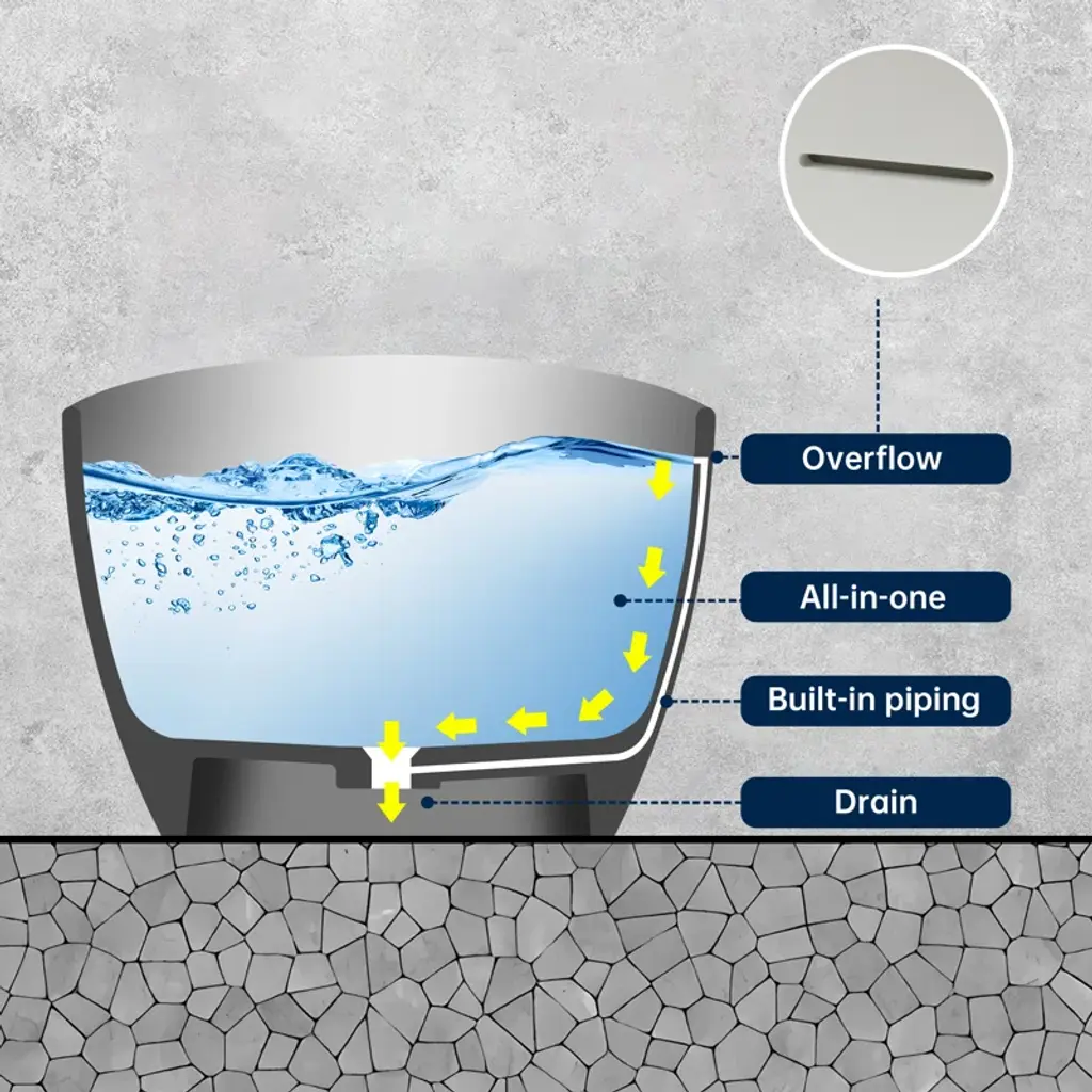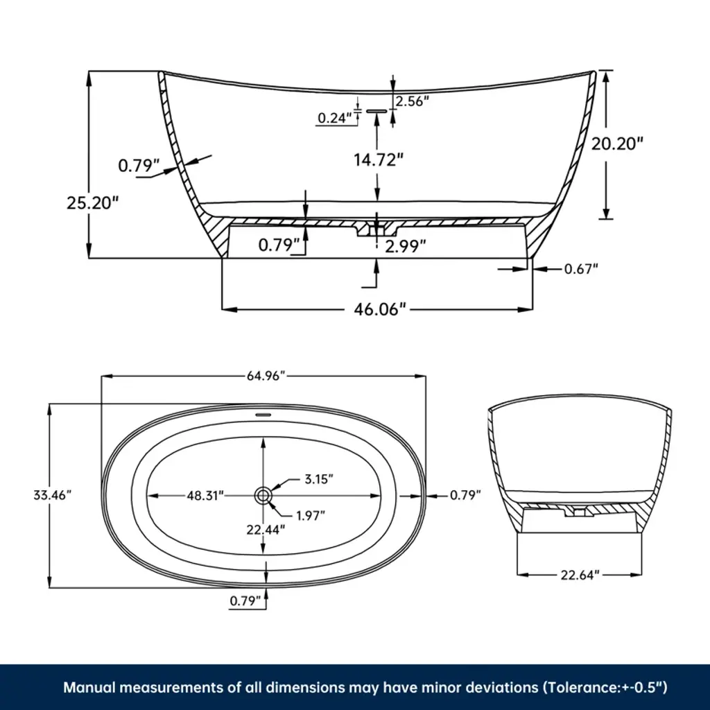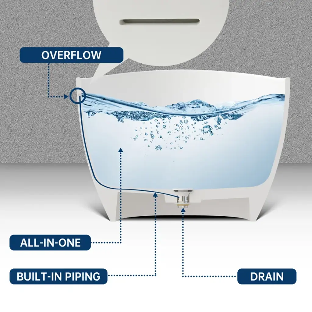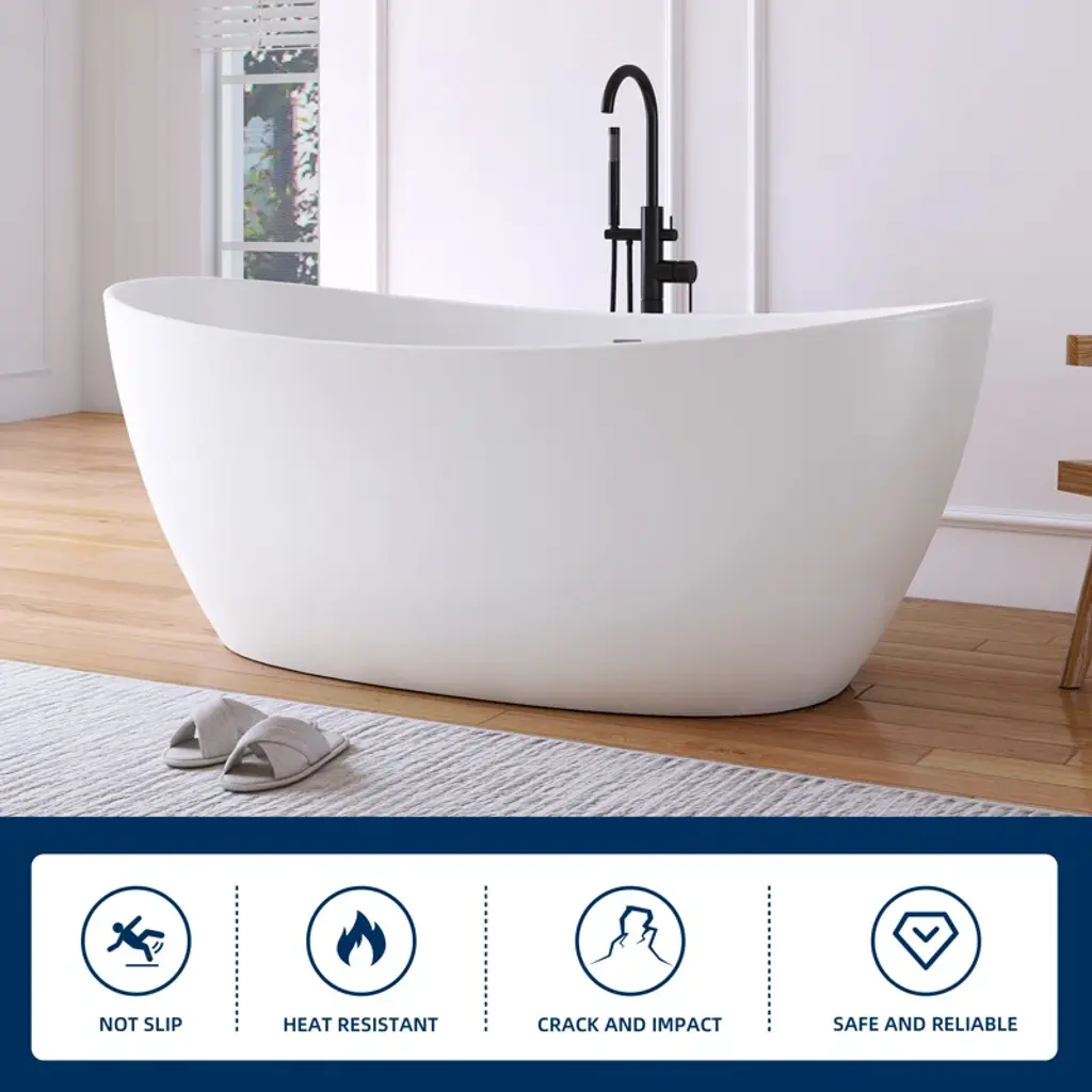 Crafted from 100% eco-friendly handmade Resin Stone, non-porous, 100% fade-resistant, natural stone feel,ensuring durability and strength while remaining non-poisonous. No worry about minor scratches or damage or stubborn stains thanks to its special repairable function. No-slip matte finish and a silky-smooth texture. Our tub conforms to the body's natural contours, Sloped lumbar support offers extra comfort, providing exceptional lumbar and head support for extended relaxation. Its excellent heat retention ensures a long, soothing soak, akin to being cocooned in luxury. Its corner-friendly design makes it ideal for both indoor and outdoor settings, Advanced lightweight pure white stone resin keeps bathwater warm and cozy, while durably resisting any scratches or staining. This freestanding tub is what bathing dreams are made of. Includes pop-up drainer, the bottom outlet is in the center, and the drain hose (not included in the price)