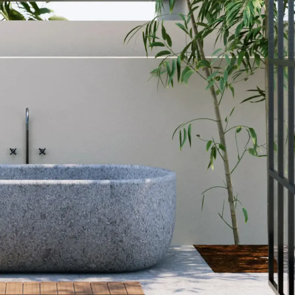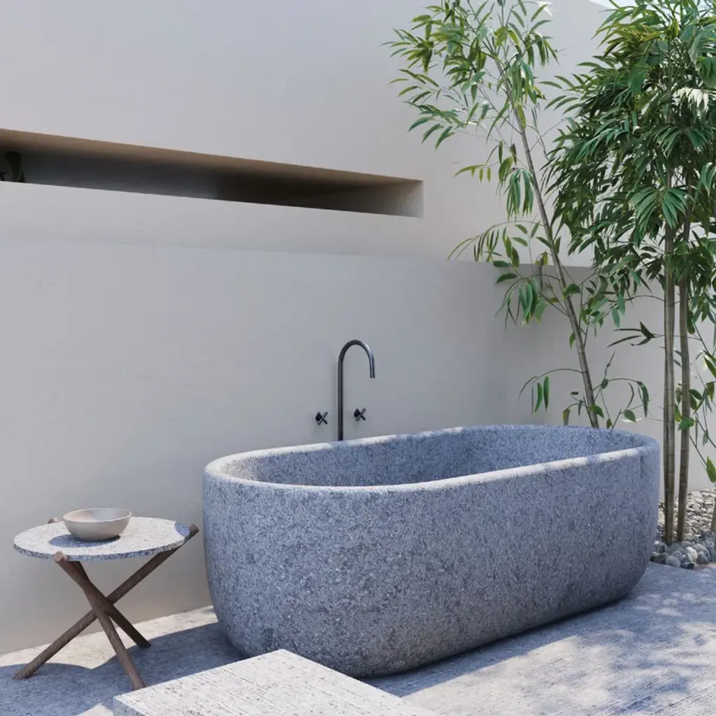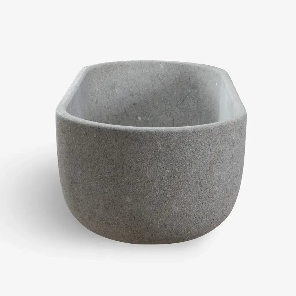 Crafted entirely in peperino, Aqua embodies a concept of the bathroom that redefines its fundamental aspects, offering an iconic piece both original and contemporary. If water symbolizes purity and life in the collective imagination, the Aqua bathtub expresses its entire value by translating it into an architectural code that blends creative exploration and practicality into a timeless furnishing element. This bathtub features a comfortable and spacious base, ensuring a sensation of maximum comfort with every use. Aqua's irresistible style is the result of an elegant series of influences that combine shape and material, distilling its outcome between past and future, design and nature, solids and voids defined by a surface never identical to itself.Monolithic tub in natural stone with rounded edges, with stone thickness decreasing from the base to the upper edge by 5 cm. Material: Peperino, smooth natural stone treated with stain and water-resistant products. Cutting and shaping processes done using CNC workstation.