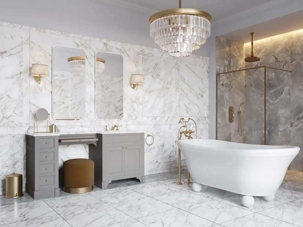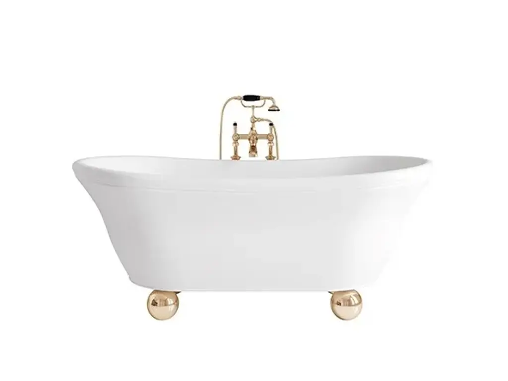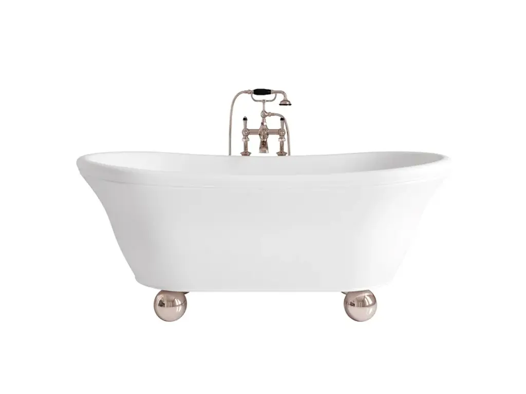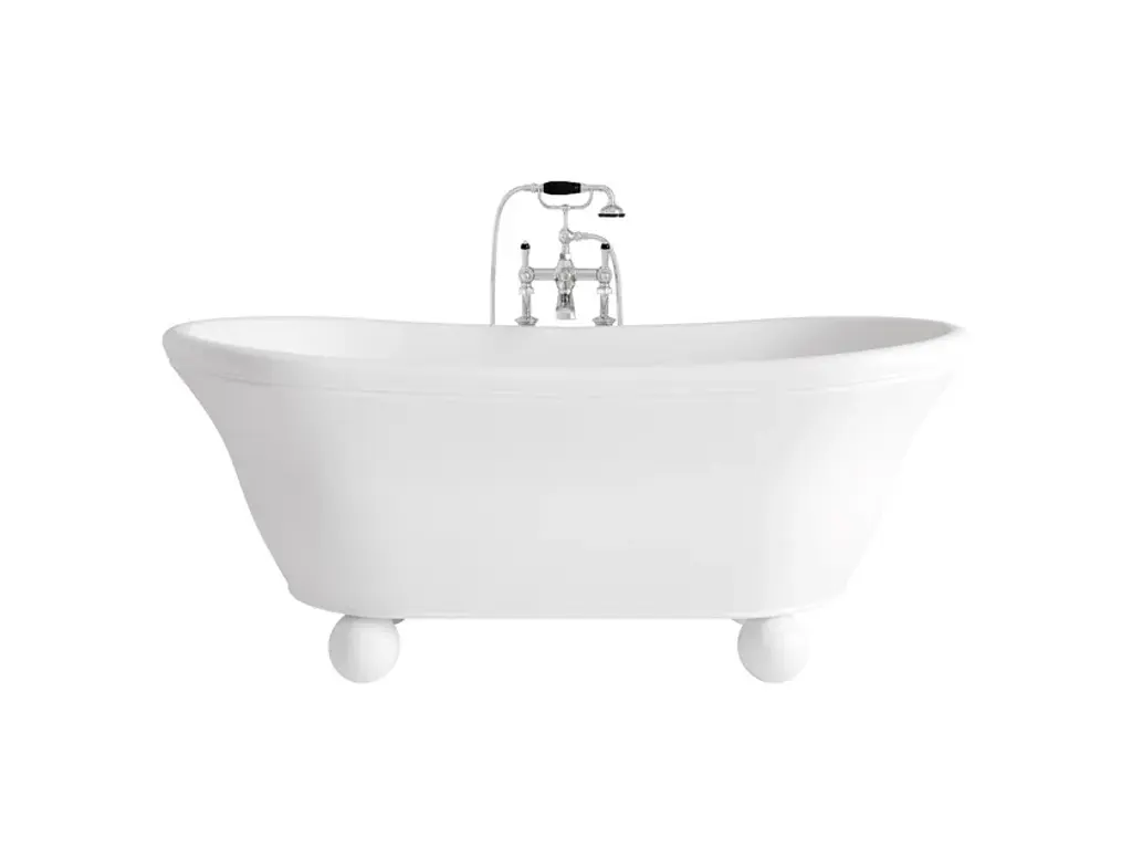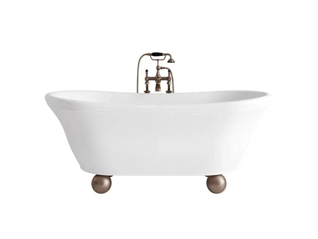 A stylish jewel of 19th century inspiration in an exquisite version of the iconic Aurora bathtub. The perfectly smooth body is shaped by elegant mouldings and stands on four spheres, available in white acrylic or in aluminium with a chrome, light gold, polished nickel or antique copper finish. Aurora Bijoux White is made with 100% White Tec Plus, a Greenguard Gold certified sustainable material that uses Biobased® plant-derived resins. Titanium dioxide is added to the compound of this innovative mix, its well-known photocatalytic property enabling an antibacterial and antiviral action that results in healthier environments. 100% made in Italy.