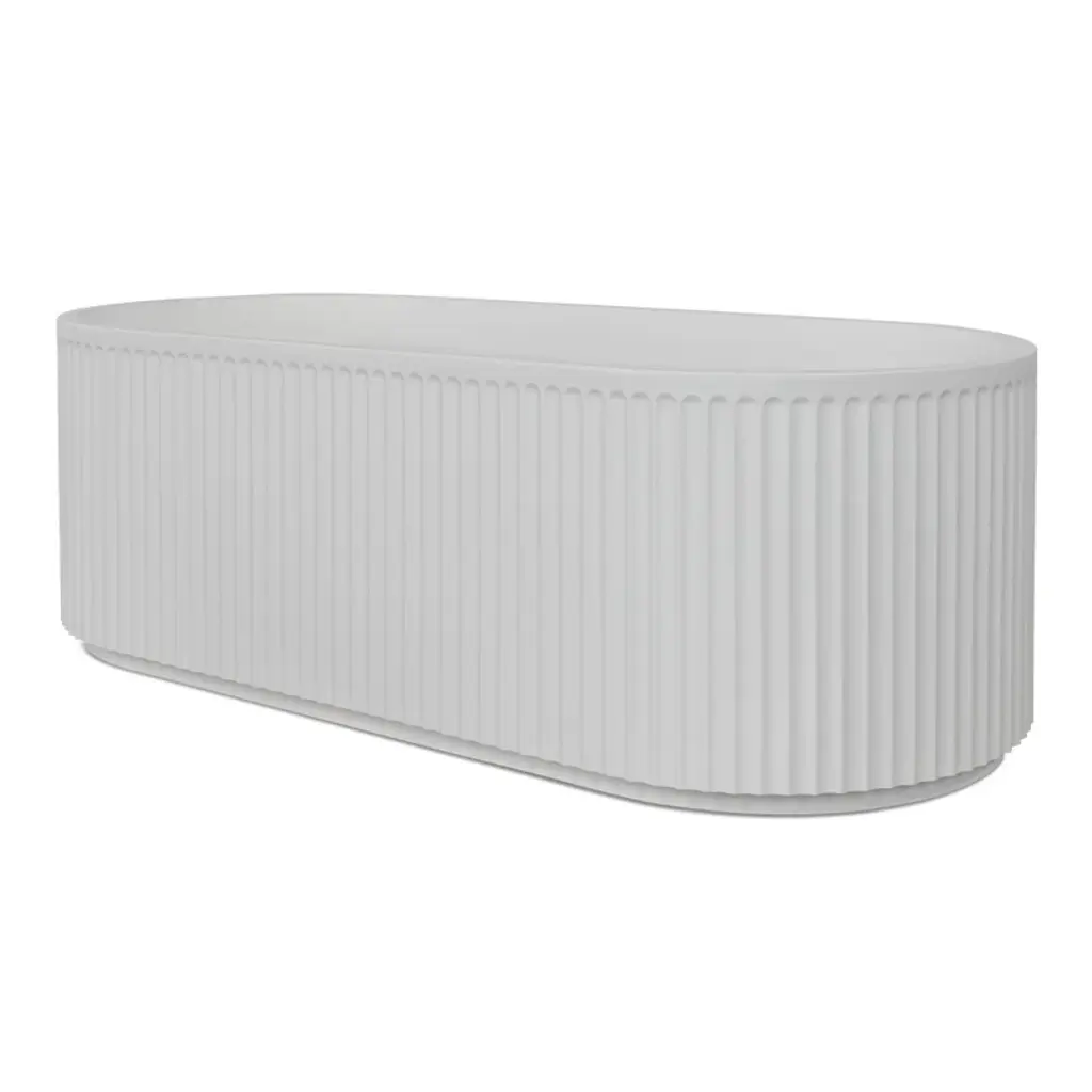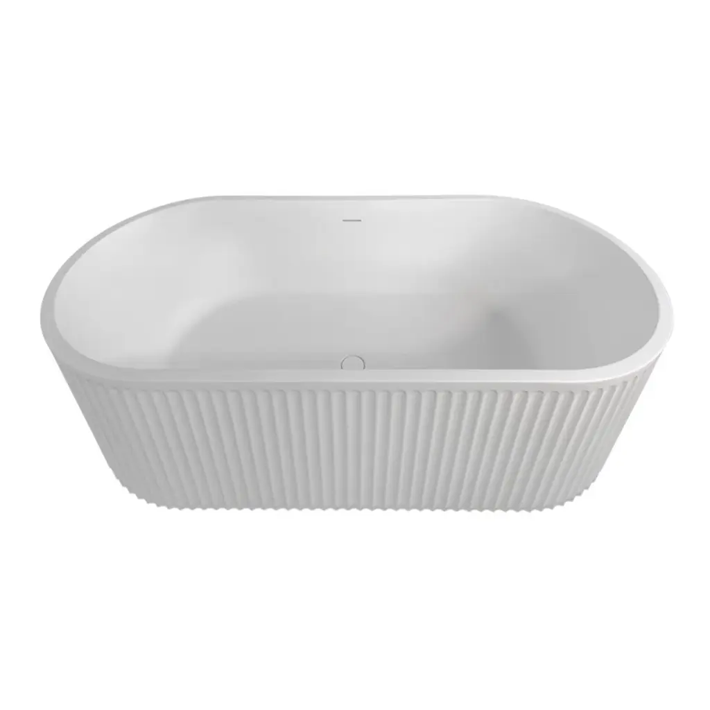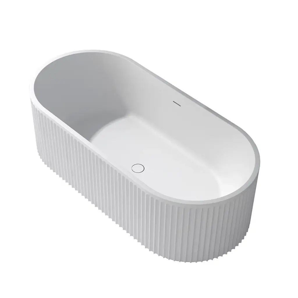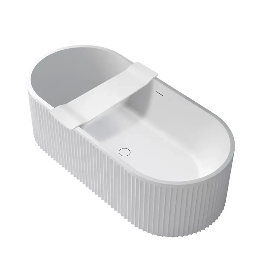 This oval soaking tub, crafted from sleek solid surface material, boasts a modern touch with its captivating fluted design. Sink into pure comfort and unwind as the integrated overflow prevents spills.