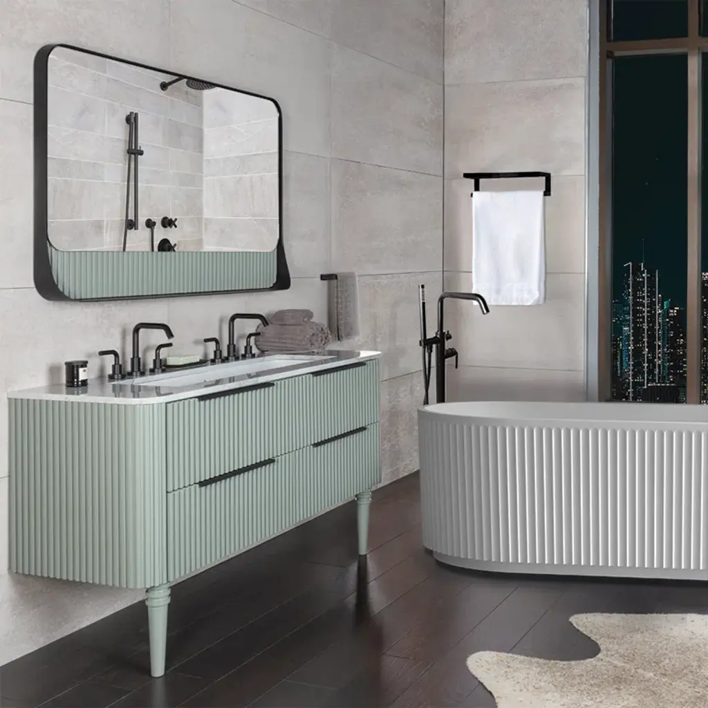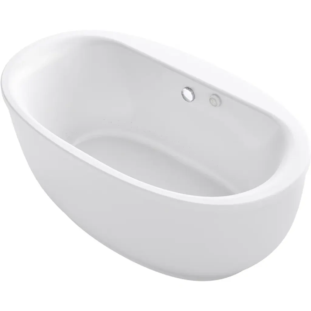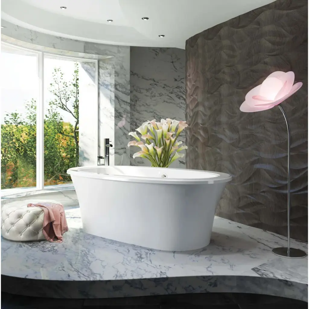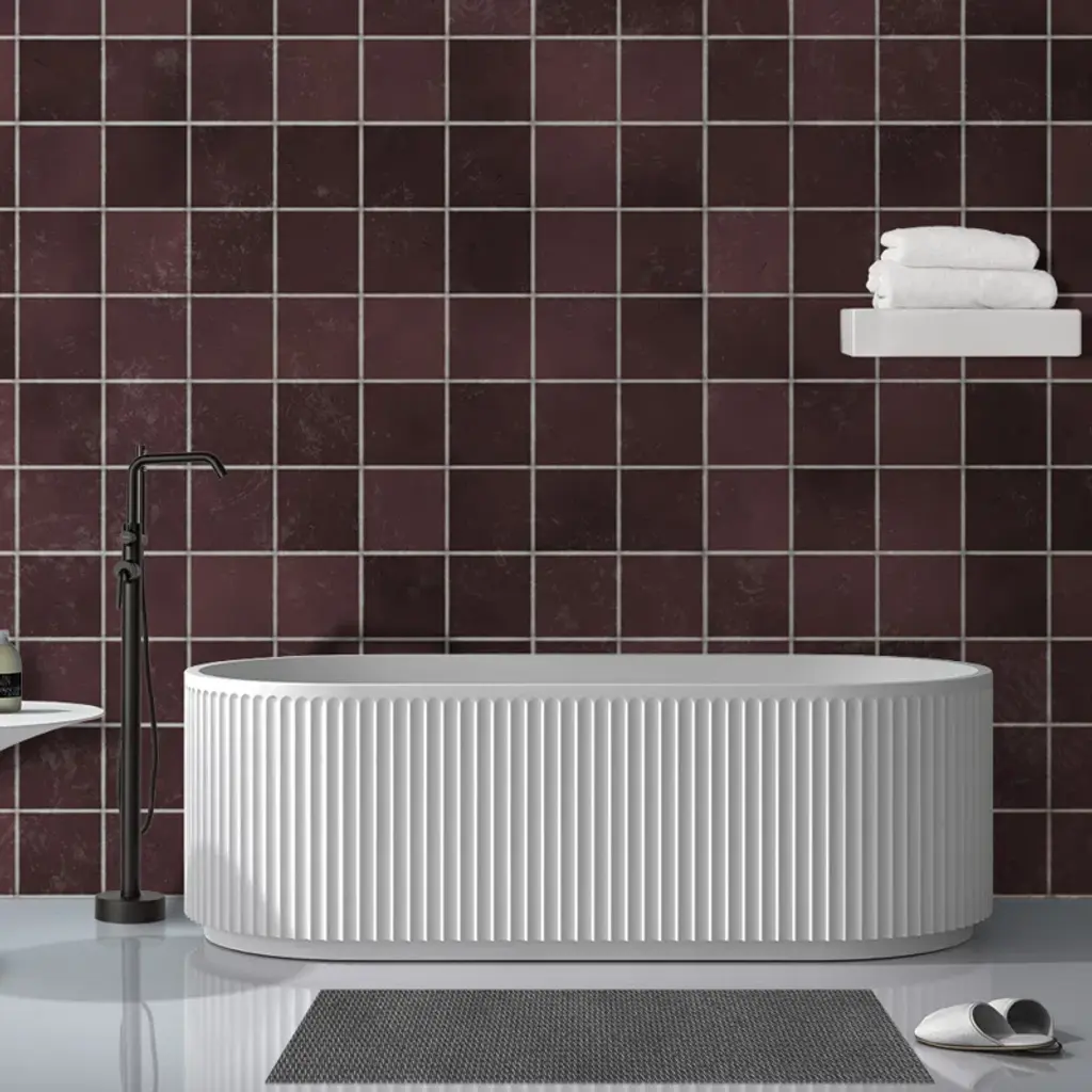 This oval soaking tub, crafted from sleek solid surface material, boasts a modern touch with its captivating fluted design. Sink into pure comfort and unwind as the integrated overflow prevents spills.