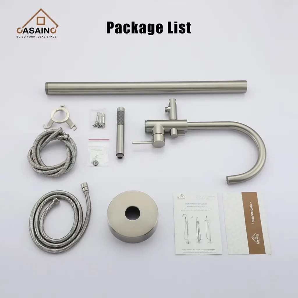 Elevate your bathroom with the CASAINC Floor Mounted Clawfoot Tub Faucet, designed to complement traditional and transitional spaces with modern functionality. This freestanding tub filler features a handheld shower wand, 360° swivel spout, and a high-performance ceramic cartridge for lasting reliability. Crafted from premium solid brass and finished in corrosion-resistant brushed nickel, this faucet offers both style and strength. The drip-free ceramic disc cartridge includes a built-in sediment filter and high-temperature-resistant seals, helping extend product life while delivering smooth, leak-free operation for over 500,000 cycles. The detachable hand shower gives you added control for rinsing hair, cleaning the tub, or washing children and pets. When not in use, it docks neatly and securely. Installation is simplified with a stable tripod base and included expansion bolts, making this faucet ideal for renovations, freestanding tubs, and new construction projects.