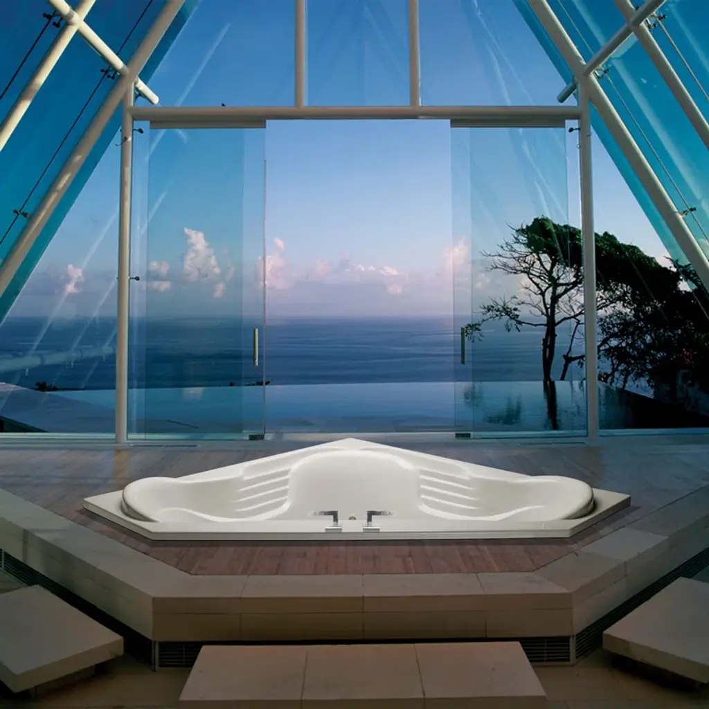 Soothing waterfall sounds and sensations in this spacious corner bath for two.
