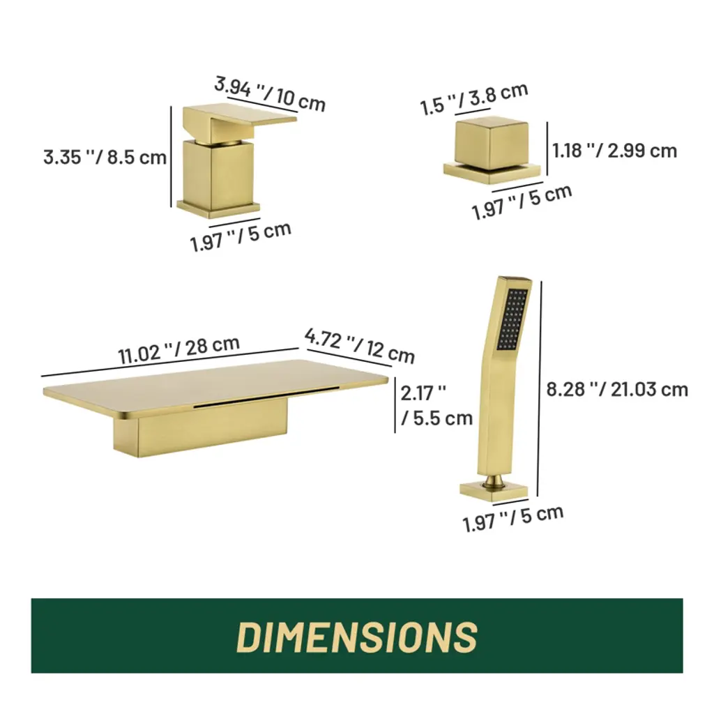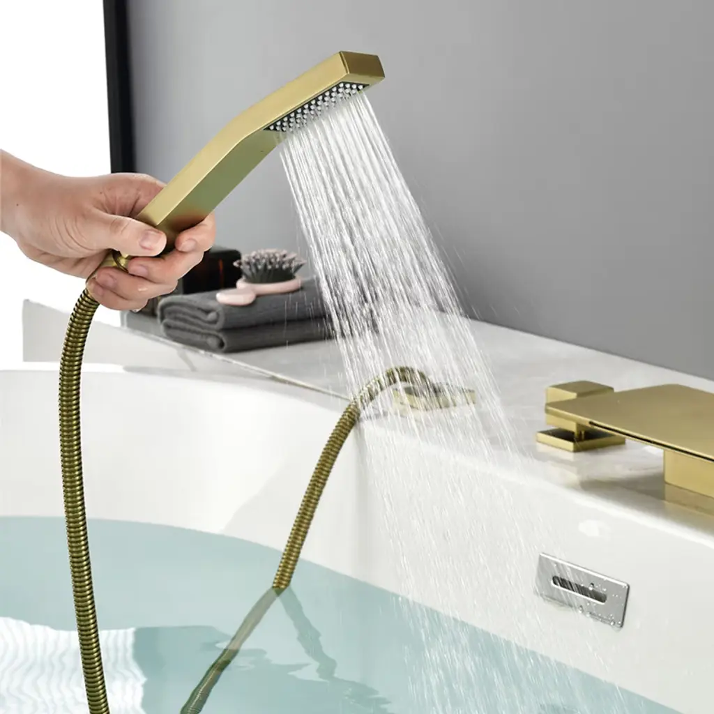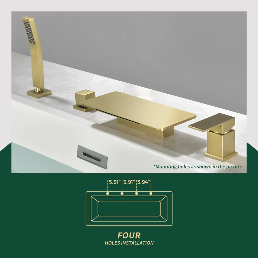 This bathtub faucet is made of high-quality brass and stainless steel, and the overall design is elegant and stylish.Its material characteristics make the product has a good anti-corrosion ability and durability, can extend the service life of the product.Simple and generous modeling design, so that it can be coordinated with a variety of styles of bathroom fixtures and decorations, to adapt to most of the bathtub bathroom environment, to ensure practical functionality at the same time, but also take into account the visual aesthetics. The bathtub shower faucet set comes with a handheld shower, bathtub faucet and 5 hoses.The bathtub faucet is designed with an 11.02-inch wide waterfall spout. The wide waterfall spout fills the bathtub quickly and provides a clear and steady laminar flow of water to enhance the bathing experience.The hand shower comes with a 59-inch hose with gravity ball, and the longer hose length effectively extends the shower's range of motion.At the same time, when the shower is finished, the gravity ball guides the hose back into place with its own gravity, keeping your bathroom clean and tidy, and providing you with a convenient and efficient experience. This shower faucet set adopts simple single-lever control, which is intuitive and convenient to operate, and can easily realize the water flow adjustment.In addition, it is also equipped with a diverter knob, which can be switched between the bathtub faucet and the handheld shower with a simple turn.Whether you are immersed in the gentle embrace of the bathtub or enjoying the pleasure of the hand shower, it is easy to realize, creating a highly efficient and comfortable bathing environment for you, so that your body and mind can get the ultimate relaxation under the caress of the water. This product adopts 4-hole installation method, reasonable layout is convenient for daily shower use. We have a professional after-sales team, ready to provide you with support to ensure peace of mind and worry-free use.