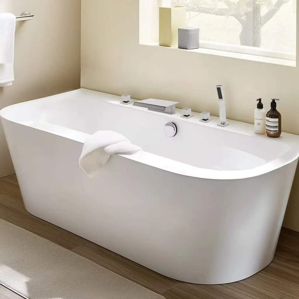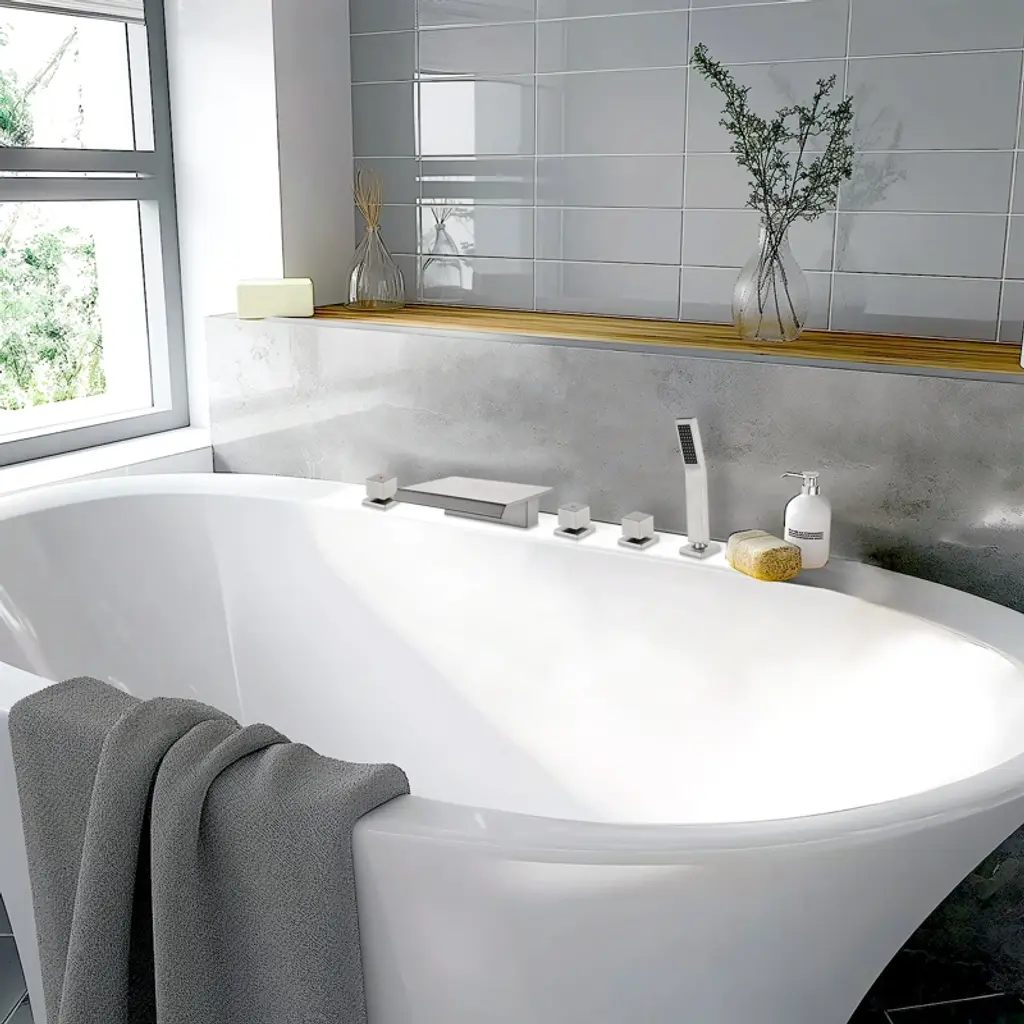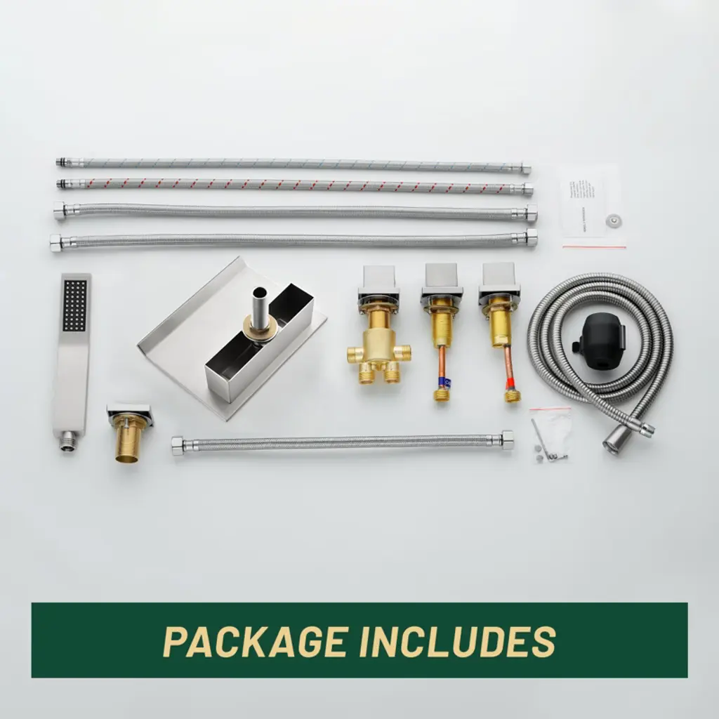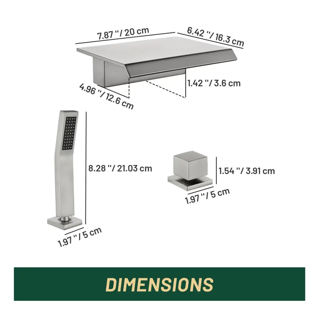 This bathtub faucet is mainly made of copper and SUS304 stainless steel, which has good corrosion resistance and durability, and can prolong the service life of the product.At the same time, the product presents a simple and fashionable design style, and its classic shape design makes it adaptable to most bathroom spaces with bathtubs, and its smooth lines complement common bathroom fixtures and decorative styles.While ensuring practical functionality, this combination of materials enhances durability and extends product life while adding a touch of elegance to the bathroom space, making it ideal for both value and function. The bathtub shower faucet comes complete with includes 2 switches and 1 diverter knob, 7.87-inch wide waterfall bathtub spout, hand shower and 6 hoses.The bathtub spout is designed with dual handles that allow you to easily adjust the hot and cold temperatures and water flow, easy to operate, not only providing you with a steady water flow experience, but also practical functions and comfort, able to meet a variety of bathing needs. The hand shower is equipped with a 59-inch hose with gravity ball, and the longer length of the hose effectively extends the shower's range of motion.At the same time, when the shower is finished, the gravity ball uses its own gravity to guide the hose to automatically retract and return to its place in an orderly fashion, keeping your bathroom clean and beautiful, and providing you with a convenient and efficient experience. The product is also equipped with a diverter knob, which can be switched between the bathtub faucet and the handheld shower with a simple turn.Whether you are immersed in the gentle embrace of the bathtub or enjoying the pleasure of the hand shower, it is easy to realize, creating a highly efficient and comfortable bathing environment for you, and letting your body and mind get the ultimate relaxation under the caress of the water. This product adopts 5-hole installation method, reasonable layout is convenient for daily shower use. We have a professional after-sales team ready to support you with a two-year warranty to ensure your peace of mind.