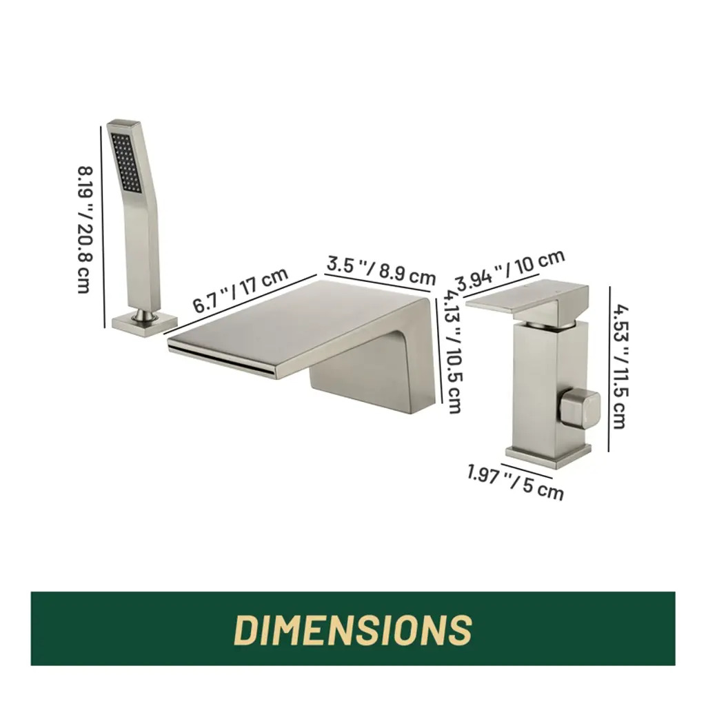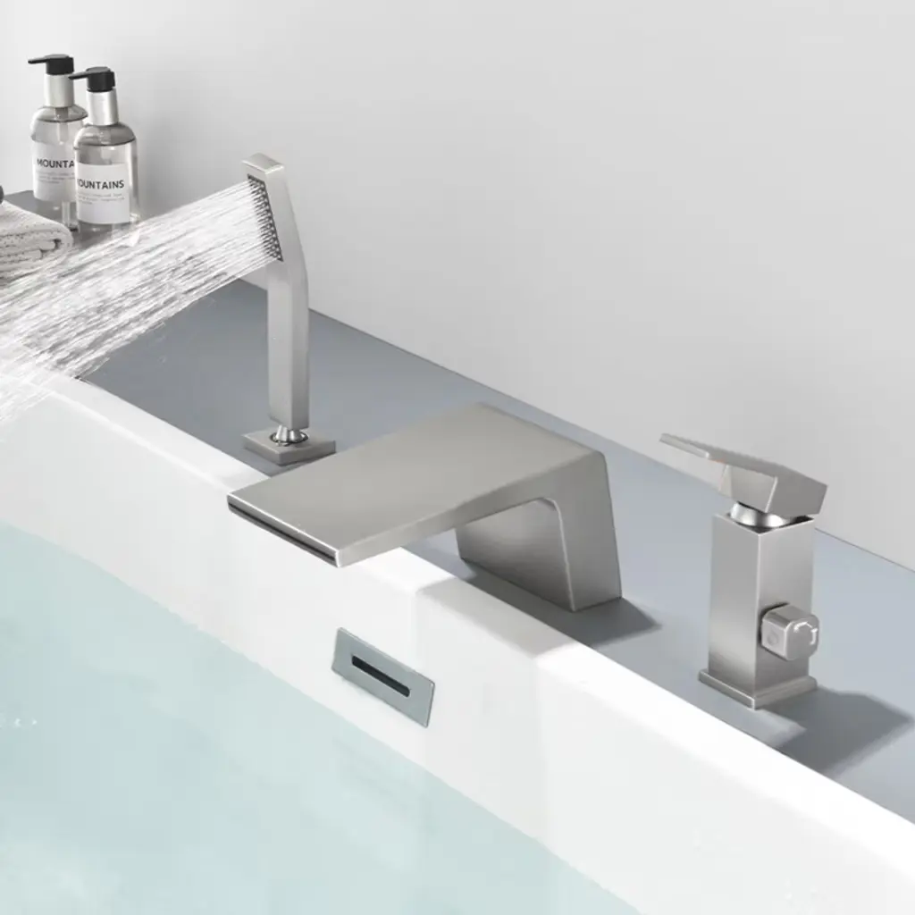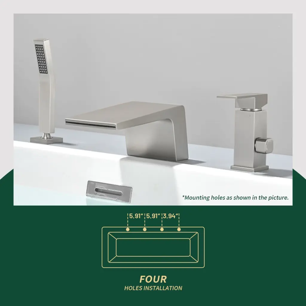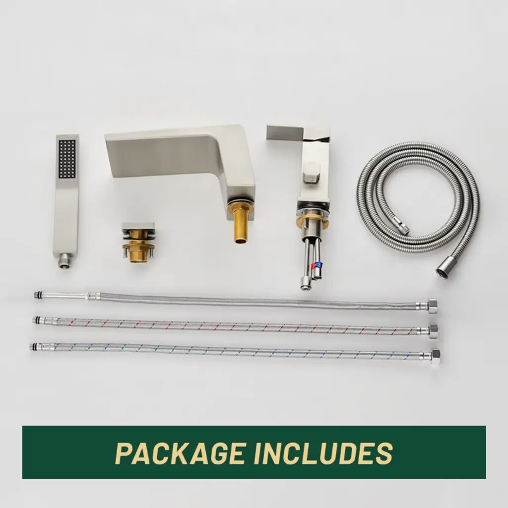 This bathtub faucet adopts an elegant and fashionable design style, which is able to adapt to a variety of bathroom environments with bathtubs, and naturally blends with common bathroom fixtures and decorative styles.At the same time, the product is mainly made of brass and stainless steel, with excellent characteristics of anti-rust corrosion and durability, which can prolong the service life of the product, combining beauty and practicality. The bathtub shower faucet set comes with a handheld shower, bathtub faucet and 4 hoses.The bathtub faucet is designed with a 3.5-inch wide waterfall spout with a neat waterfall-like action, providing you with a steady water flow experience.The hand shower comes with a 59-inch hose with gravity ball, and the longer hose length effectively extends the shower's range of motion.At the same time, when the shower is finished, the gravity ball guides the hose back into place with its own gravity, keeping your bathroom clean and tidy, and providing you with a convenient and efficient experience. This shower faucet set adopts simple single-lever control design, the operation is intuitive and convenient, users only need to through simple hand movements, can easily realize the precise adjustment of water flow.At the same time, the single-lever switch is cleverly equipped with a diverter knob.The knob is solidly installed and flexible in operation, and can be switched freely between the bathtub faucet and the hand shower by simply turning it, creating an efficient and comfortable bathing environment for you. This product adopts the 3-hole installation method, which is convenient for daily shower use. We have a professional after-sales team, ready to provide you with support to ensure peace of mind and worry-free use.