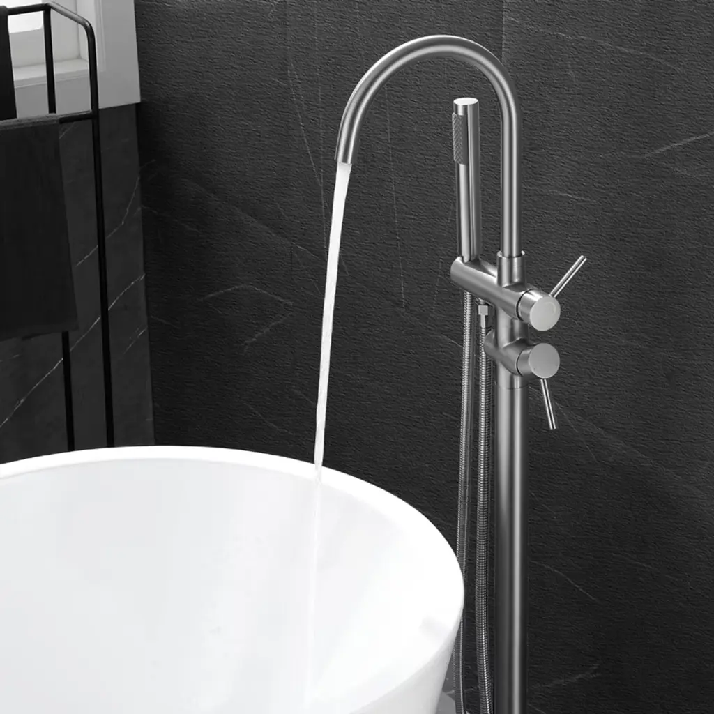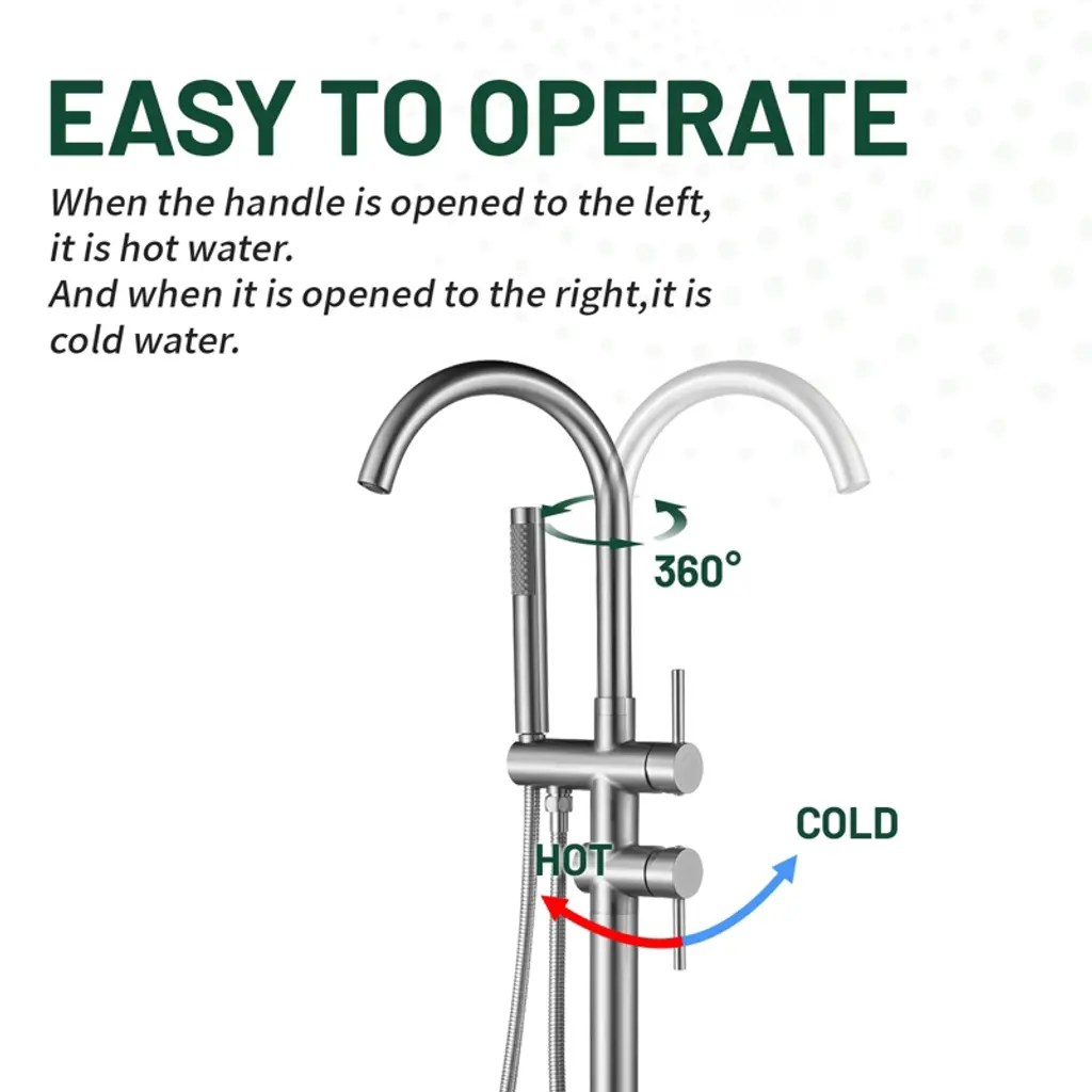This floor standing bathtub faucet is made of high quality materials, durable and stable performance, which can extend the product life.Meanwhile, the design is elegant, fashionable and beautiful, which can easily fit into different styles of bathrooms, and can bring fashion and functionality to your bathroom.