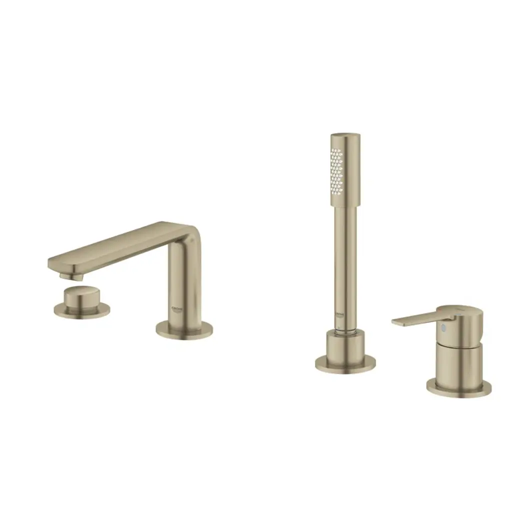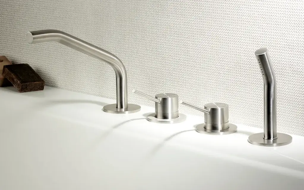 CORSIVO | Deck mounted bathtub set, 2 mixers, support and hand shower - stainless steel AISI 316 LAvailable finishes: Brushed stainless steel, Deep grey inox, ceraMINA colors.CORSIVO is a wall-mounted built-in set, mixer plus spout Ø21 L.190 H 180 – AISI 316 L stainless steel.FEATURES – BASIN TAPS: 2-hole, wall-mounted, basin mixer, with aerator. Available finishes: brushed stainless steel, polished stainless steel, deep grey PVD, gold PVD, ceraMINA colors.The slim spout, the straight aerator, the consistent inclination of the lines. Almost as if the tap leans towards the user to make its use more comfortable, especially in the built-in solutions. This is how Corsivo guides water toward the hands, in a complete collection where the fine detailing on the stainless steel underlines the product’s artisanal nature and enhances its surfaces. The collection is also available in the ceraMINA version: a palette of ceramic colors with pearly shades designed to match the perfect hue for every project. From pearl black to calm green, passing through sweet blue, light rose, rich brown, vivid orange, and golden yellow.