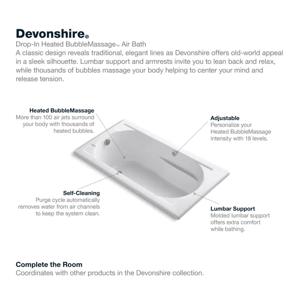 Devonshire captures the essence of old-world elegance with a striking combination of curves and design lines. The Devonshire whirlpool reveals an elegant, old-world style while delivering the modern comforts of hydrotherapy massage. With adjustable jets to keep your water warm, this bath is a haven for private relaxation.