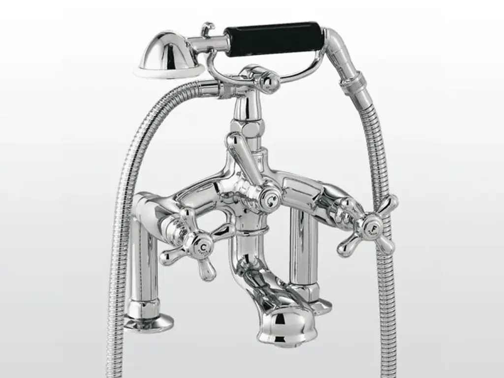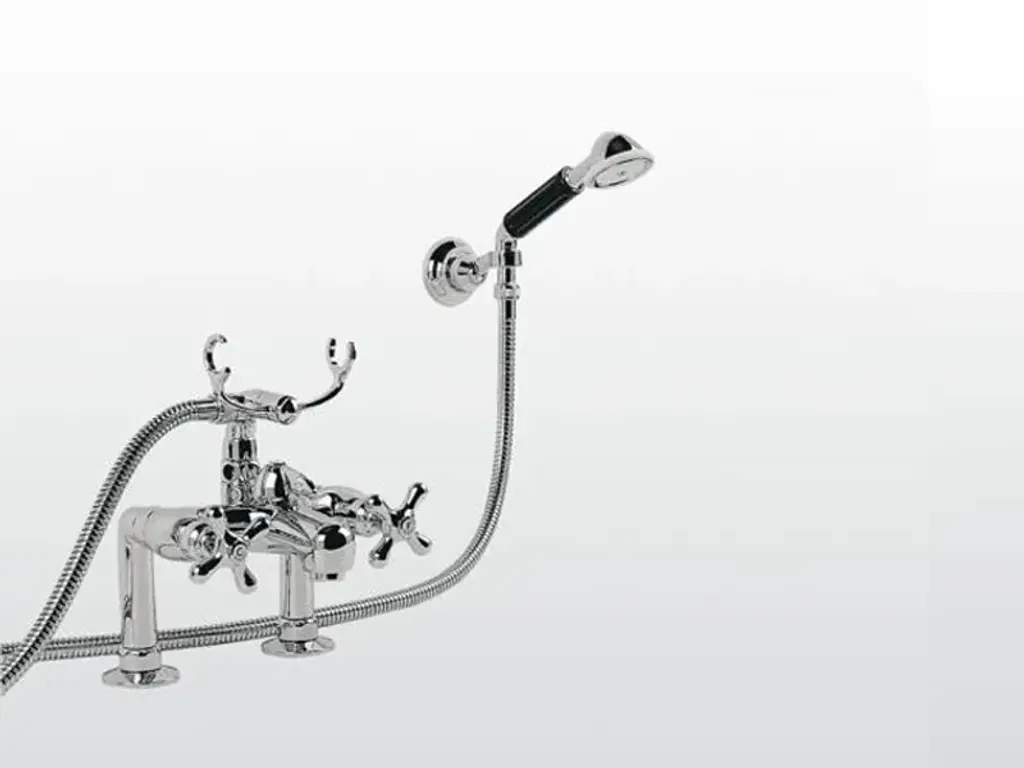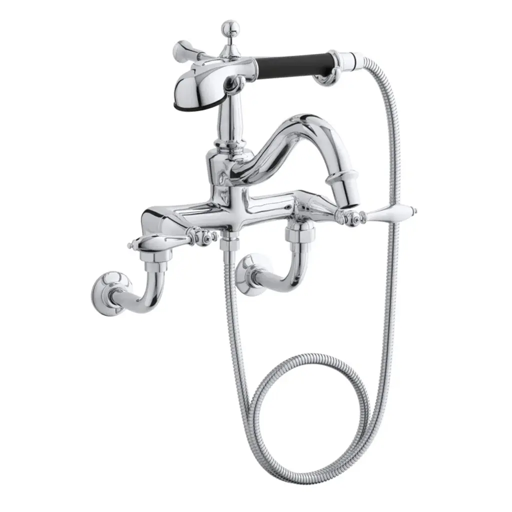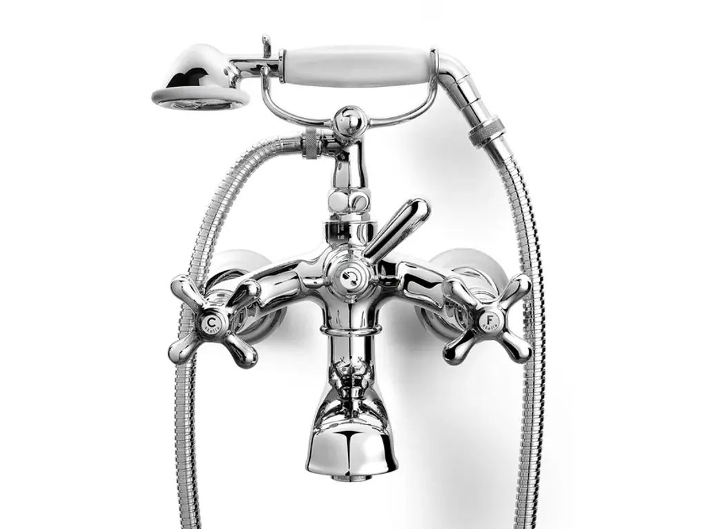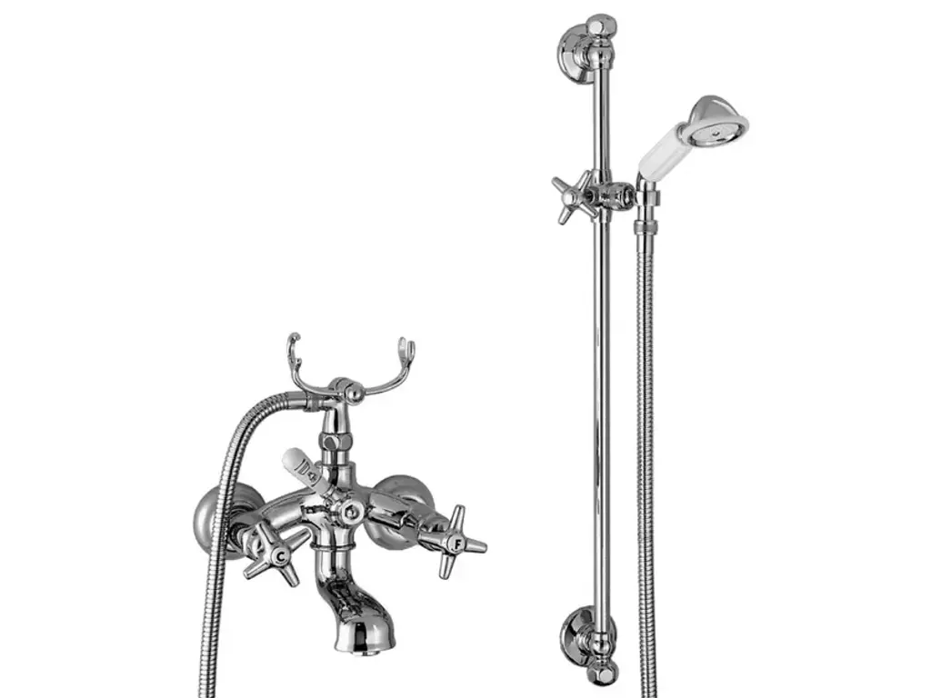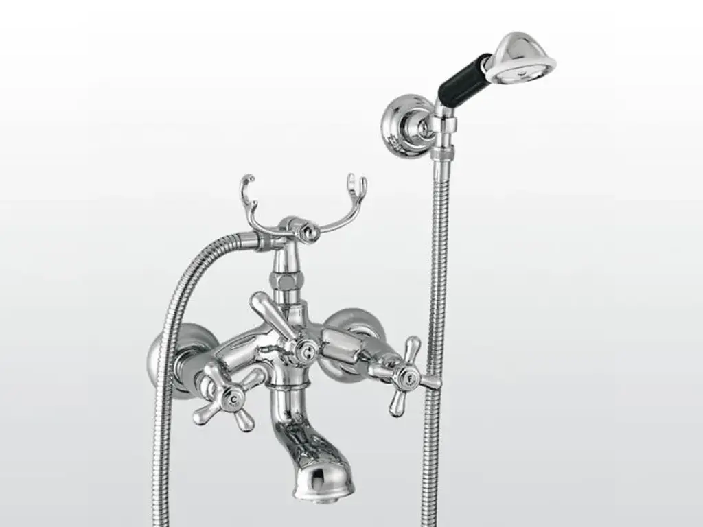 ECCELSA 3274/306 - Exposed wall mounted bath and shower mixer with hand spray head with low telephone-type cradle and 125 cm flexible shower hose. Hand spray head’s handle is made of fine Limoges porcelain.Rubinetterie Stella offers numerous possibilities for customizing its collections. In fact, each of the finishes, applicable to all the collections, has been designed to enhance the charm of the products.Chrome to accentuate the classicism, Bronze and Brass to enhance the retro tone, and Nickel, proposed in the Nickel PVD and Brushed nickel, for a modern retro effect with more sophisticated tones. The most precious galvanic finishes such as Silver and Gold or Rose Gold are created with a final carat of up to 23.5Kt, while PVD protections recently introduced are the extension of the whole range.PVD FinishPhysical Vapor Deposition, often abbreviated as PVD, is a method for coating all kinds of materials with a very strong adherence and high hardness, allowing chromatic variations - all similar to galvanic finishes - and with different aspects depending on the substrate to which they are applied.The decorative PVD treatment, used by Rubinetterie Stella, allows the deposition of a thin but very hard layer on the article to be coated to obtain a series of characteristics:- Abrasion resistance due to hardness (up to 1000/2500 HV) obtained on the treated surface- Inalterability to UV rays and resistance to solvents and corrosion- Coloring with great chromatic effect such as gilding, nickel plating, gunmetal black and many others- Wide range of surface finishes ranging from bright, satin polish to various shades of opacity- The PVD finish is hypoallergenicFinally, it is worth pointing out that the entire PVD process is harmless to the environment. The PVD process is safe, clean and sustainable, it is non-toxic and is even used for the treatment of medical instruments such as for scalpel blades, where sharpening and its duration are important, as well as for kitchen equipment, such as cutlery, trays and furnishing accessories intended for prolonged contact with people.