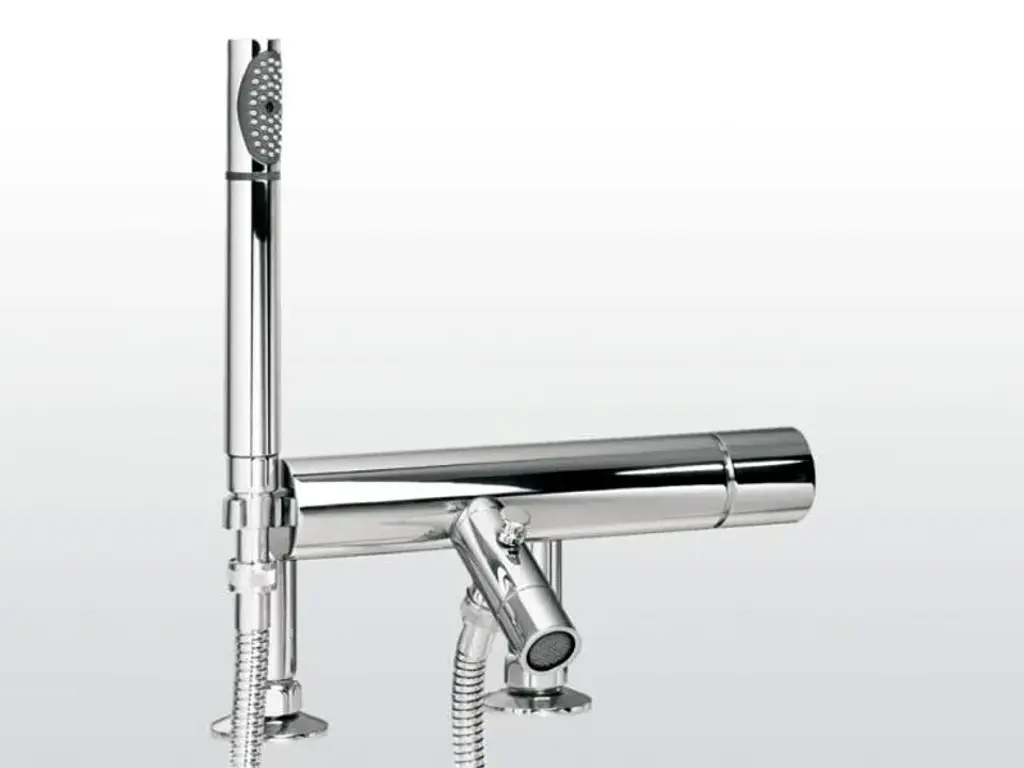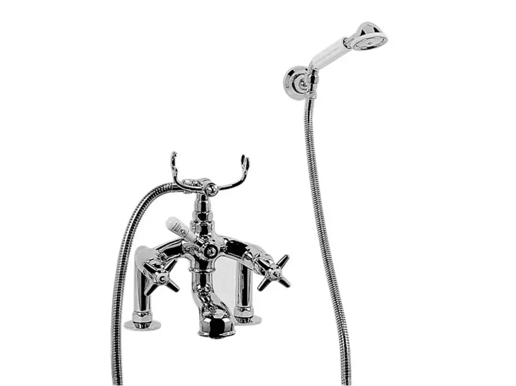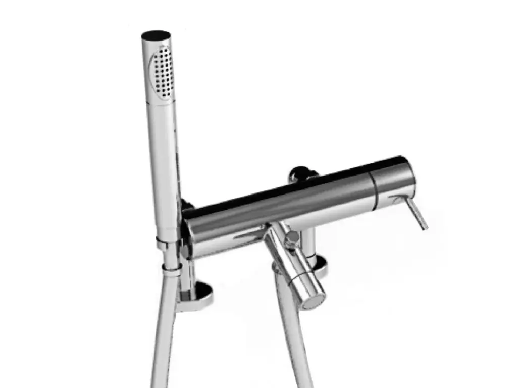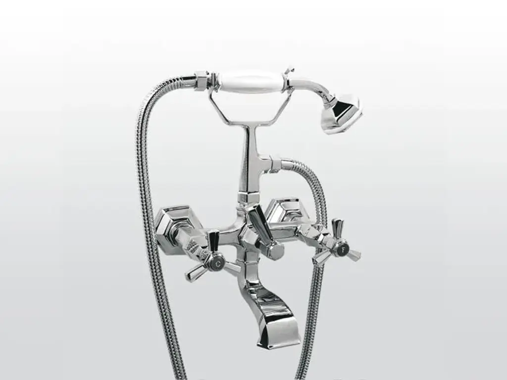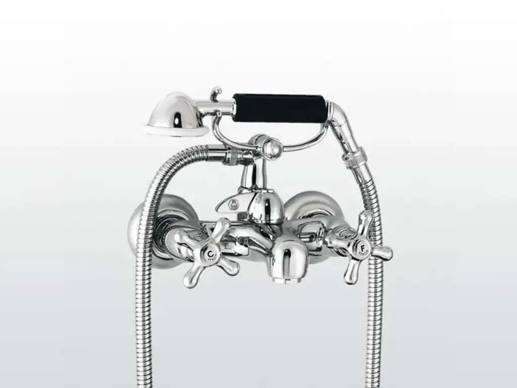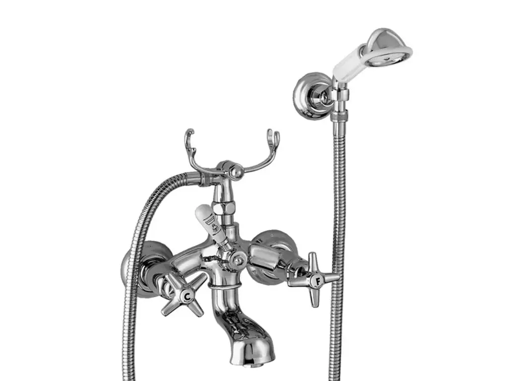 ECCELSA 3274/306FB - Exposed wall mounted bath and shower mixer with hand spray head with low bracket and 125 cm flexible shower hose Hand spray head’s handle is made of fine Limoges porcelain.Rubinetterie Stella offers numerous possibilities for customizing its collections. In fact, each of the finishes, applicable to all the collections, has been designed to enhance the charm of the products.Chrome to accentuate the classicism, Bronze and Brass to enhance the retro tone, and Nickel, proposed in the Nickel PVD and Brushed nickel, for a modern retro effect with more sophisticated tones. The most precious galvanic finishes such as Silver and Gold or Rose Gold are created with a final carat of up to 23.5Kt, while PVD protections recently introduced are the extension of the whole range.PVD FinishPhysical Vapor Deposition, often abbreviated as PVD, is a method for coating all kinds of materials with a very strong adherence and high hardness, allowing chromatic variations - all similar to galvanic finishes - and with different aspects depending on the substrate to which they are applied.The decorative PVD treatment, used by Rubinetterie Stella, allows the deposition of a thin but very hard layer on the article to be coated to obtain a series of characteristics:- Abrasion resistance due to hardness (up to 1000/2500 HV) obtained on the treated surface- Inalterability to UV rays and resistance to solvents and corrosion- Coloring with great chromatic effect such as gilding, nickel plating, gunmetal black and many others- Wide range of surface finishes ranging from bright, satin polish to various shades of opacity- The PVD finish is hypoallergenicFinally, it is worth pointing out that the entire PVD process is harmless to the environment. The PVD process is safe, clean and sustainable, it is non-toxic and is even used for the treatment of medical instruments such as for scalpel blades, where sharpening and its duration are important, as well as for kitchen equipment, such as cutlery, trays and furnishing accessories intended for prolonged contact with people.